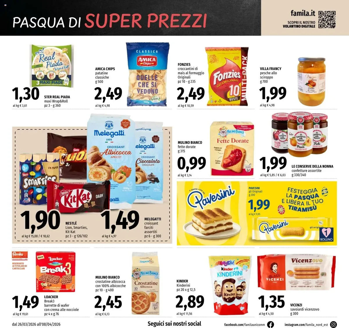 Preparati a celebrare la Pasqua con offerte imperdibili! Il nuovo Volantino Famila dal 26.03.2026 è finalmente arrivato, portando con sé lo "Speciale Pasqua da Giovedì Superstore". A partire dal 26 marzo, Famila ti aspetta con una selezione di prodotti pensati per rendere le tue festività ancora più dolci e convenienti. Non perderti l'MONTEVERGINE uovo di cioccolato al latte o fondente da 250g a soli 4,99 euro, o le uova Walcor Le Principesse/Dinosaur Park da 240g a 7,90 euro per i più piccoli. Per la tradizione, la LE BONTA' DEL PASTICCIERE colomba classica da 1kg è disponibile a 4,99 euro, mentre la versione incartata da 900g costa 5,89 euro.