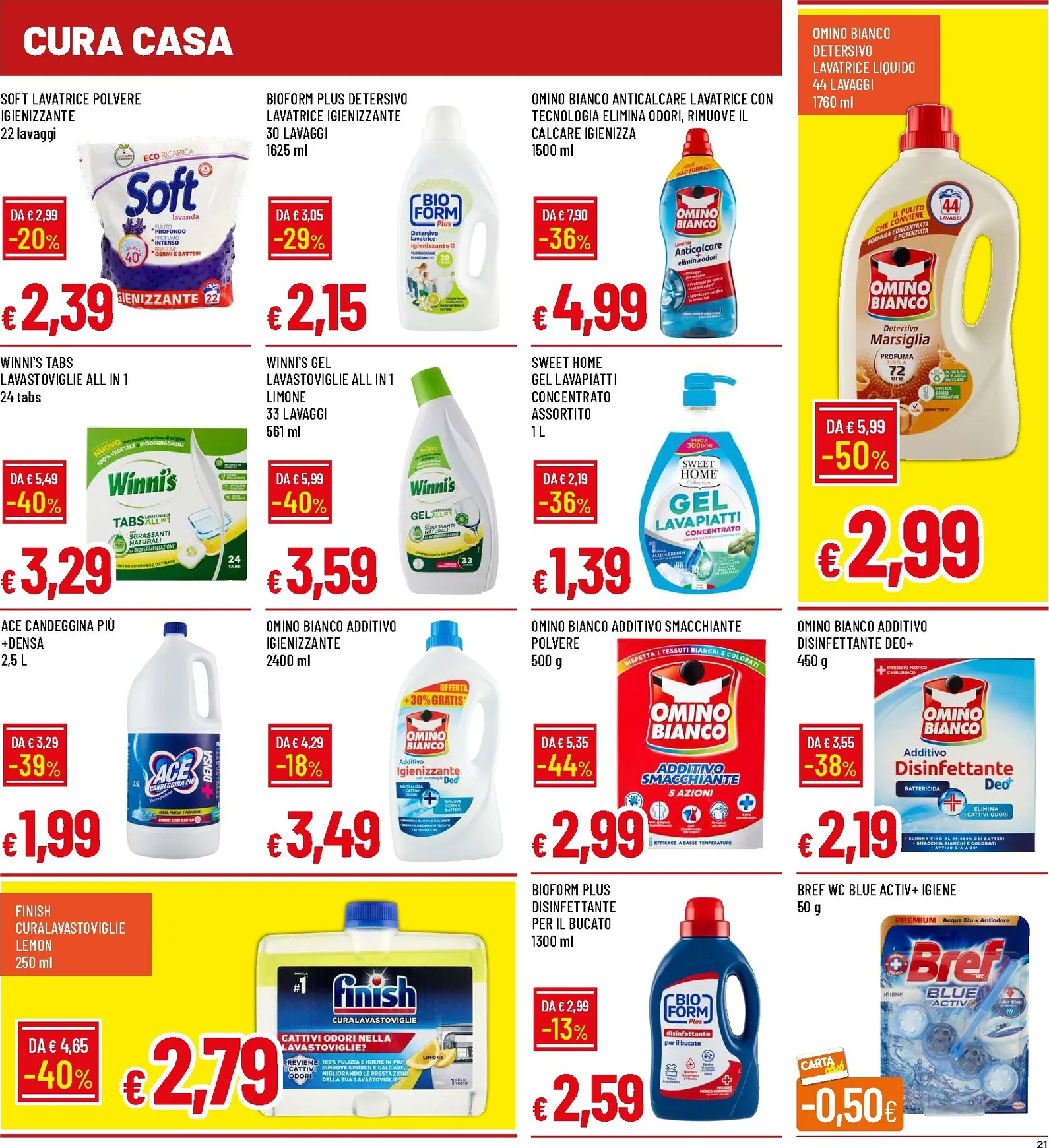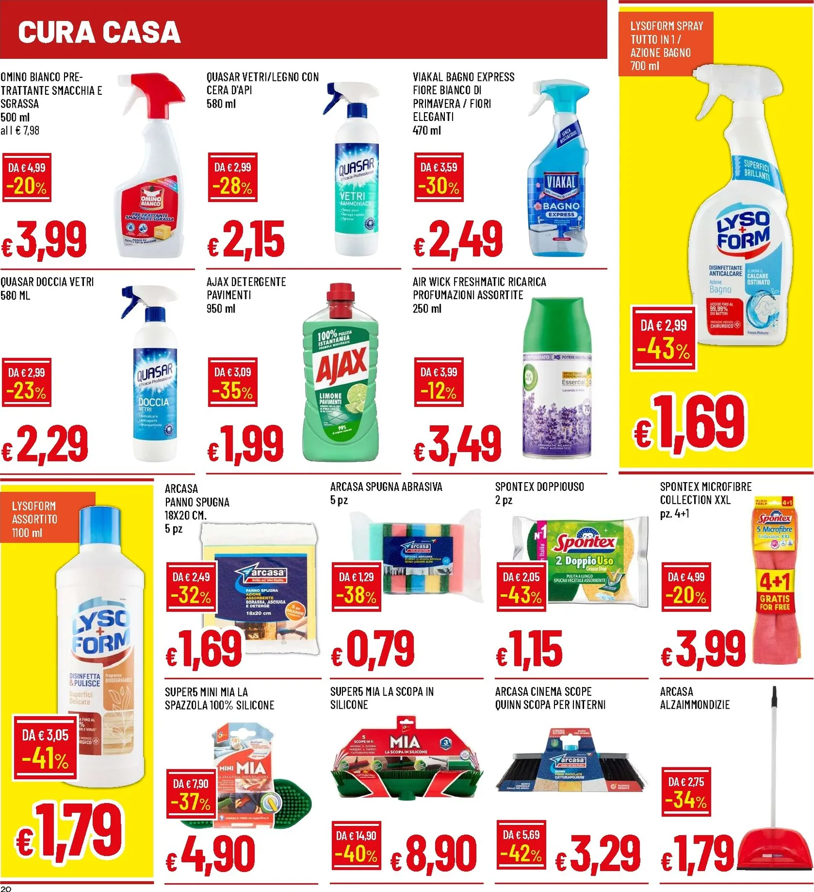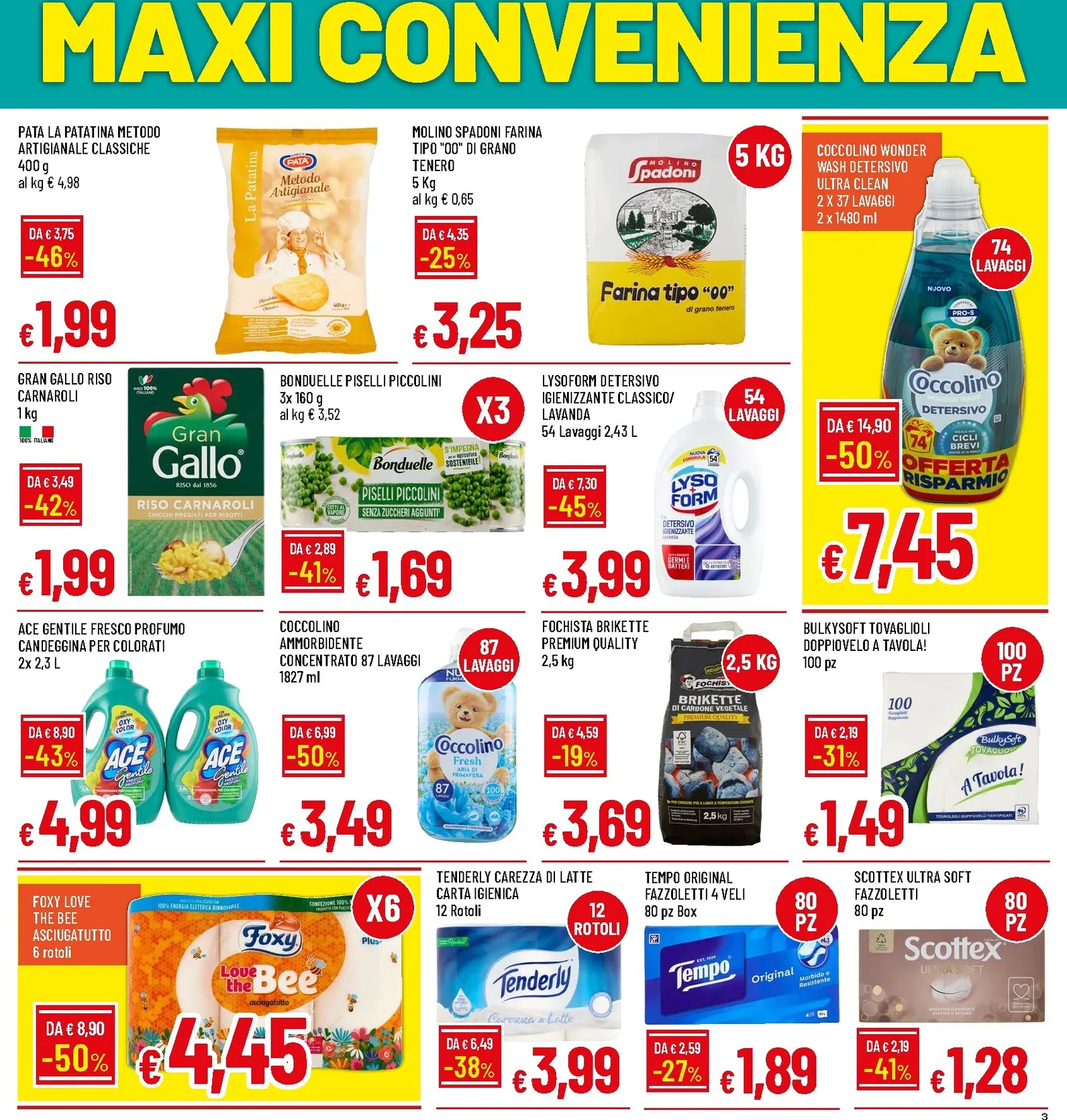 La convenienza si estende alla cura della casa. Il volantino include detersivi in formati extra large, come il Coccolino Wonder per lavatrice da 74 lavaggi, scontato del 50%, e l’ammorbidente concentrato da 87 lavaggi. In promozione anche l’Ace Gentile per colorati e il detersivo Lysoform. Per la dispensa, la Farina Spadoni “00” da 5 kg e il Riso Carnaroli Gran Gallo rappresentano ottime occasioni per fare scorta di prodotti a lunga conservazione a prezzi vantaggiosi.