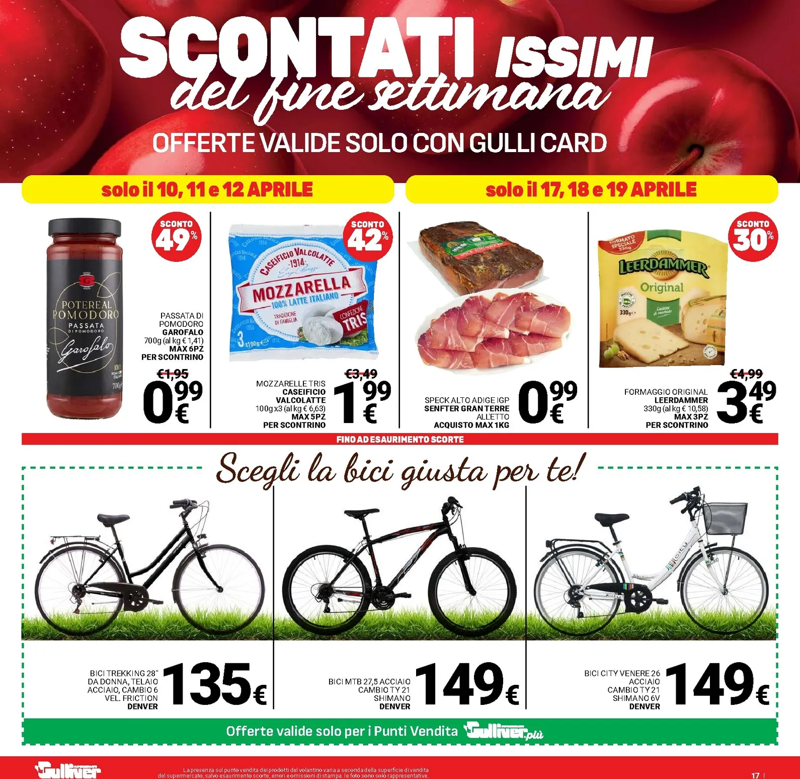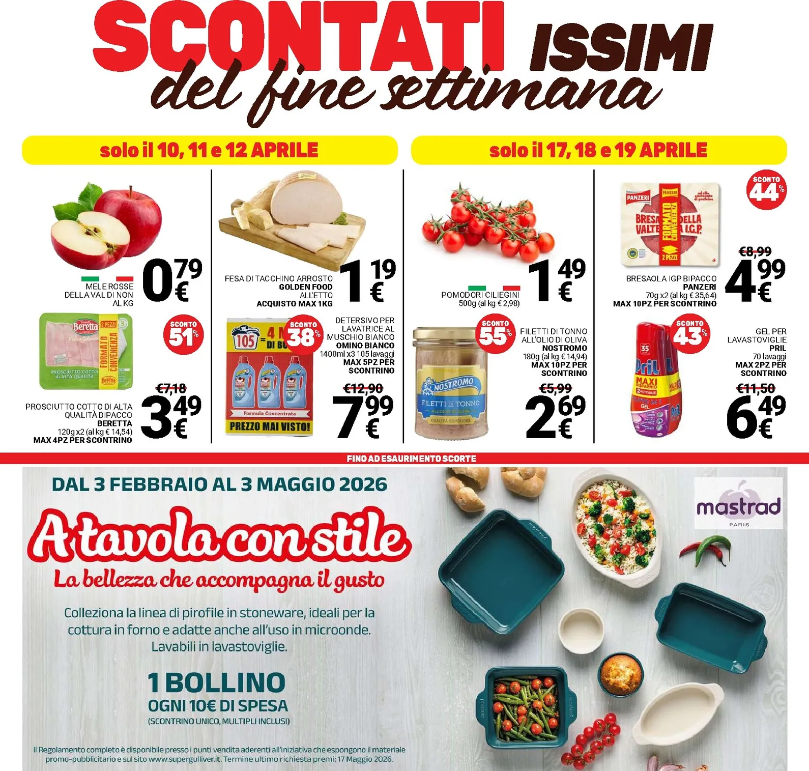 Il volantino si arricchisce con gli “Scontatissimi del fine settimana”, offerte valide solo in giorni selezionati. Sarà possibile acquistare le Mele Rosse della Val di Non a 0,79€ al kg. Queste nuovo offerte a tempo sono un’ulteriore opportunità di risparmio. Per scoprire tutti i dettagli, consulta il completo Gulliver Volantino sul nostro sito. Ricorda che scoprire Gulliver Volantino dal 07/04/2026 ti permette di pianificare al meglio la spesa settimanale.