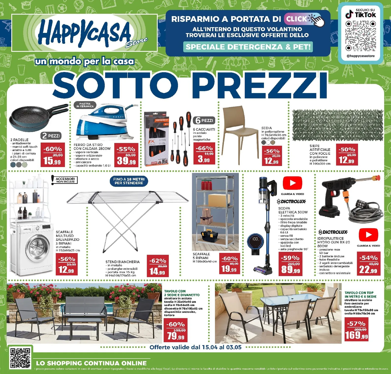 Il nuovo volantino Happy Casa lancia l’incredibile promozione “Sotto Prezzi”, con sconti su tantissimi articoli per la casa. In evidenza il set di due padelle antiaderenti a soli 15,99€ e il potente ferro da stiro a vapore a 39,99€. Per l’arredamento, la sedia in polipropilene è proposta a 12,99€. Consultare il Happy Casa Volantino dal 15/04/2026 è essenziale per scoprire tutte le opportunità e rinnovare gli ambienti risparmiando.