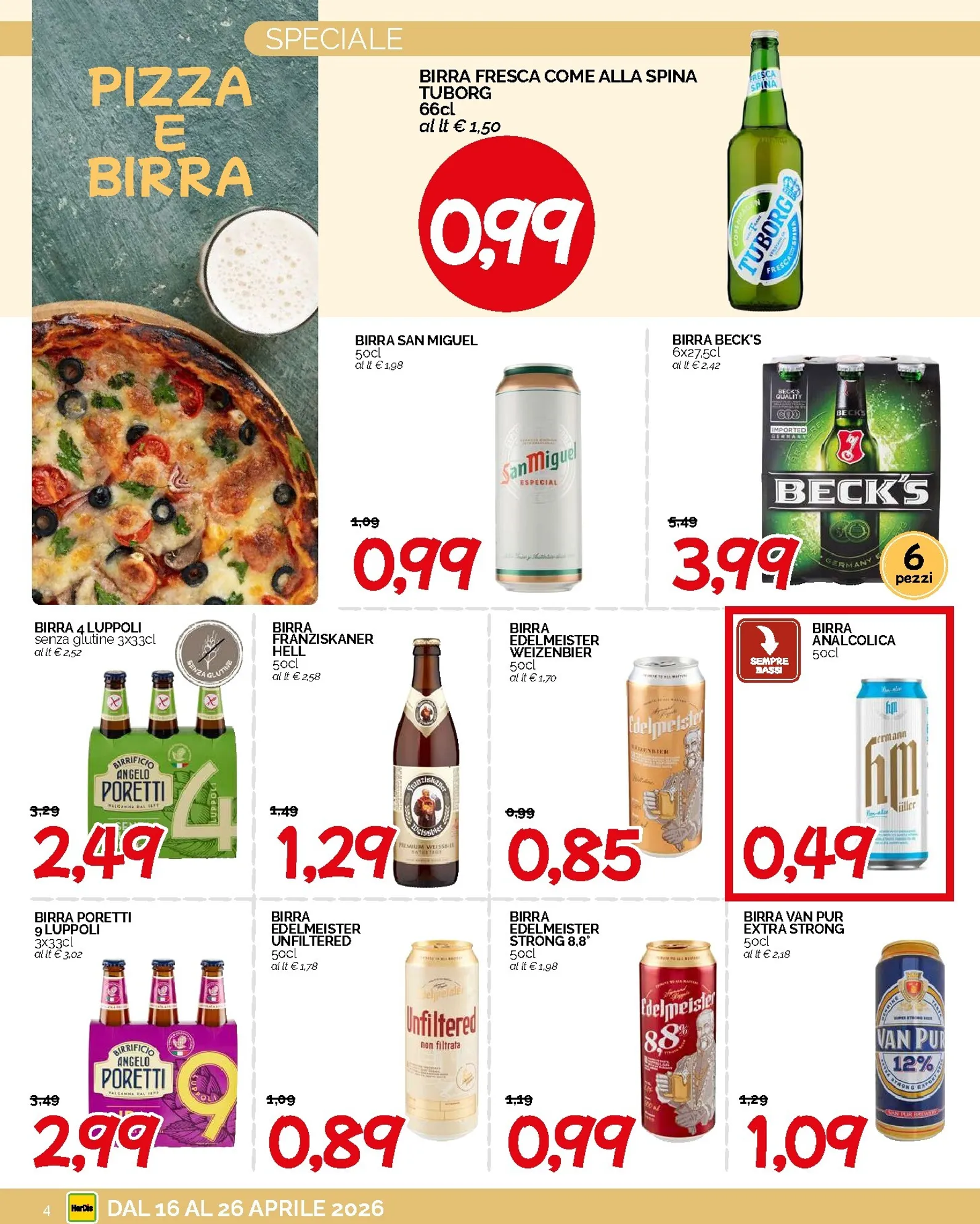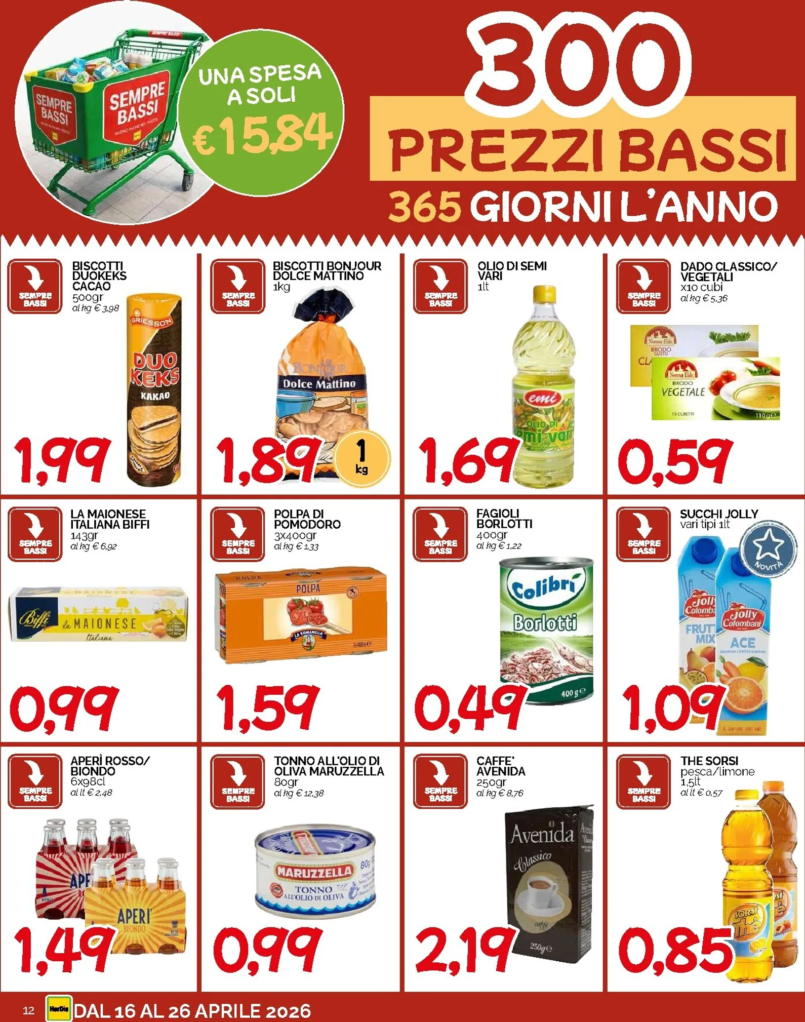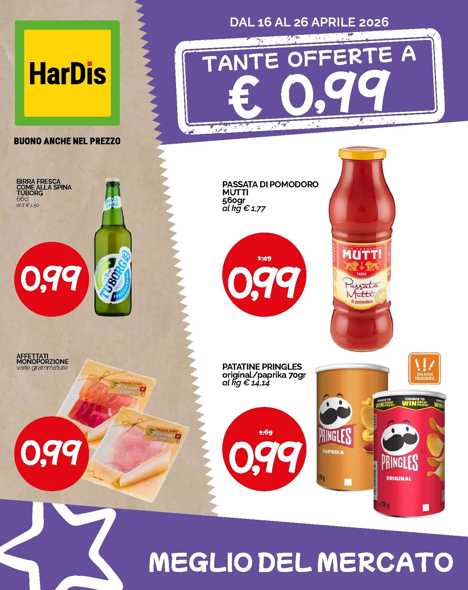 Preparatevi a un risparmio incredibile con le nuove nuovo offerte Hardis, valide dal 16 al 26 Aprile 2026. Il protagonista assoluto di questo volantino è il prezzo fisso di 0,99€ su una vastissima selezione di prodotti. Immaginate di riempire il carrello con articoli di marca senza svuotare il portafoglio. Tra le imperdibili offerte a meno di un euro, troviamo la birra fresca Tuborg da 66cl, la passata di pomodoro Mutti da 560gr e le iconiche patatine Pringles da 70gr. Queste nuovo offerte sono perfette per organizzare un aperitivo o fare scorta dei vostri snack preferiti. Scoprire il Hardis Volantino dal 16/04/2026 non è mai stato così conveniente, con decine di prodotti che aspettano solo di essere scoperti a un prezzo imbattibile.