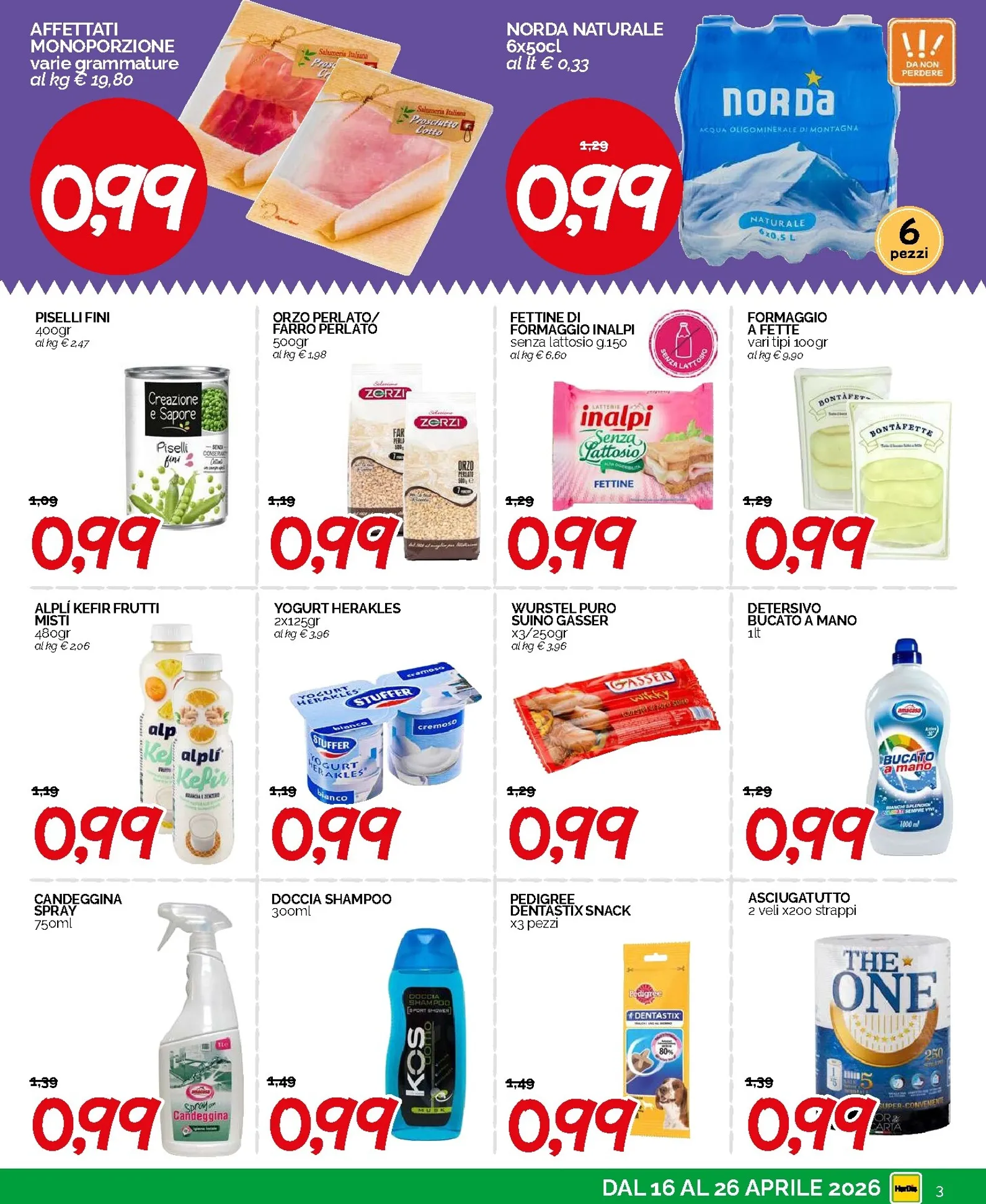 Le offerte a 0,99€ non si limitano solo ai prodotti confezionati, ma si estendono a tantissime altre categorie. Per esempio, potete trovare gli affettati in monoporzione, i piselli fini in scatola, l’orzo perlato Zorzi e le fettine di formaggio fuso Inalpi. Per una pausa rinfrescante, non perdete il kefir Alpi ai frutti misti o lo yogurt greco Herakles. Anche la cura della casa e della persona è in promozione: la candeggina spray, il detersivo per piatti Trucatutto a mano e lo shampoo Doccia KOS sono tutti a 0,99€. E per l’idratazione quotidiana, la confezione da sei bottiglie di acqua naturale Norda è un’occasione da non lasciarsi sfuggire, con un prezzo al litro vantaggiosissimo.