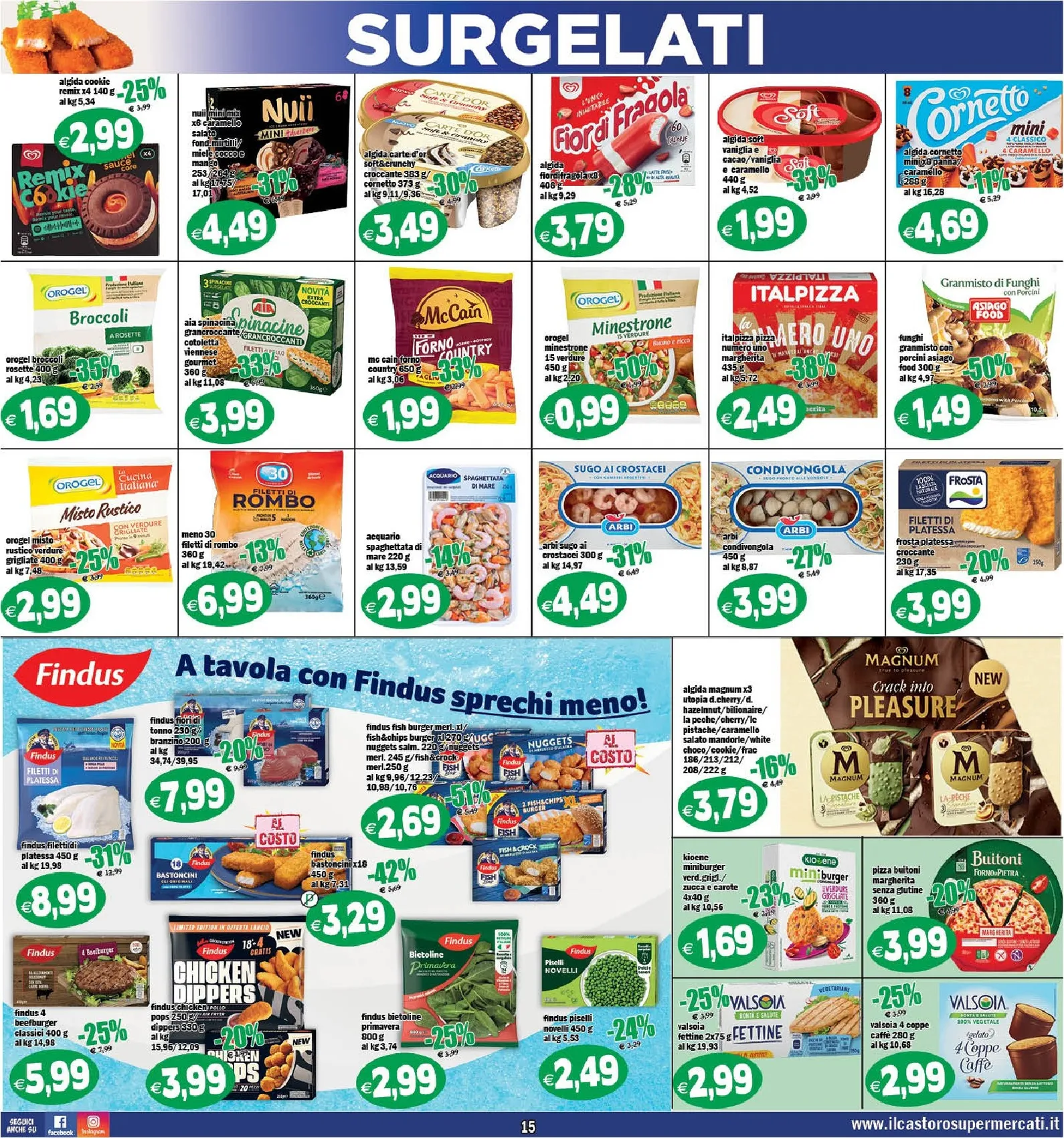 Il nuovo volantino Castoro pensa a ogni esigenza. Per la colazione, troviamo i cereali Nesquik e le barrette Fitness Nestlé a prezzi ridotti. Il reparto surgelati propone i bastoncini Findus a 3,29€ e la pizza Regina Classica a 2,79€, perfetti per una cena veloce. Anche le bevande sono in promozione, con la birra Ichnusa a 0,99€ e una selezione di vini come il Tavernello a 2,99€.