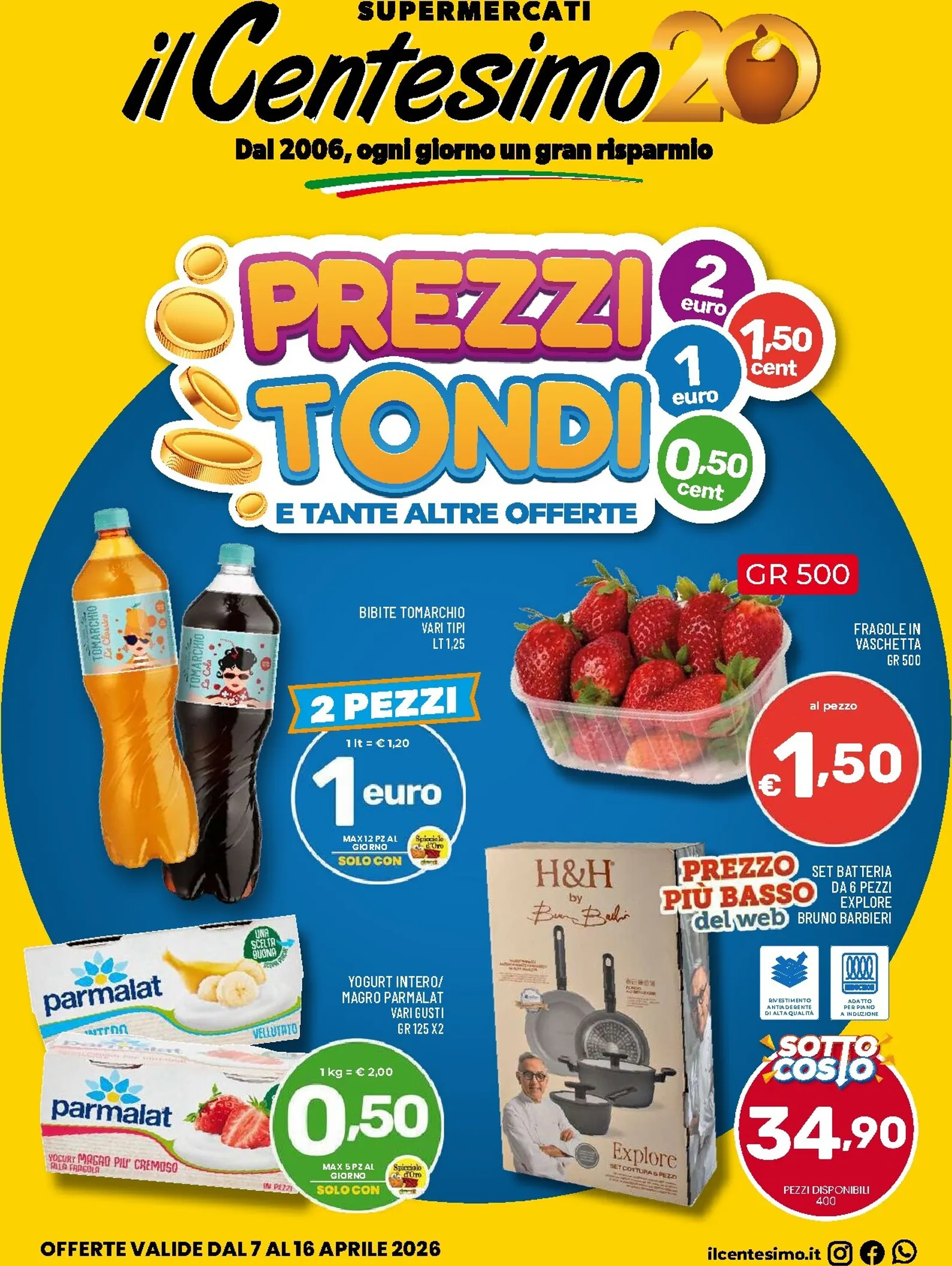 Il Centesimo presenta il suo nuovo volantino con la promozione “Prezzi Tondi”, valida dal 7 al 16 aprile 2026. L’iniziativa offre prezzi fissi a 0,50€, 1€ e 1,50€, semplificando la spesa. Subito in evidenza le bibite Tomarchio a 1€ per due bottiglie e le fragole in vaschetta da 500g a 1,50€. È l’occasione giusta per approfittare di Il Centesimo Volantino dal 07/04/2026 e fare scorta di prodotti di qualità.