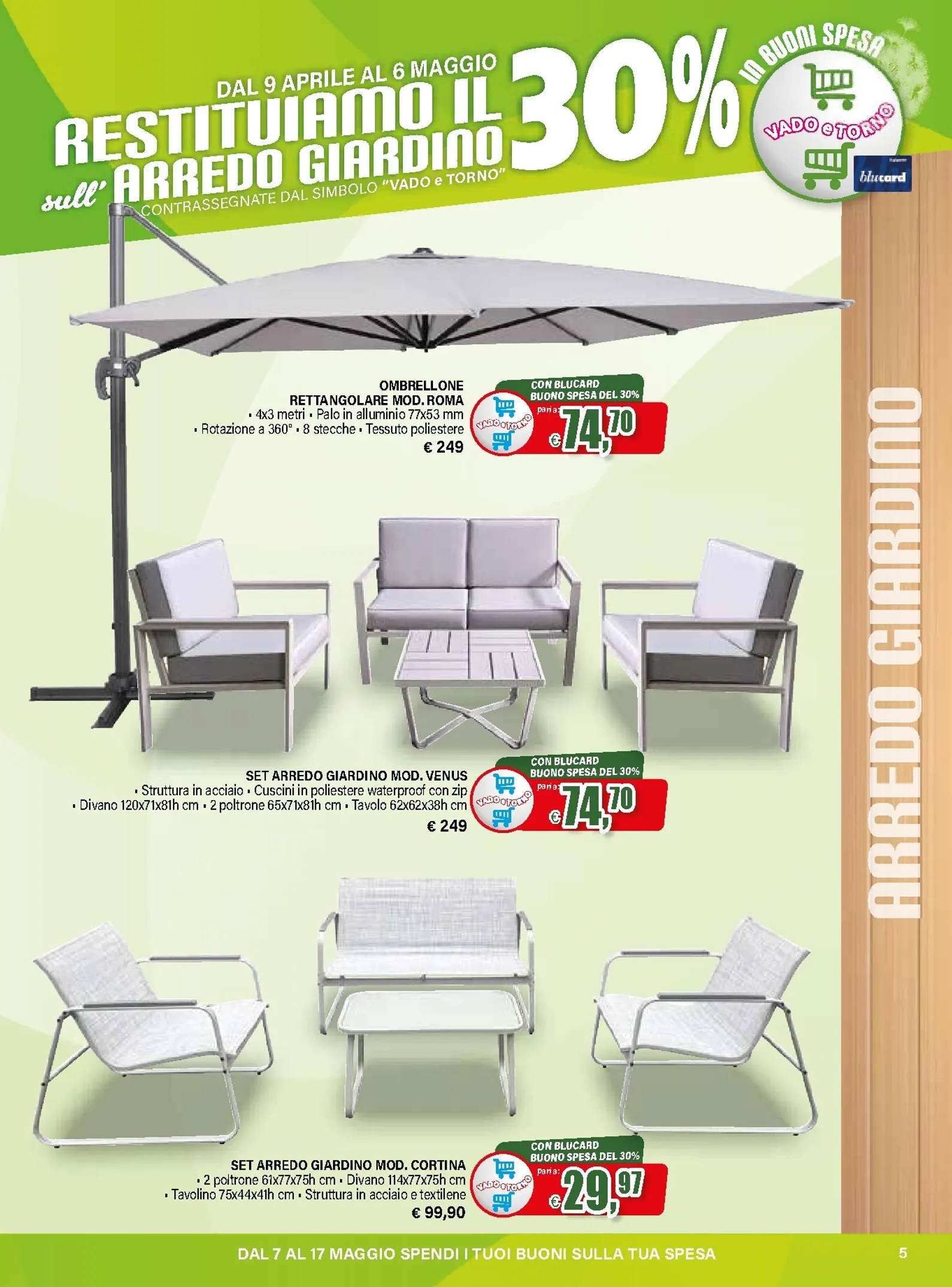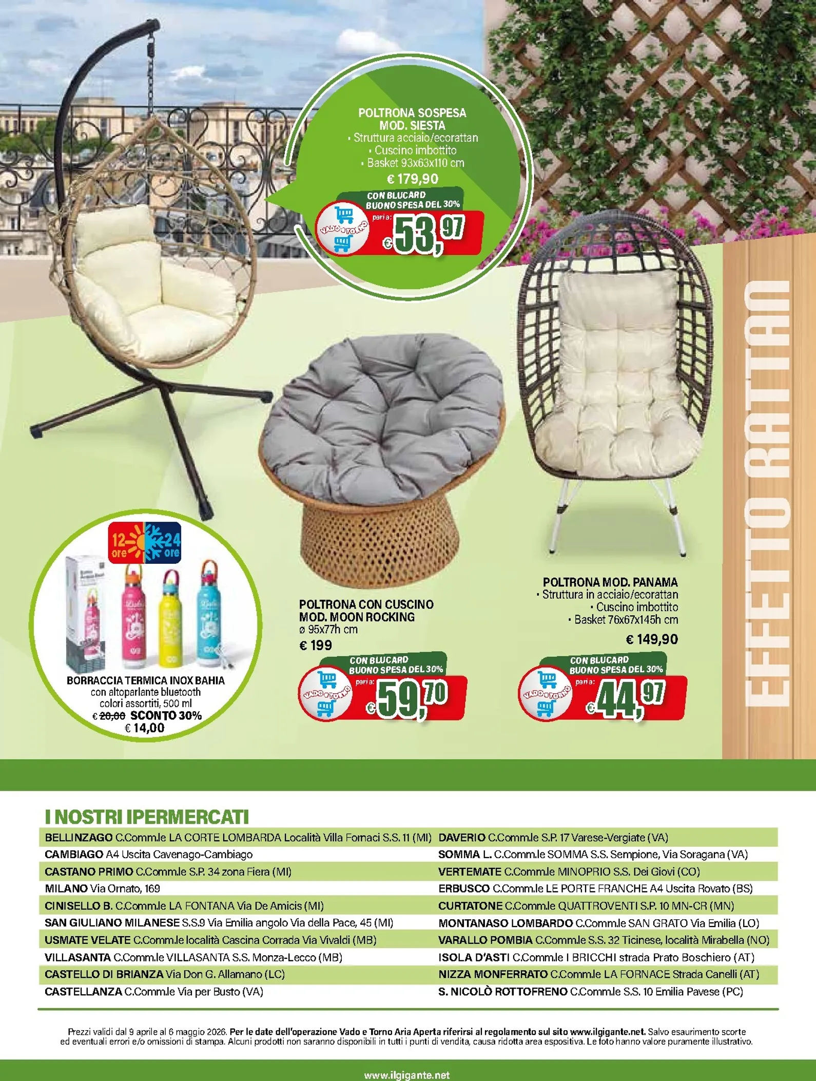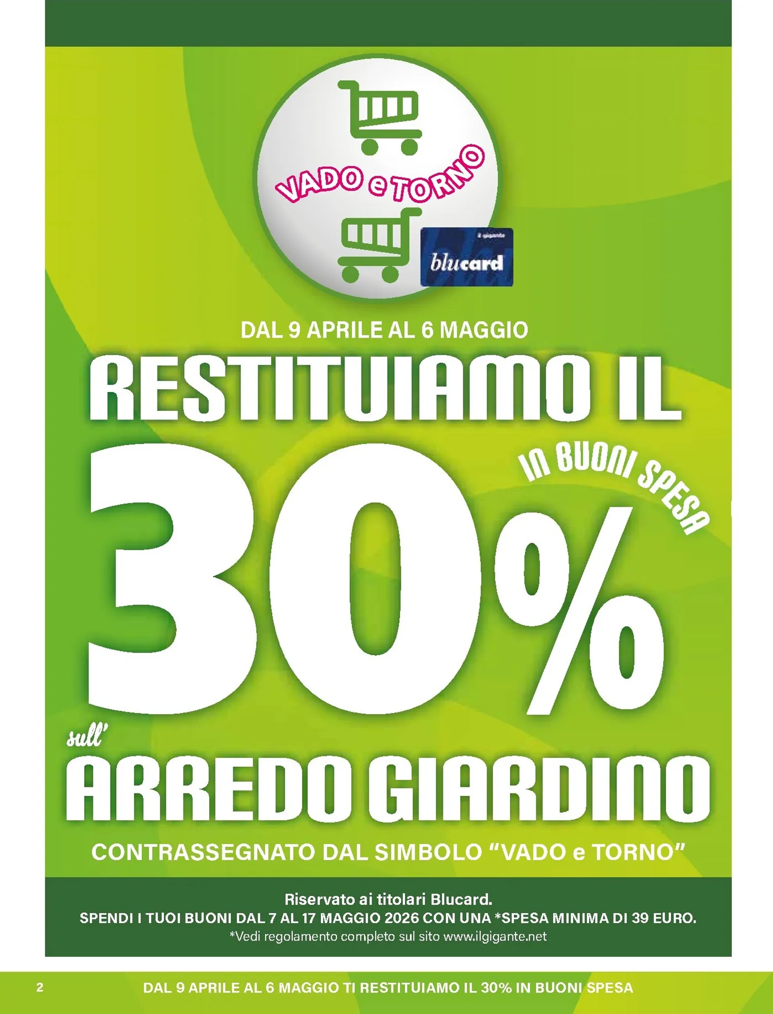 La primavera porta una grande novità da Il Gigante con la promozione “Vado e Torno”, attiva dal 9 aprile al 6 maggio 2026. Riservata ai clienti Blucard, l’iniziativa restituisce il 30% del valore speso in arredo giardino tramite buoni spesa. È un’occasione unica per rinnovare gli spazi esterni. Grazie a Il Gigante Volantino dal 09/04/2026, accedere a un catalogo ricco di proposte è semplice, un’anteprima ideale per chi cerca qualità e convenienza.