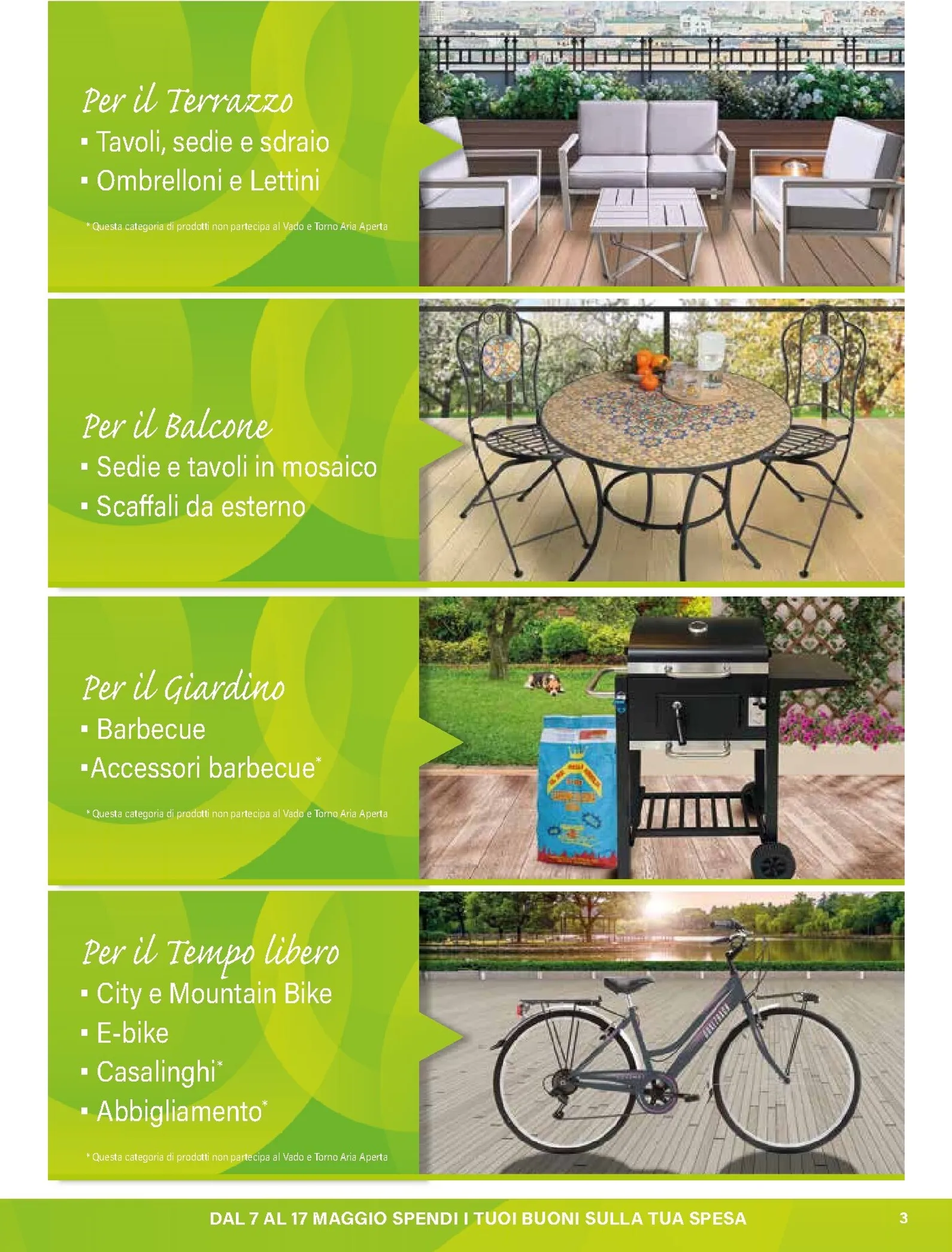 L’assortimento proposto nel catalogo è vasto e pensato per ogni esigenza. Si possono trovare tavoli, sedie, ombrelloni e lettini perfetti per arredare terrazzi. Per i balconi, sono disponibili eleganti soluzioni in mosaico e pratici scaffali da esterno. L’offerta si completa con una selezione di barbecue per le grigliate in compagnia e una linea per il tempo libero che include diverse tipologie di biciclette per le avventure all’aperto.