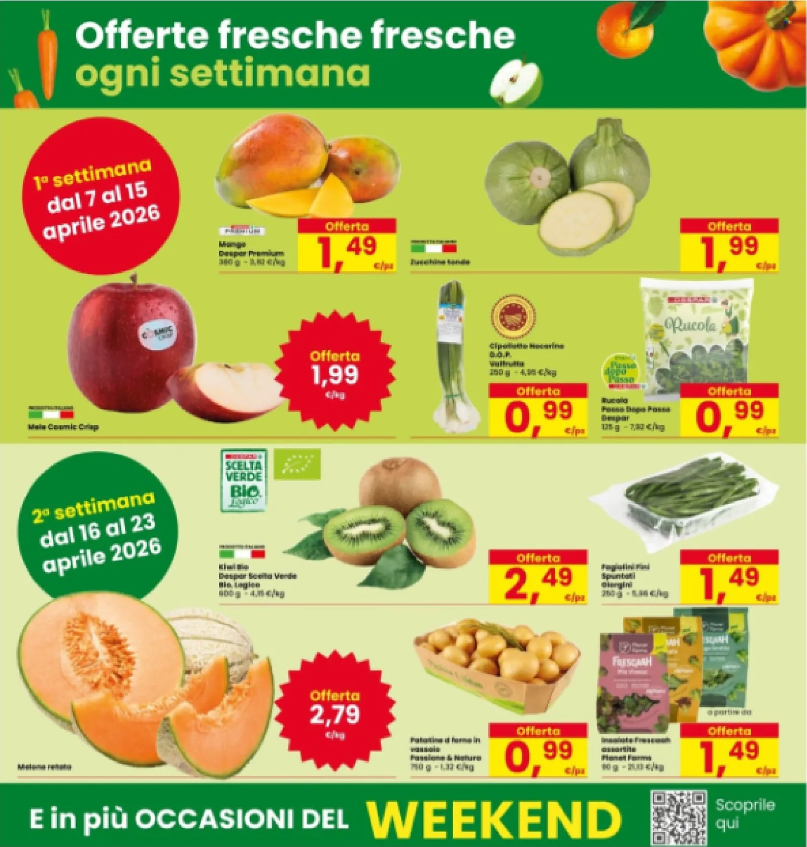 Il weekend del 17 e 18 aprile offre uno sconto del 25% su salsicce, vini bianchi e pesce surgelato. Il reparto ortofrutta si anima con offerte settimanali: la prima (7-15 aprile) propone mango e zucchine tonde a prezzi bassi. La seconda settimana (16-23 aprile) è il turno di kiwi bio e melone retato. Freschezza e qualità sono garantite ogni giorno grazie a queste fantastiche nuovo offerte.
