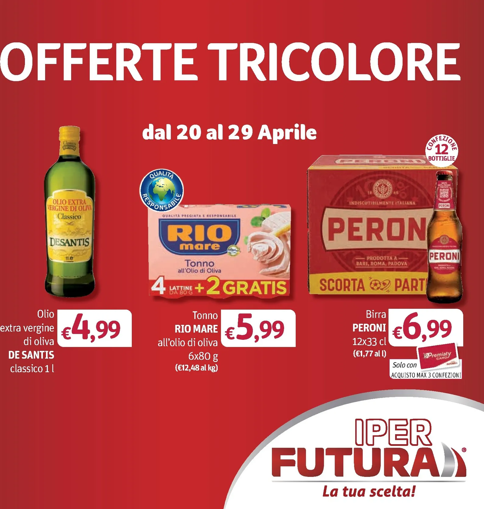 Arrivano le “Offerte Tricolore” da Iper Futura, un’occasione imperdibile per riempire la dispensa con prodotti di alta qualità a prezzi imbattibili, valide dal 20 al 29 Aprile. Questa settimana, il volantino mette in primo piano articoli essenziali per ogni tavola italiana. Tra le nuovo offerte di copertina, spiccano l’olio extra vergine di oliva De Santis a soli €4,99 e il tonno Rio Mare all’olio di oliva in una confezione speciale. Esplorare queste Iper Futura Volantino dal 20/04/2026 è il modo perfetto per iniziare a pianificare la spesa settimanale, garantendosi convenienza e gusto. Le offerte sono pensate per soddisfare le esigenze di tutta la famiglia, con un occhio di riguardo alla tradizione culinaria del nostro paese.