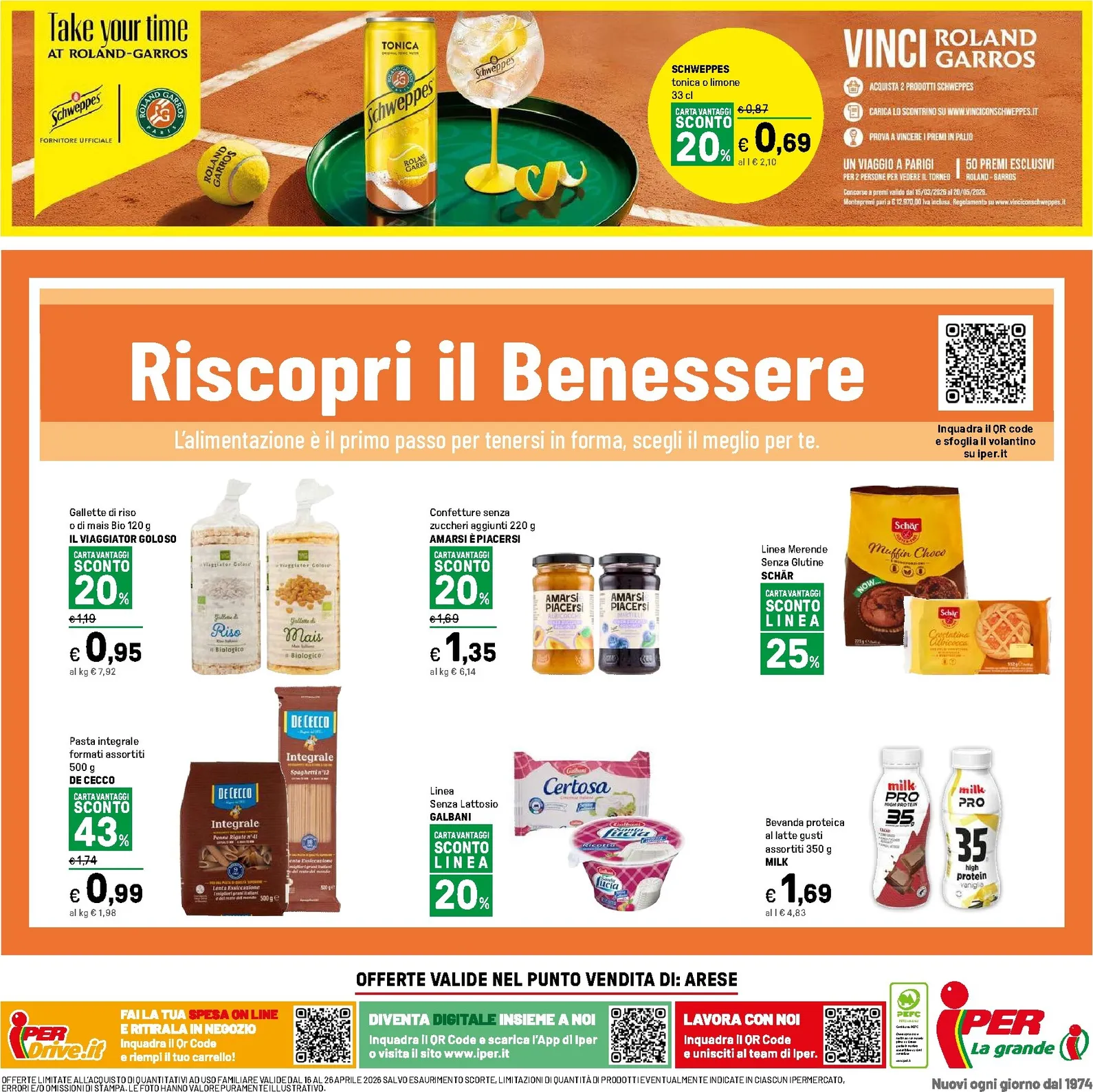 Il nuovo volantino si completa con offerte dedicate al benessere. Troviamo le bevande proteiche Milk Pro a 1,69€ e la rinfrescante Schweppes scontata del 20%. Queste nuovo offerte sono pensate per ogni esigenza. Per non perdere queste opportunità, ti consigliamo di consultare il Iper Volantino dal 16/04/2026 completo. Visita la pagina del Iper Volantino per scoprire tutte le novità e pianificare i tuoi acquisti.