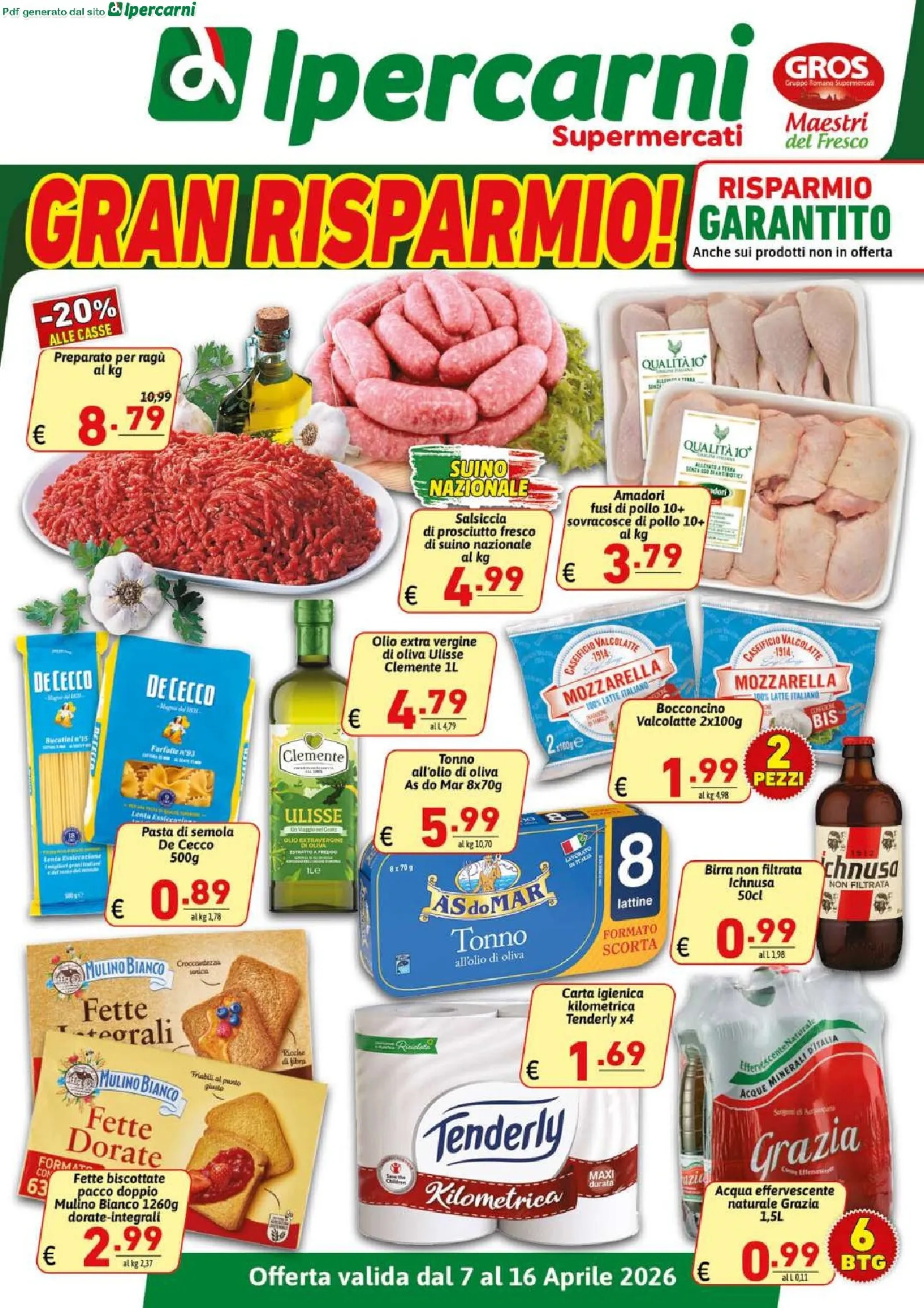 Il nuovo volantino Ipercarni, valido dal 7 al 16 Aprile 2026, inaugura una stagione di “Gran Risparmio Garantito”. Le offerte in primo piano includono il preparato per ragù a 8,79€ al kg e la salsiccia di suino a 4,99€. Anche la dispensa si arricchisce con la pasta De Cecco a 0,89€. Queste nuovo offerte, abbinate alle Ipercarni Volantino dal 07/04/2026, rendono la spesa settimanale incredibilmente vantaggiosa.