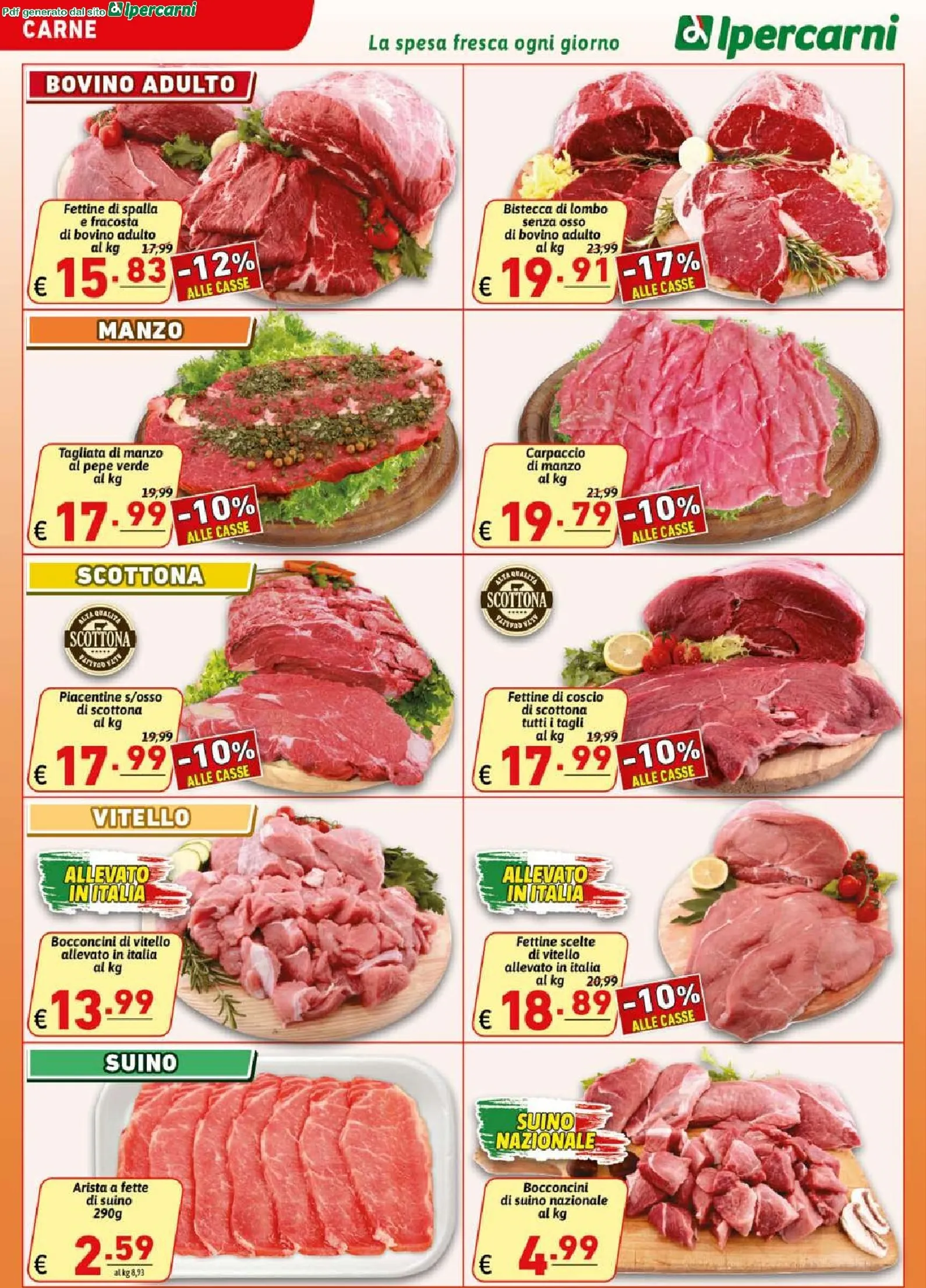 Il reparto macelleria offre tagli di carne di prima scelta a prezzi eccezionali. Le fettine di spalla di bovino adulto sono scontate a 15,83€ al kg, mentre la bistecca di lombo di vitellone scende a 19,91€ al kg. Per chi ama carni più delicate, i bocconcini di vitello allevato in Italia sono un’ottima scelta a 13,99€, garantendo freschezza e provenienza certificata.