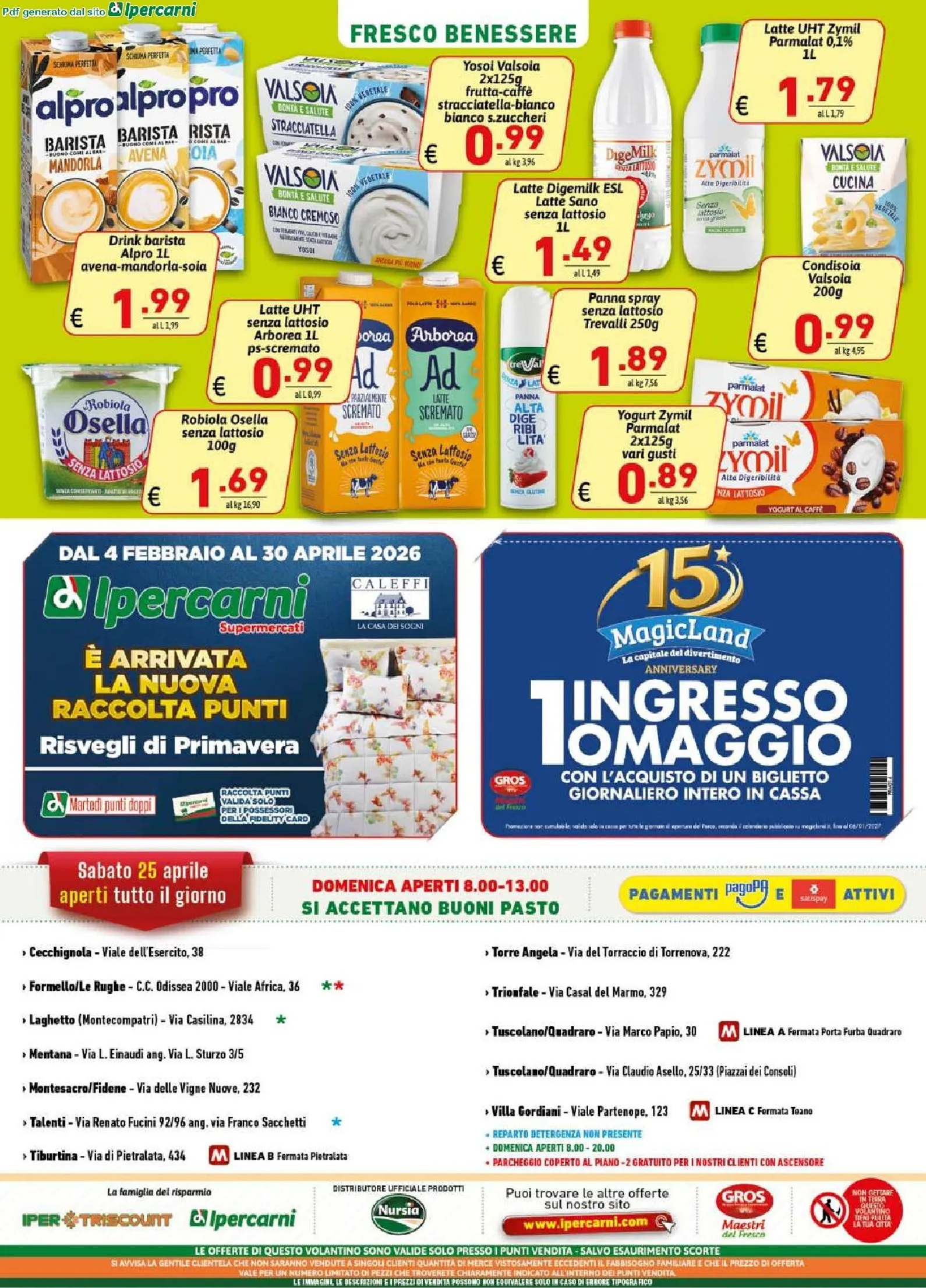 Il risparmio si estende anche al reparto dei freschi, con il latte UHT Arborea a 0,99 € e le bevande vegetali Alpro a 1,99 €. Anche lo yogurt Zymil è in promozione a 0,89 €. Per scoprire tutte le nuove nuovo offerte e pianificare al meglio la spesa, consultate l’intero Ipercarni Volantino dal 17/04/2026 e non perdete nessuna occasione. Ricordatevi di visitare il Ipercarni Volantino per rimanere sempre aggiornati su tutte le offerte disponibili nei punti vendita.