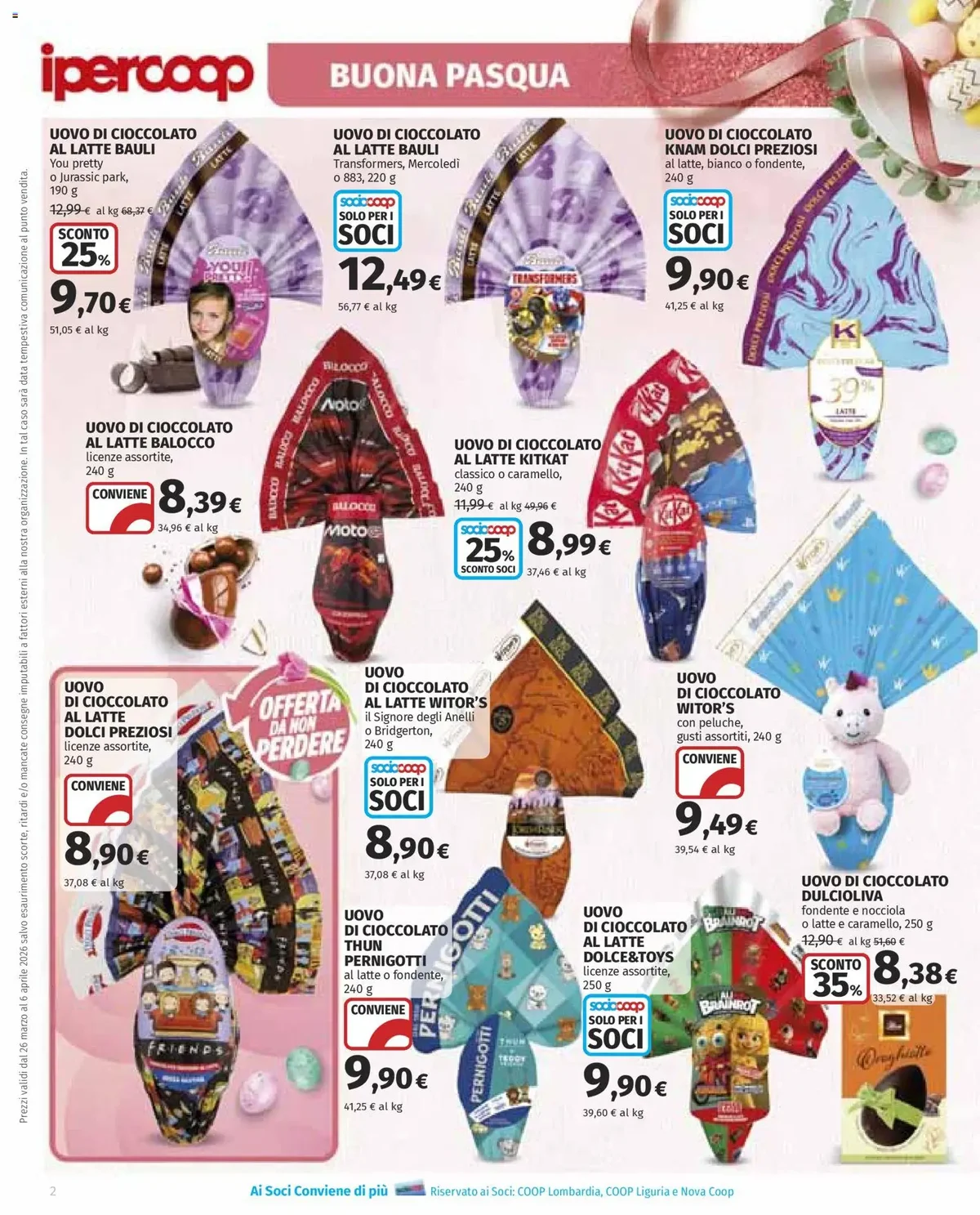 La Pasqua è sinonimo di cioccolato, e il Volantino Ipercoop dal 26.03.2026 ne è la prova. Per i più piccoli e non solo, troverai l'UOVO DI CIOCCOLATO AL LATTE BAULI You pretty da 190 g a 9,70€ con il 25% di sconto, o le versioni Bauli Transformers, Mercoledì o 883 da 220 g a 12,49€. Gli amanti dei classici apprezzeranno l'UOVO DI CIOCCOLATO AL LATTE KITKAT, classico o caramello, da 240 g a 8,99€ con un risparmio del 25%. E per chi cerca varietà, gli OVETTI WITOR'S gusti assortiti da 1 kg sono proposti a 7,69€, con un conveniente sconto del 30%.