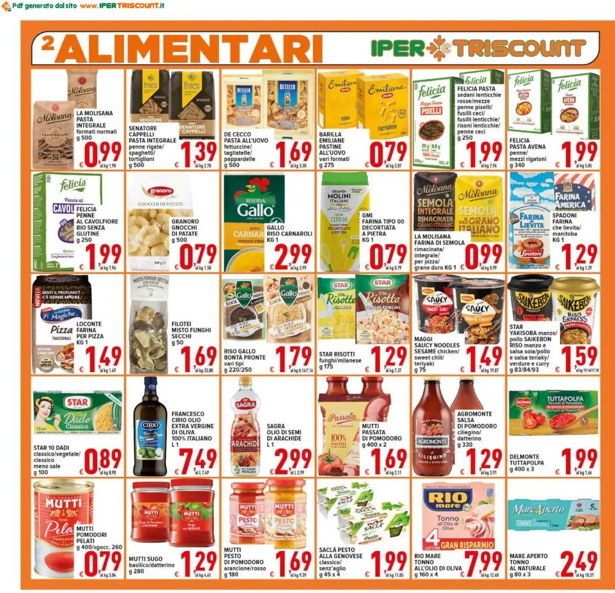 All'interno di questo imperdibile Volantino Ipertriscount dal 06.03.2026, troverete promozioni su articoli essenziali. La PETTI PASSATA EXTRAFINE g 700 è a soli 0,99€, perfetta per ogni ricetta. Per la dispensa, il NOSTROMO TONNO ALL'OLIO DI OLIVA g 60 X 8 è disponibile a 4,99€ e l'OLIO EXTRA VERGINE DI OLIVA FRANCESCO CIRIO 100% Italiano L 1 a 7,49€. Tra i freschi, spiccano la COSCIA DI SUINO STAGIONATA GRAN PIANO a 0,99€ l'etto e l'imperdibile SALSICCIA MACINATA DI PURO SUINO NAZIONALE PACCO FAMIGLIA al chilo a soli 3,99€. Non dimenticate il NELSEN DETERSIVO PIATTI vari tipi ml 850 in confezione da 2 pezzi a 1,99€ per la cura della casa.