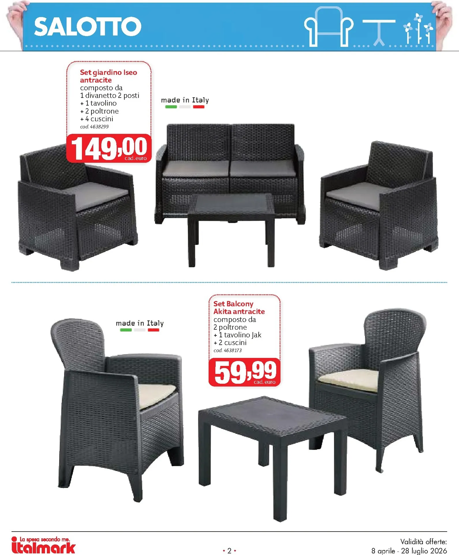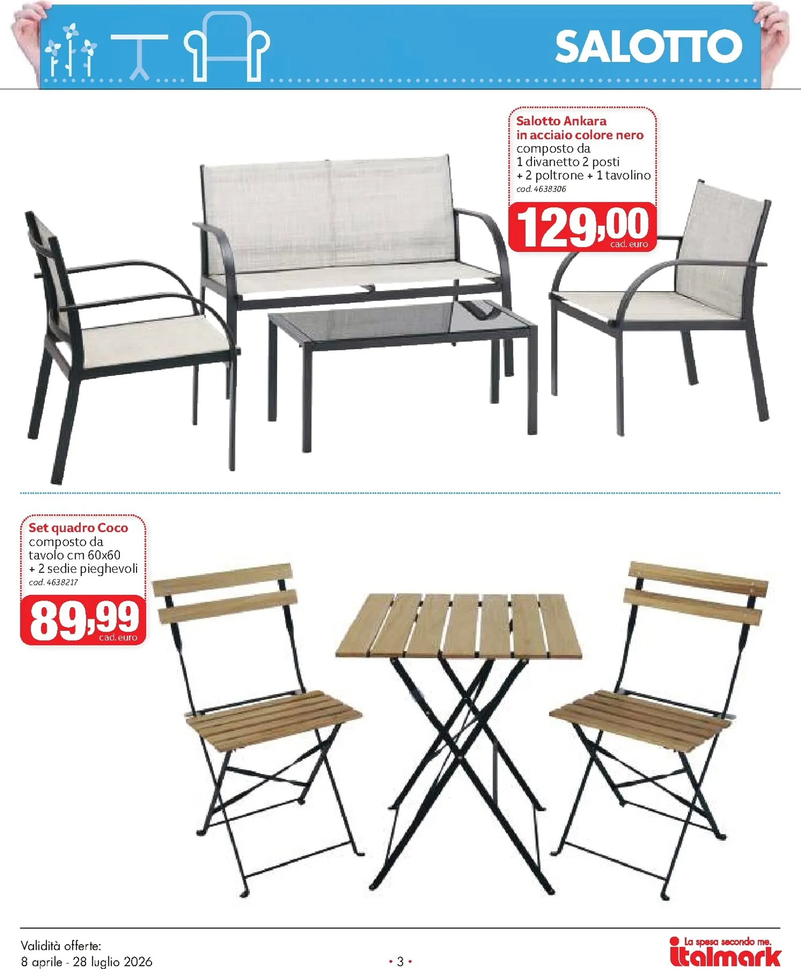 La primavera sboccia con il nuovo catalogo Italmark “Vivi il Giardino”, valido dall’8 aprile al 28 luglio 2026. È l’invito perfetto per trasformare ogni spazio esterno in un’oasi di relax e convivialità. Le proposte di questo volantino uniscono design, funzionalità e convenienza. Tra le tante occasioni disponibili, troverai sicuramente il Italmark Volantino dal 08/04/2026 per arredare con stile e goderti al meglio la bella stagione.