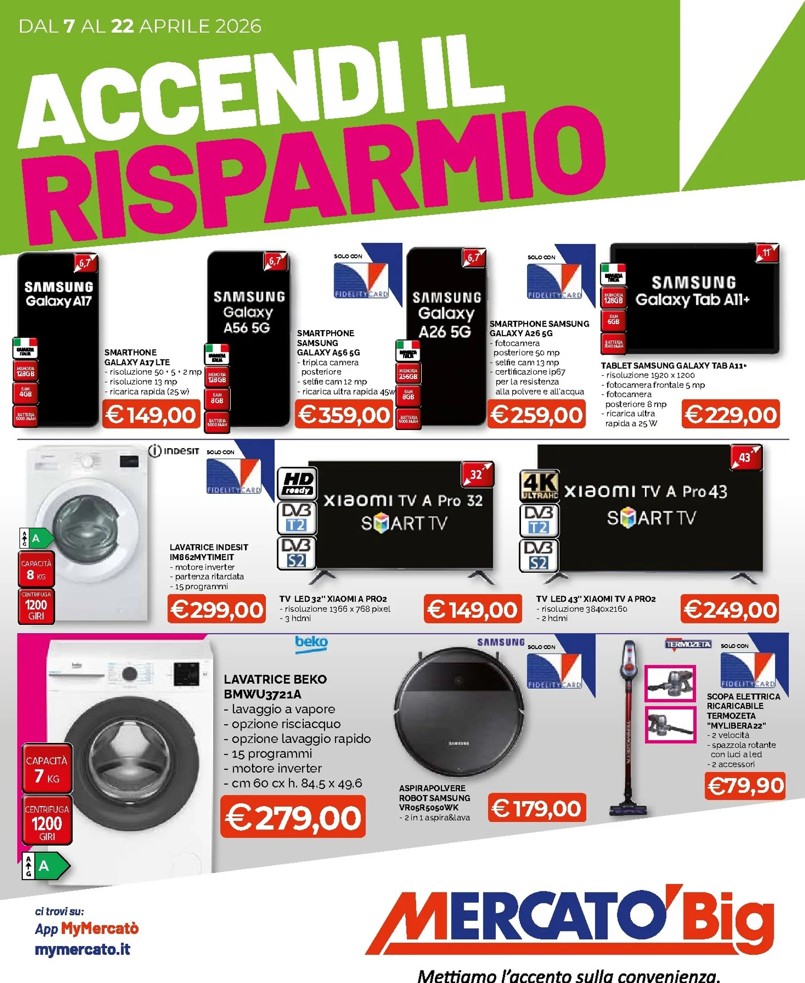 Dal 7 al 22 Aprile 2026, Mercatò Big presenta la campagna “Accendi il Risparmio”, un’occasione imperdibile per rinnovare tecnologia e casa. Questo nuovo volantino è ricco di nuovo offerte, a partire dal settore hi-tech. Spiccano lo smartphone Samsung Galaxy A56 5G a 359,00€ e la Smart TV Xiaomi A Pro 43″ 4K a 249,00€. Queste opportunità rappresentano il momento ideale per esplorare Mercatò Big Volantino dal 07/04/2026 e aggiornare i propri dispositivi.