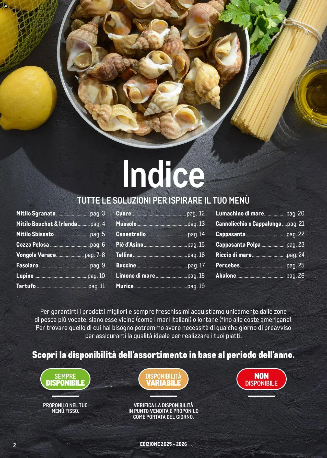 Sfogliando l’indice, si scopre un assortimento vastissimo che spazia dai classici intramontabili alle specialità più ricercate. Troviamo prodotti come la Cozza Pelosa, la Vongola Verace, i Fasolari e i Tartufi di mare, ma anche prelibatezze come i Percebes e l’Abalone. Ogni prodotto è presentato con cura, indicando la pagina per un approfondimento completo. Questa guida è uno strumento fondamentale per pianificare il menù, tenendo conto della disponibilità stagionale, chiaramente indicata con pratiche etichette cromatiche: verde per “Sempre Disponibile”, arancione per “Disponibilità Variabile” e rosso per “Non Disponibile”.