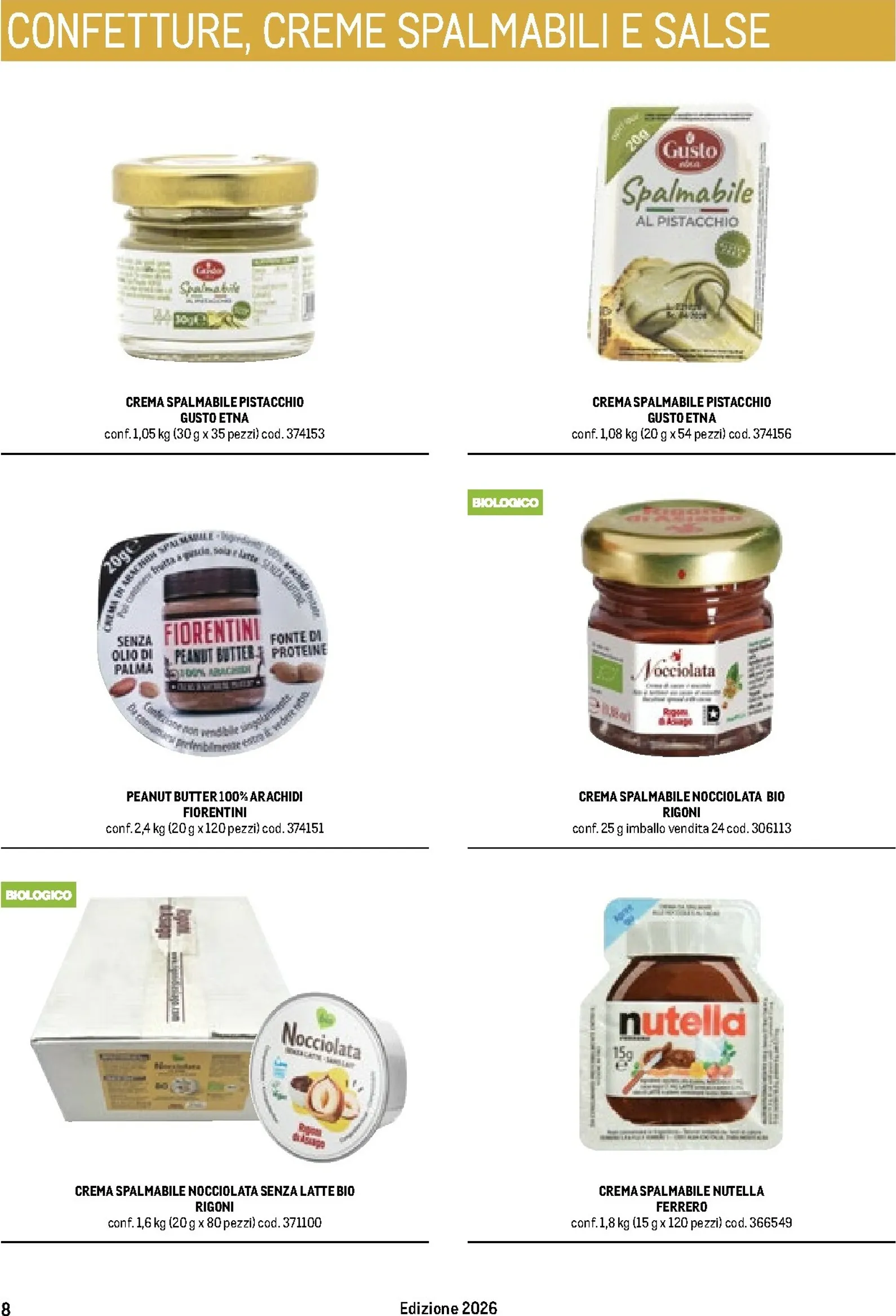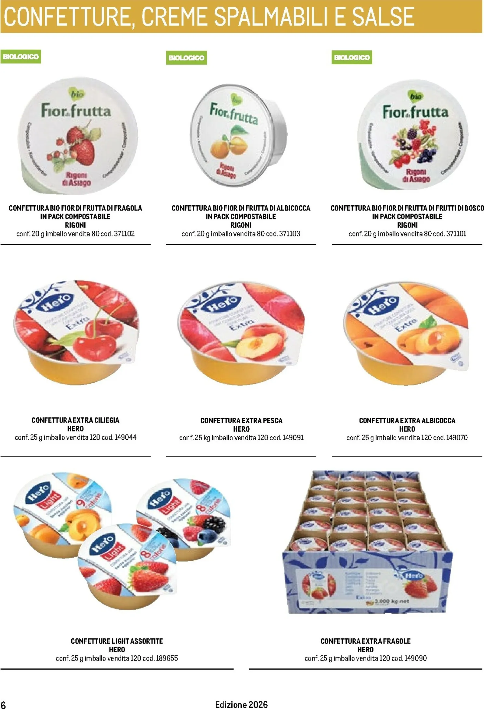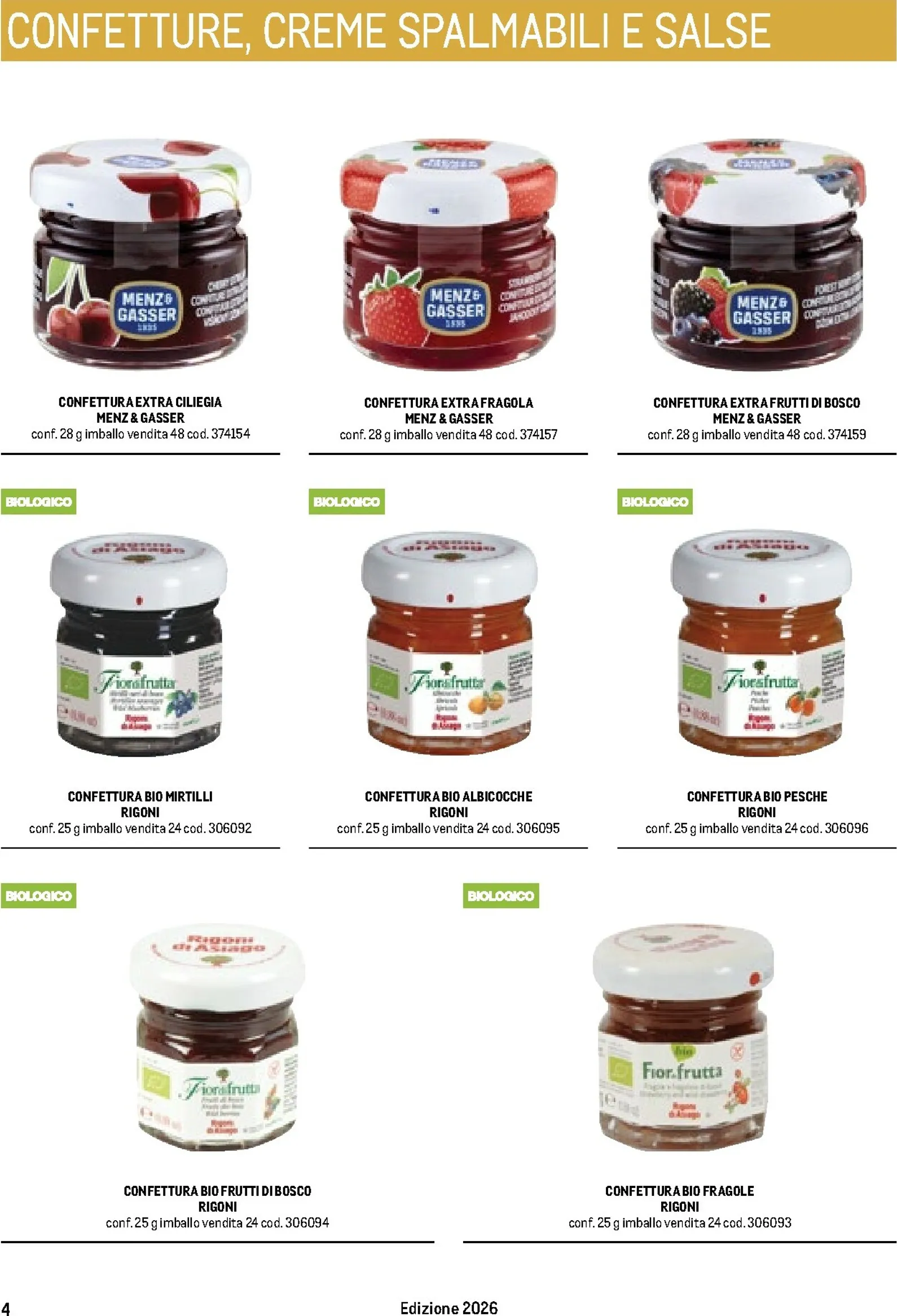 La sezione colazione è un punto di forza del catalogo, con prodotti dolci e salati. Spiccano le confetture monodose di marchi come Rioba e Menz & Gasser, ideali per un buffet curato. L’assortimento include creme, cereali, prodotti da forno, succhi e latticini, permettendo di creare proposte variegate. Queste offerte sono state selezionate per rendere speciale il primo pasto della giornata e soddisfare ogni gusto dei clienti.