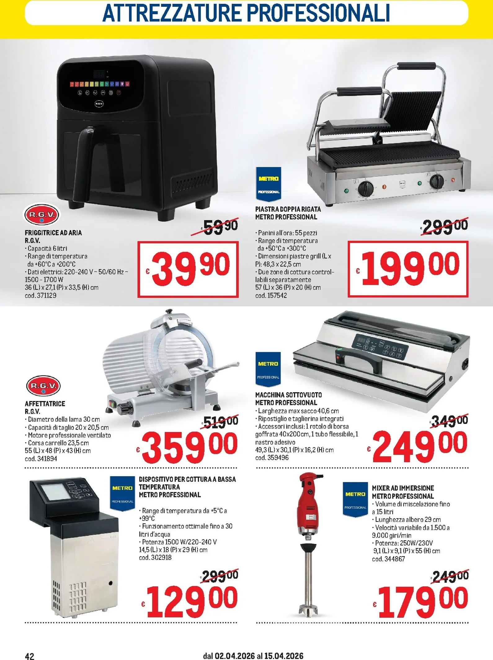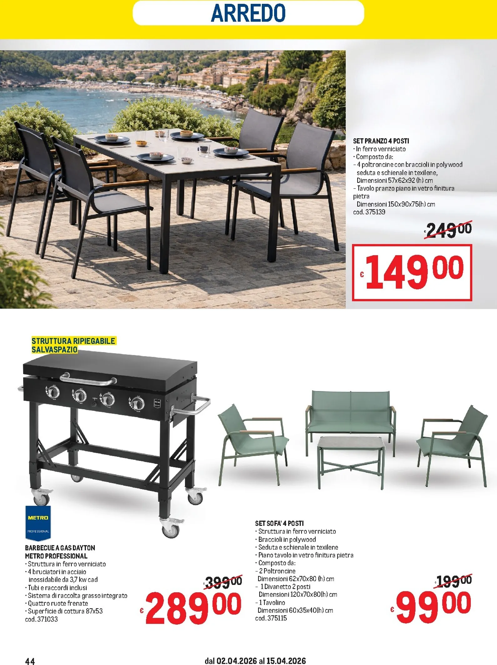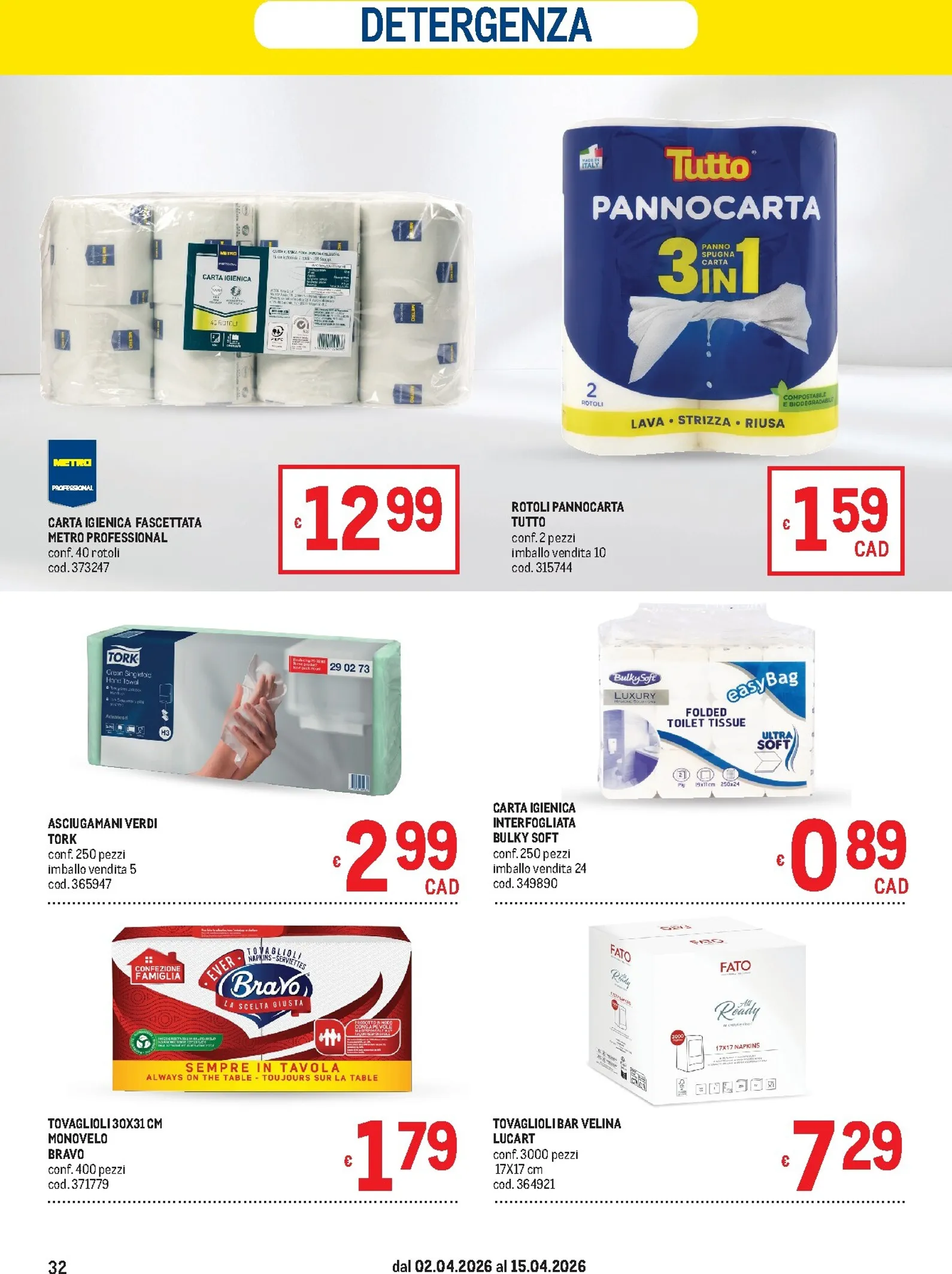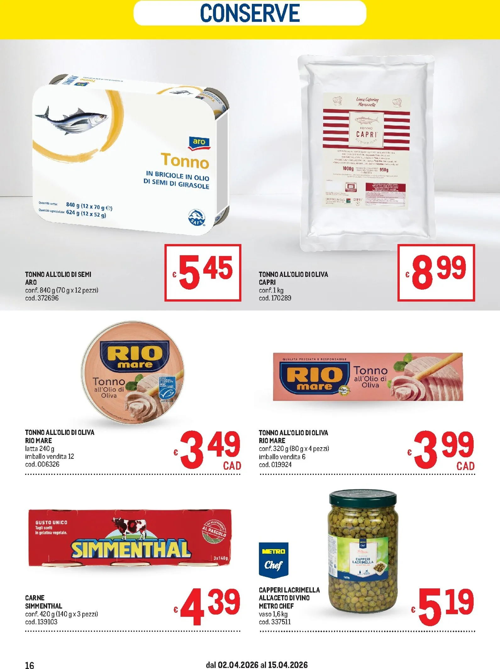Il volantino include anche prodotti indispensabili per dispensa e igiene. Il Tonno Rio Mare in confezione scorta è in promozione a 11,49€, mentre il detersivo Dash Professional è offerto a 29,49€. Ricordiamo che le nuovo offerte sono attive in punti vendita selezionati. Per scoprire nel dettaglio tutte le Metro Volantino dal 02/04/2026 e pianificare i tuoi acquisti, consulta il nostro Metro Volantino online.