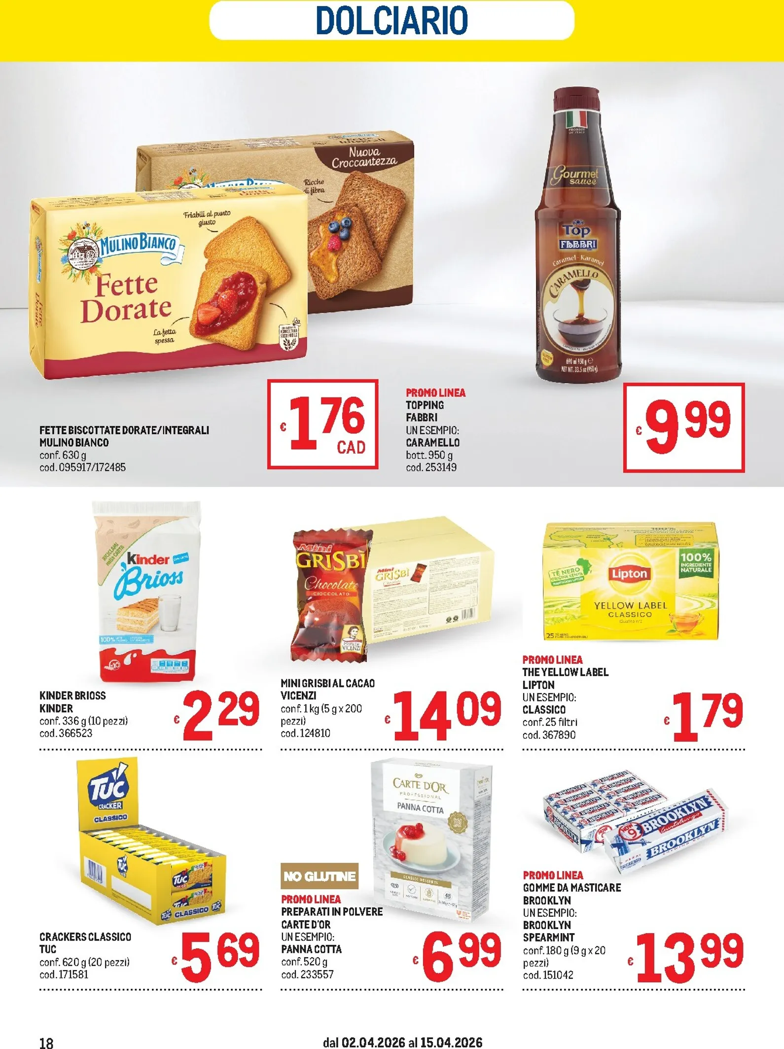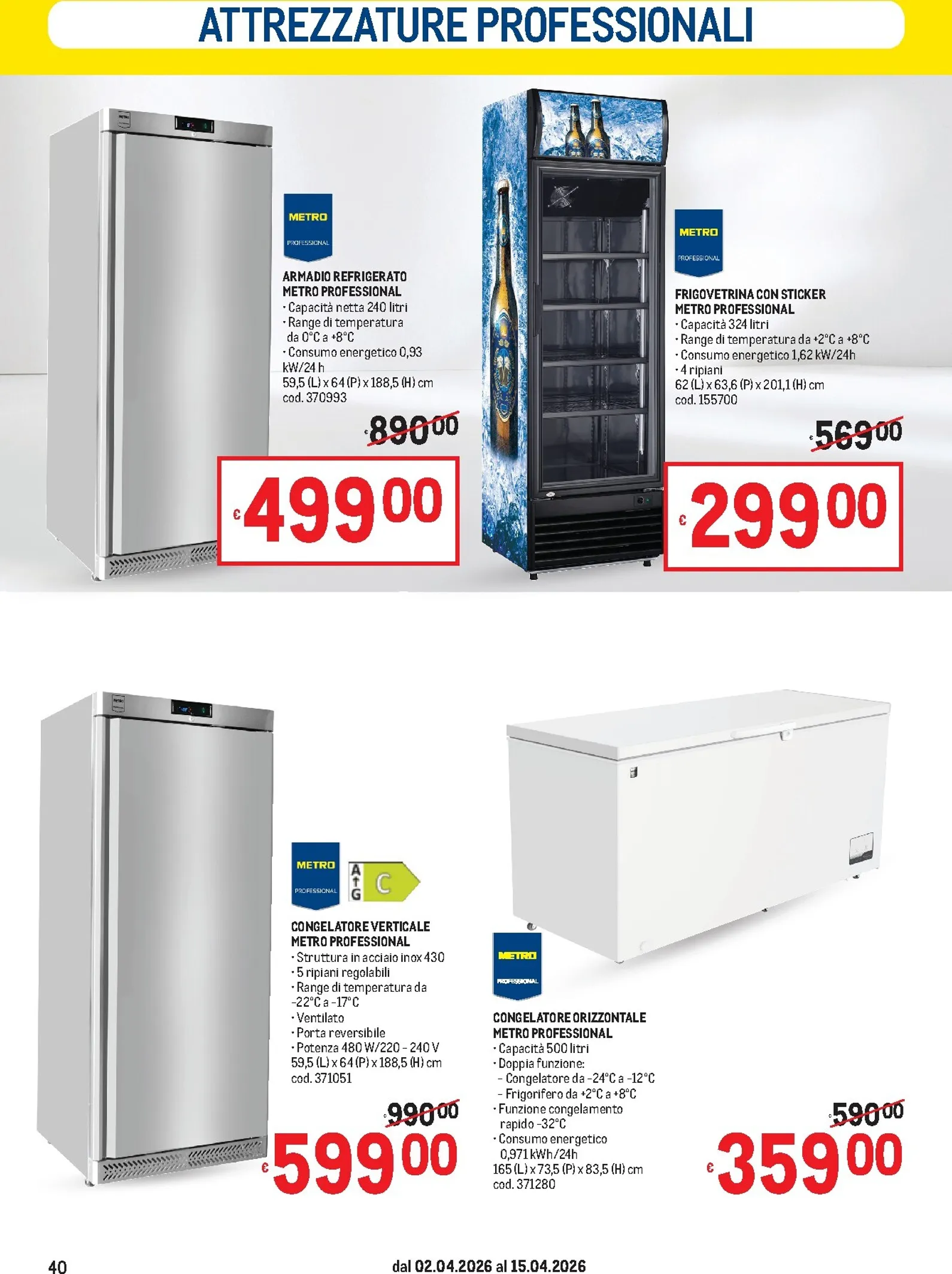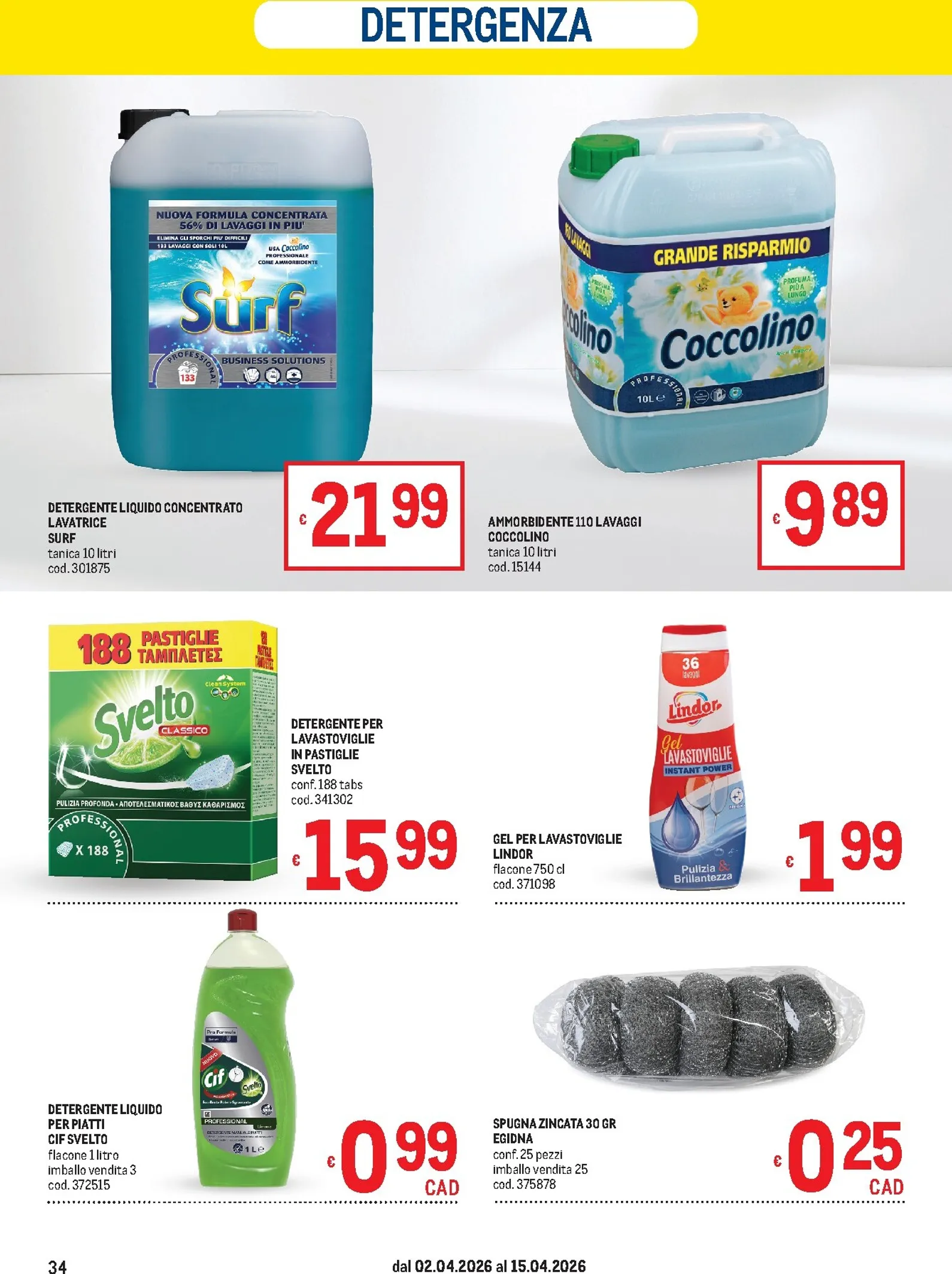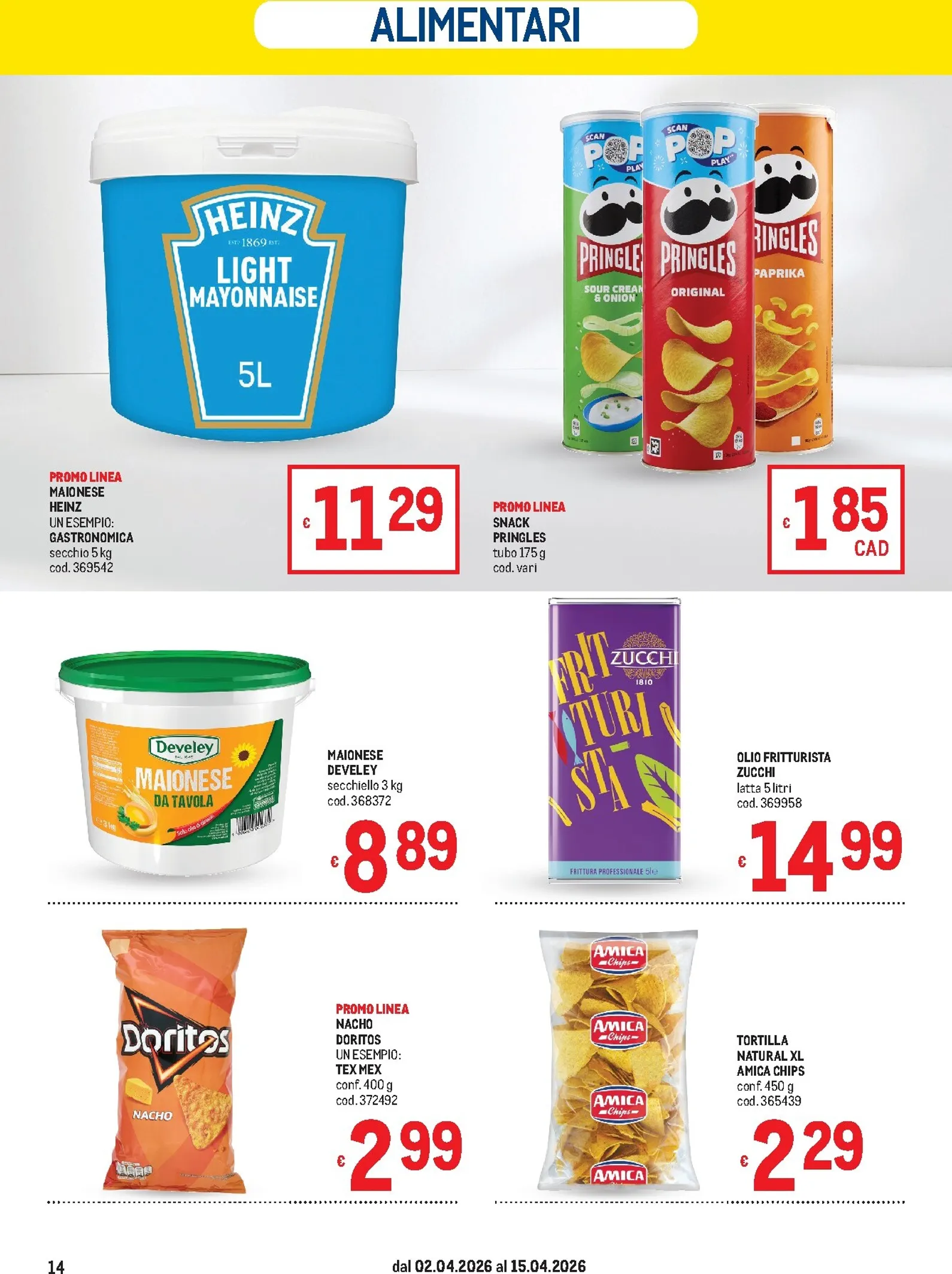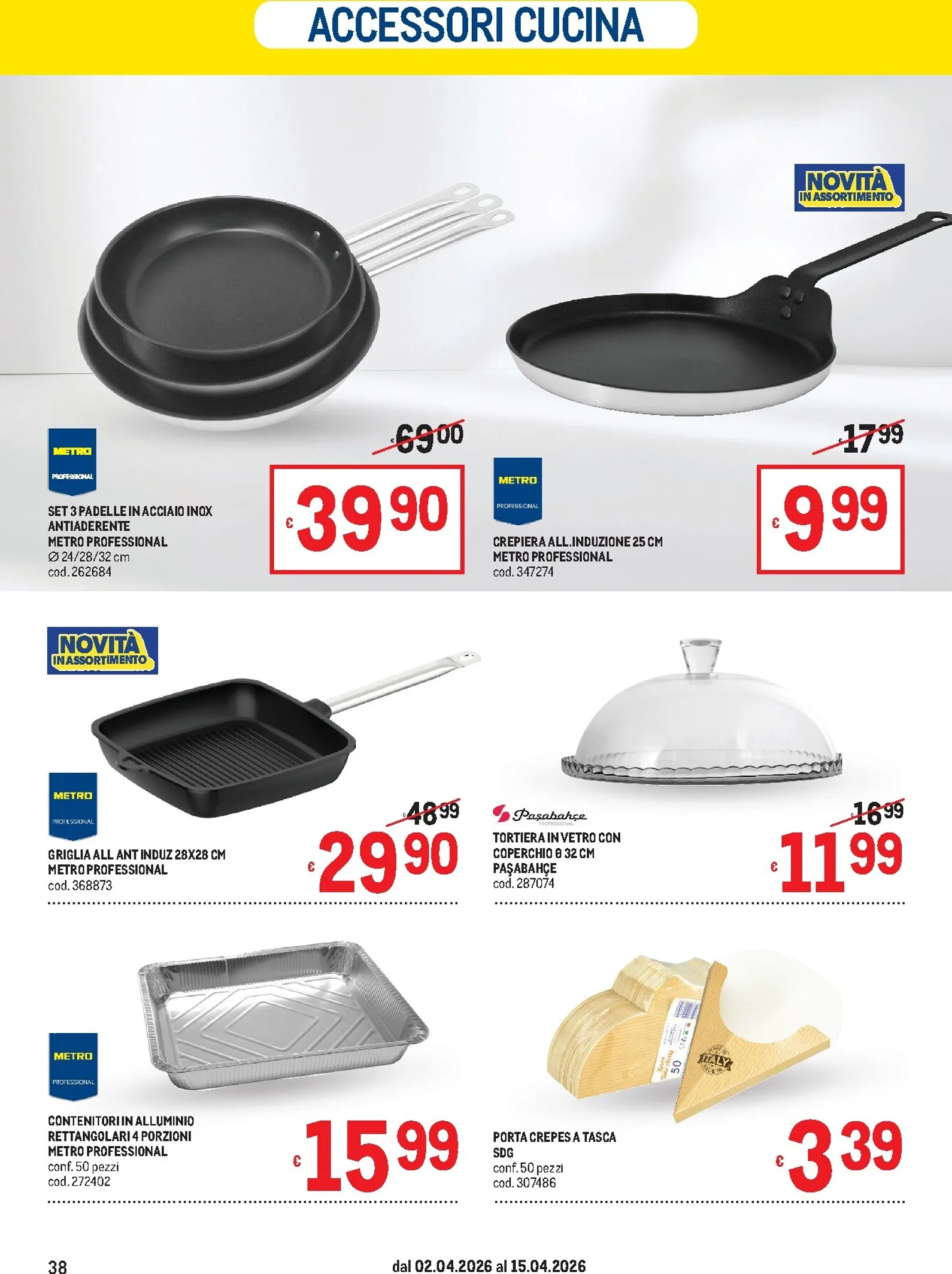 Il volantino include anche prodotti indispensabili per dispensa e igiene. Il Tonno Rio Mare in confezione scorta è in promozione a 11,49€, mentre il detersivo Dash Professional è offerto a 29,49€. Ricordiamo che le nuovo offerte sono attive in punti vendita selezionati. Per scoprire nel dettaglio tutte le Metro Volantino dal 02/04/2026 e pianificare i tuoi acquisti, consulta il nostro Metro Volantino online.