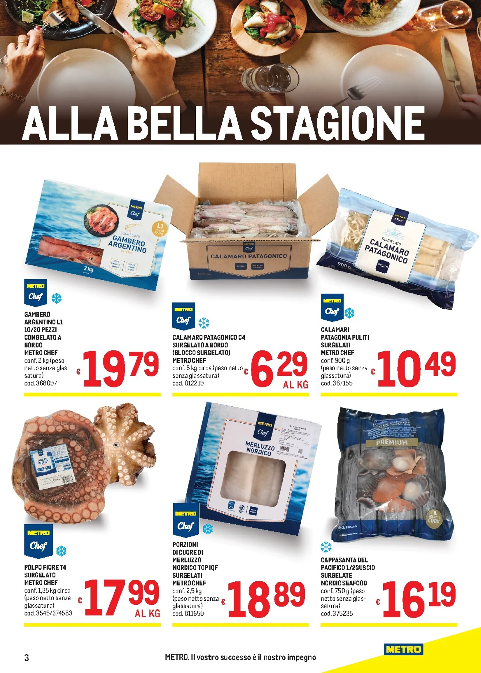 La sezione dei surgelati ittici offre soluzioni perfette per un nuovo menù di mare. Troviamo il Gambero Argentino a 19,79€, il Calamaro Patagonico a 6,29€ al kg e il Polpo Fiore a 17,99€ al kg. Queste offerte Metro Chef uniscono qualità e praticità. Sono disponibili anche le porzioni di Merluzzo Nordico e la gustosa Cappasanta del Pacifico, per piatti rapidi e di sicuro effetto.