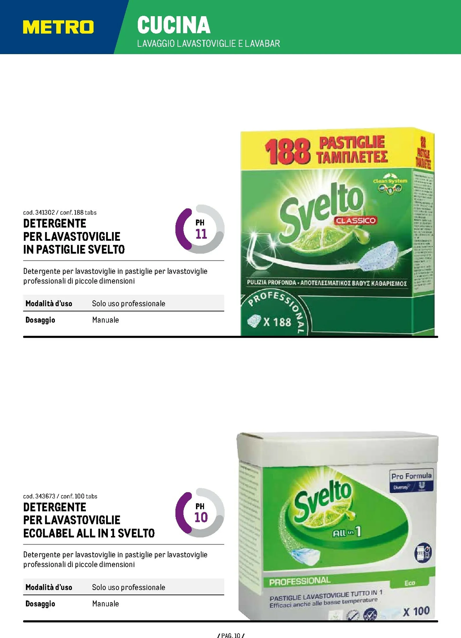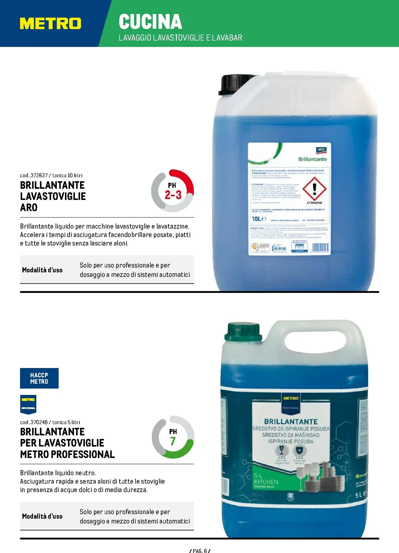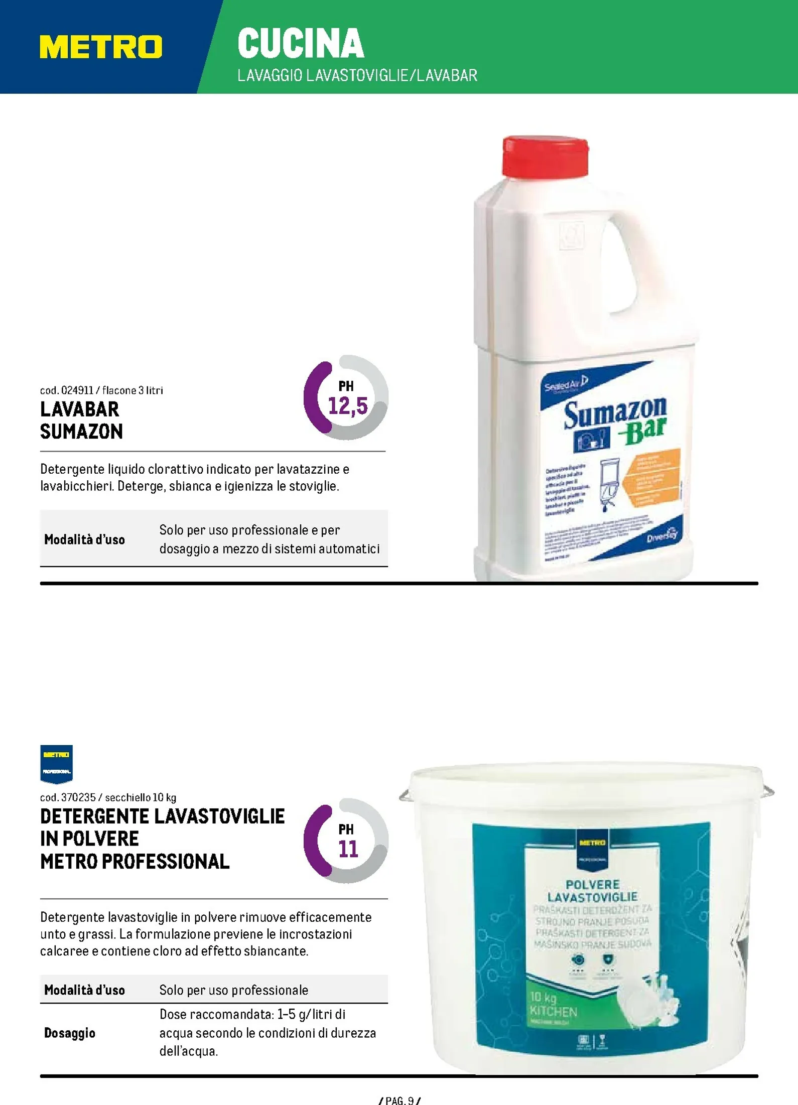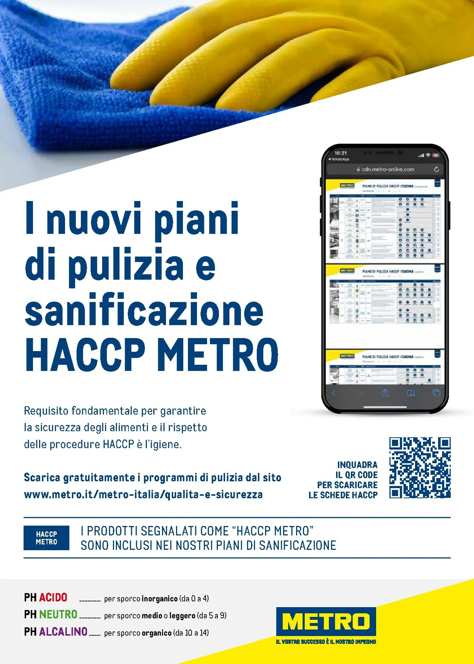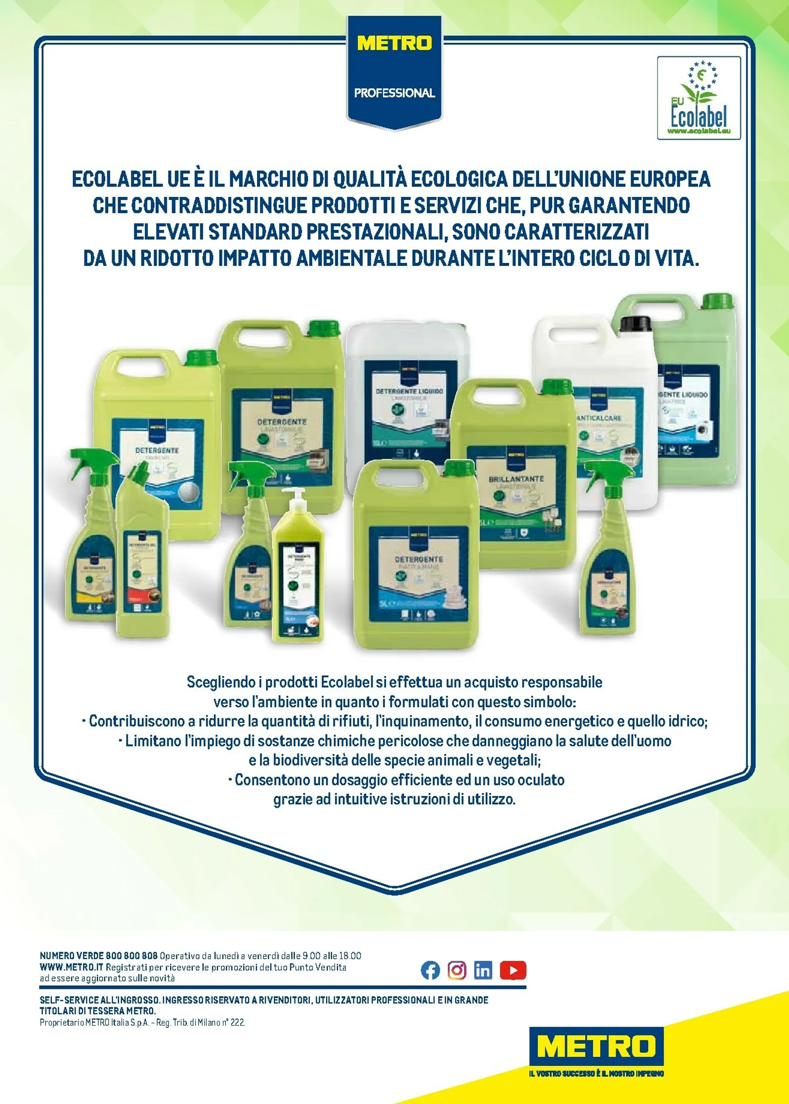Tra le pagine si trovano offerte su prodotti ad alte prestazioni, come il Detergente Lavastoviglie ARO con pH 13, perfetto contro lo sporco difficile, e il Cloroattivo Metro Professional. Metro promuove anche la sostenibilità attraverso la linea certificata Ecolabel UE, che unisce efficacia pulente e ridotto impatto ambientale. Queste soluzioni sono ideali per chi cerca performance professionali nel rispetto del pianeta e della salute.