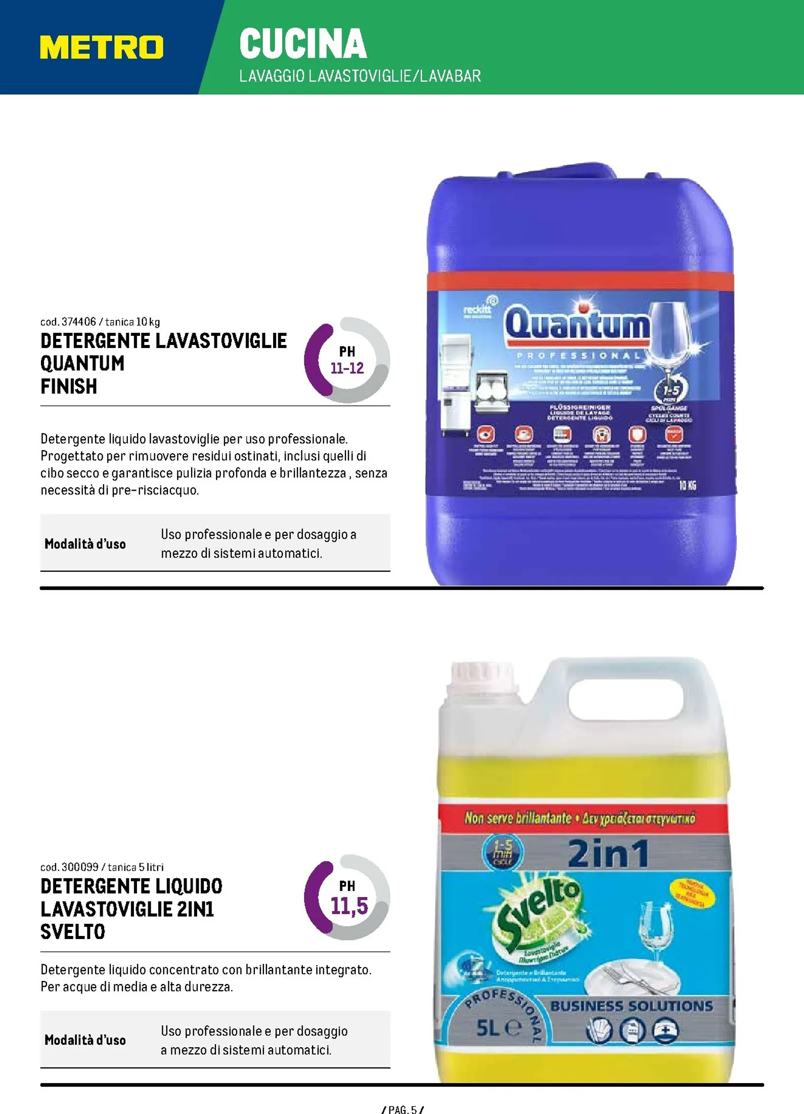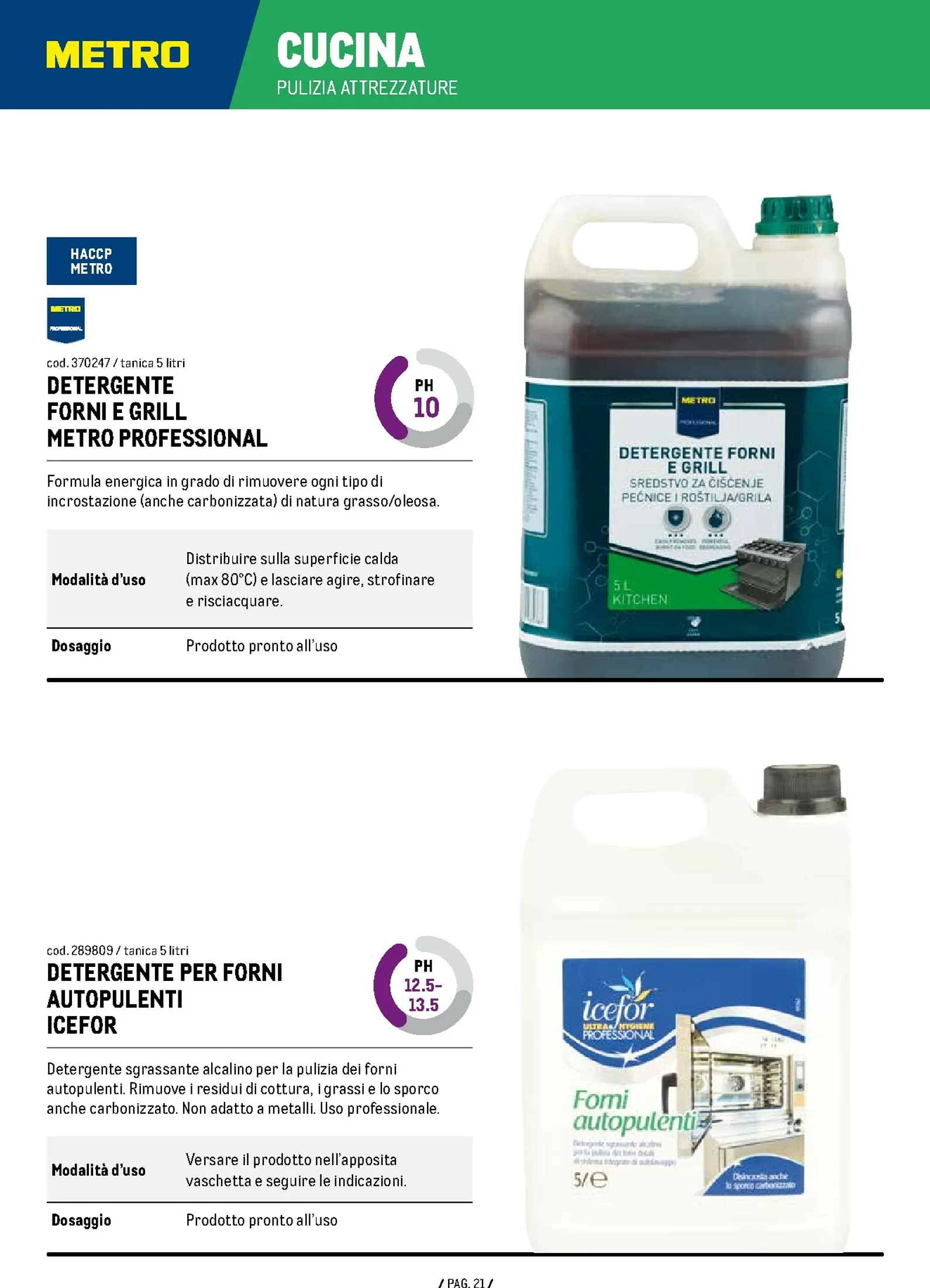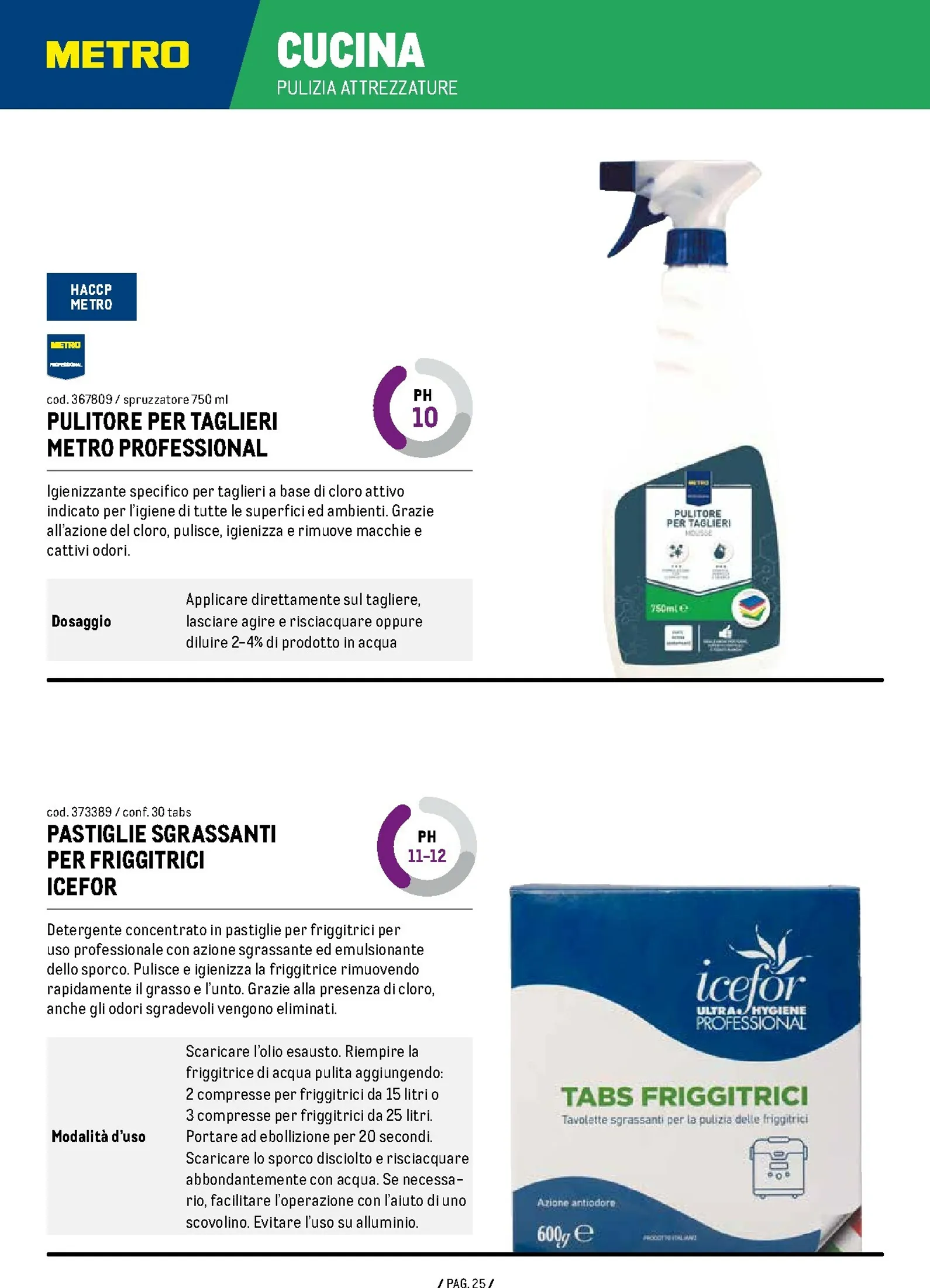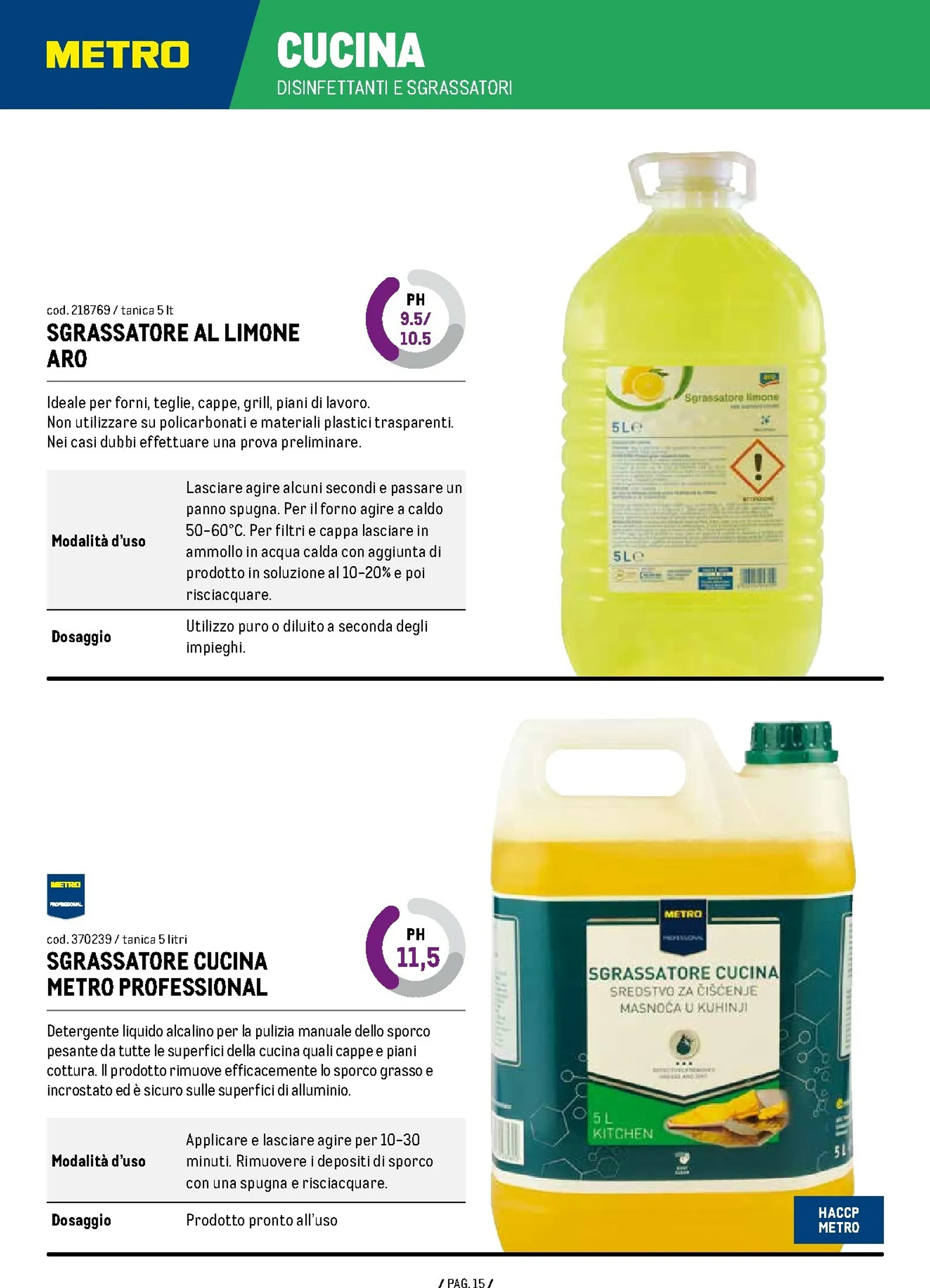 Tra le pagine si trovano offerte su prodotti ad alte prestazioni, come il Detergente Lavastoviglie ARO con pH 13, perfetto contro lo sporco difficile, e il Cloroattivo Metro Professional. Metro promuove anche la sostenibilità attraverso la linea certificata Ecolabel UE, che unisce efficacia pulente e ridotto impatto ambientale. Queste soluzioni sono ideali per chi cerca performance professionali nel rispetto del pianeta e della salute.