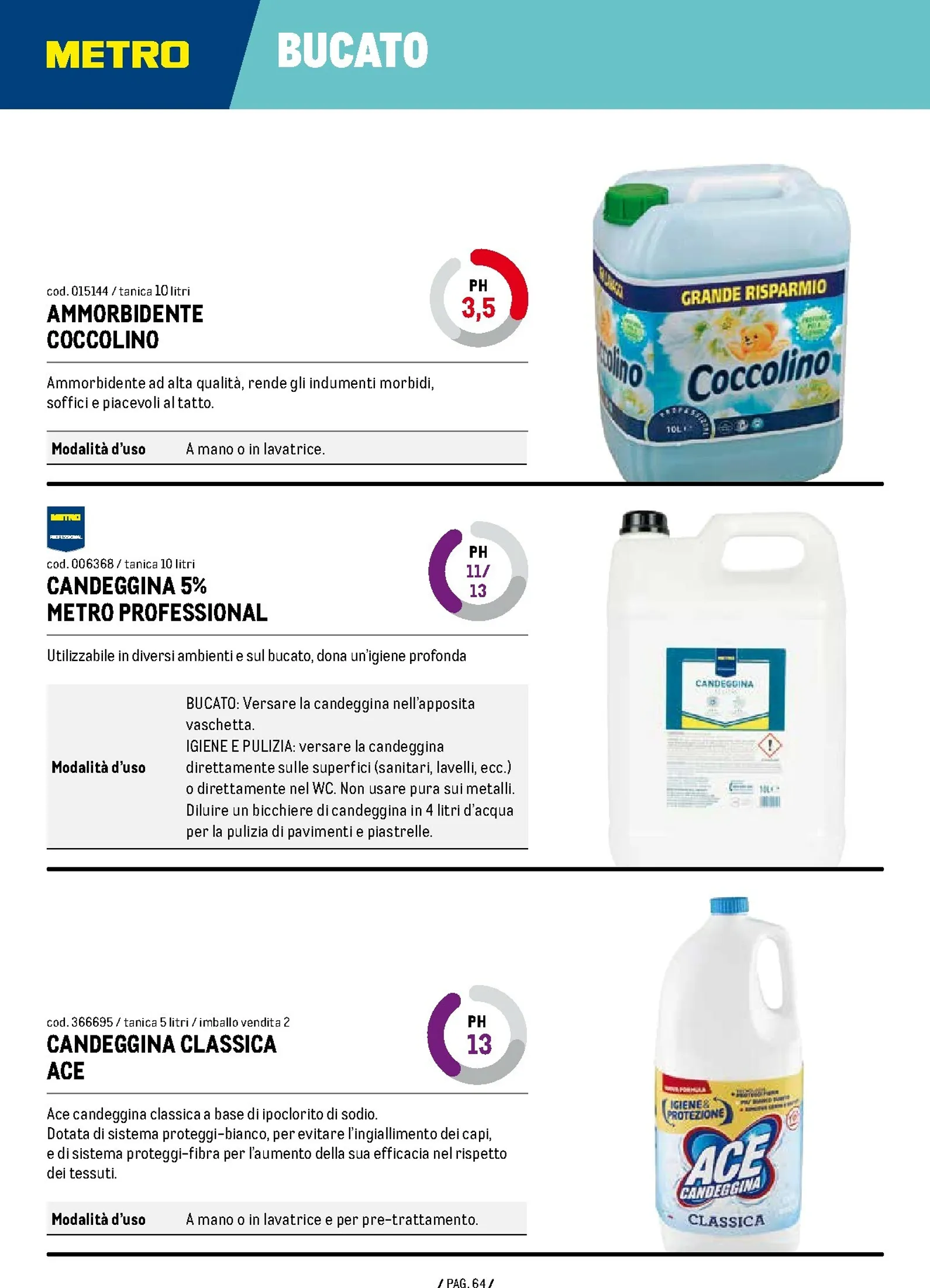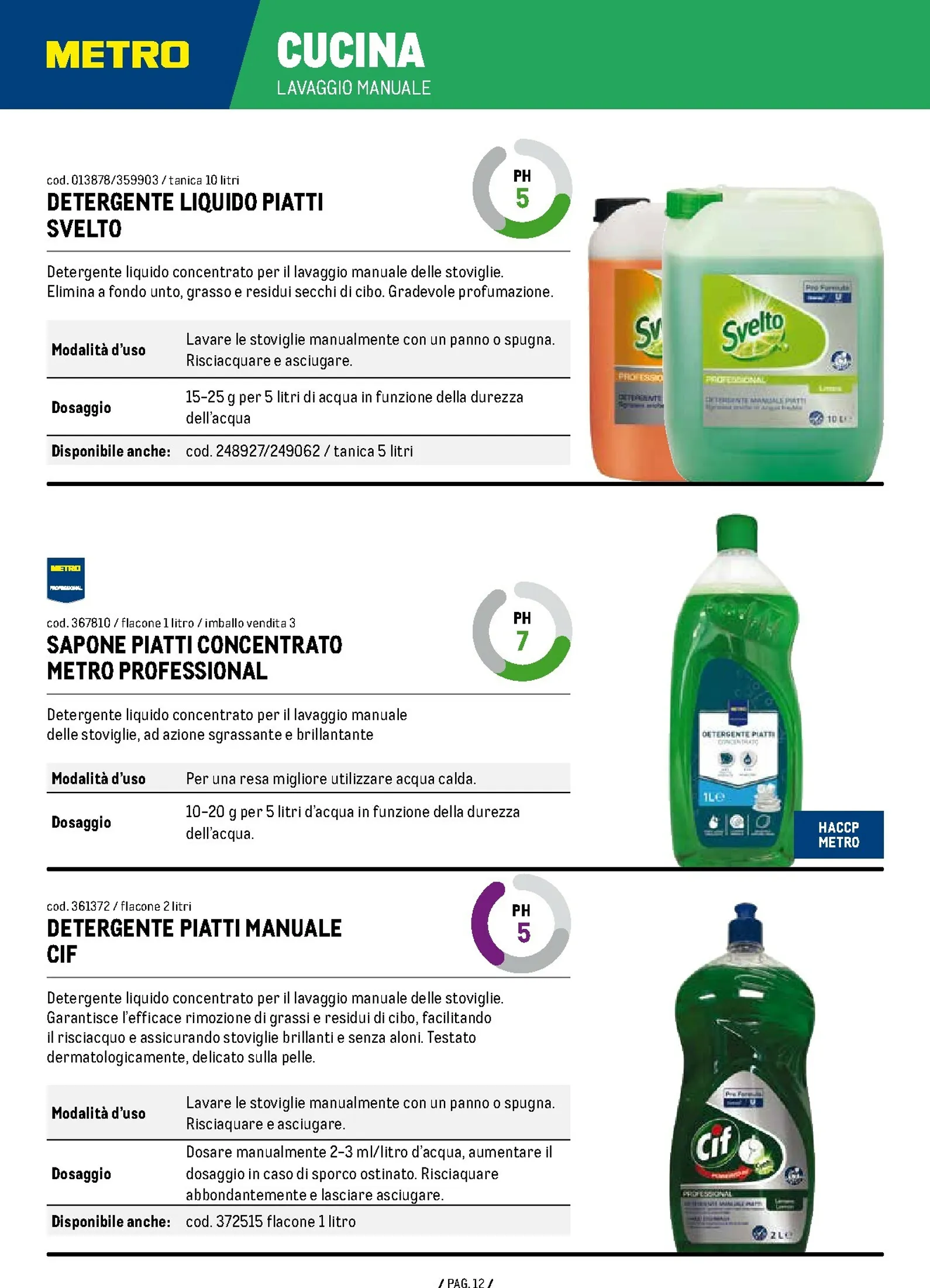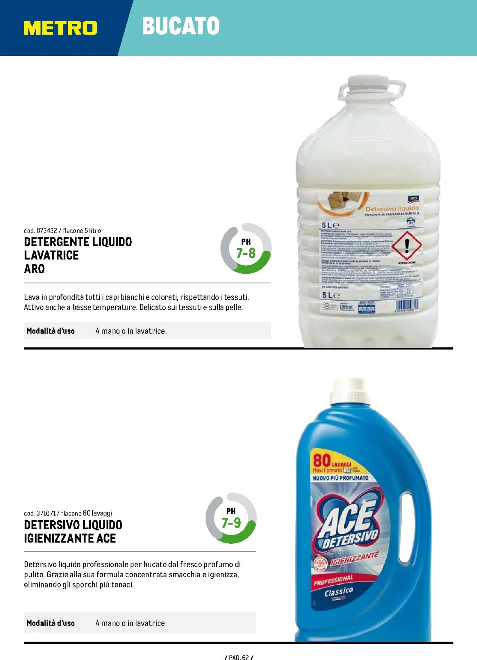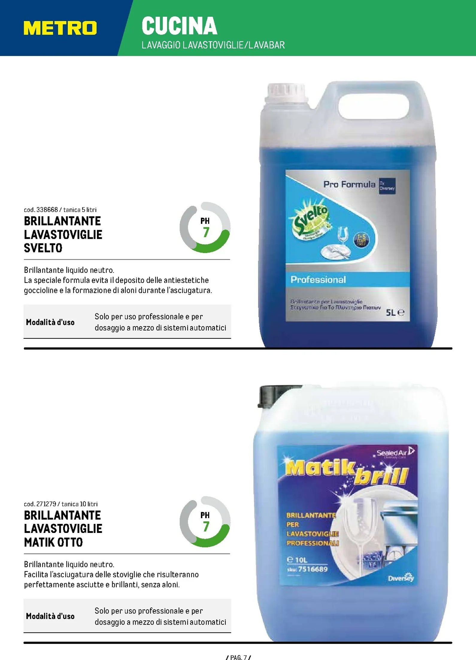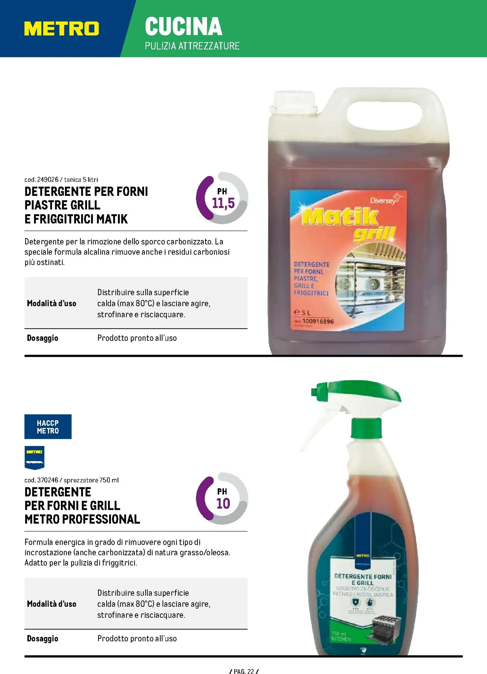 Tra le pagine si trovano offerte su prodotti ad alte prestazioni, come il Detergente Lavastoviglie ARO con pH 13, perfetto contro lo sporco difficile, e il Cloroattivo Metro Professional. Metro promuove anche la sostenibilità attraverso la linea certificata Ecolabel UE, che unisce efficacia pulente e ridotto impatto ambientale. Queste soluzioni sono ideali per chi cerca performance professionali nel rispetto del pianeta e della salute.