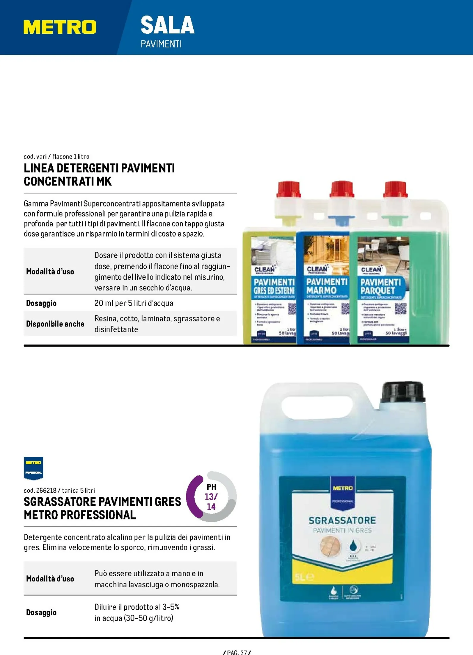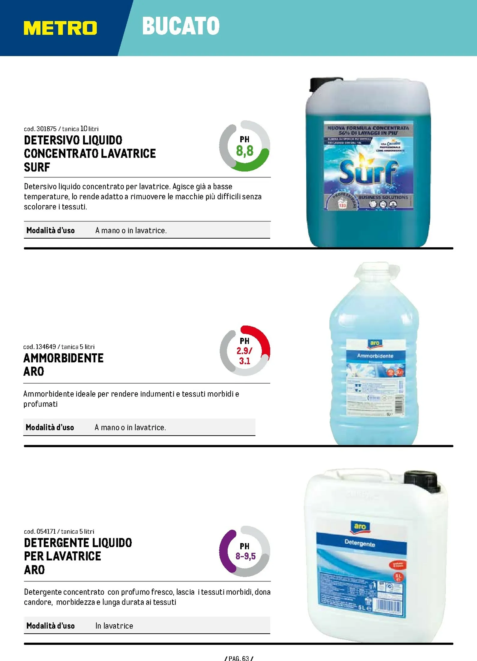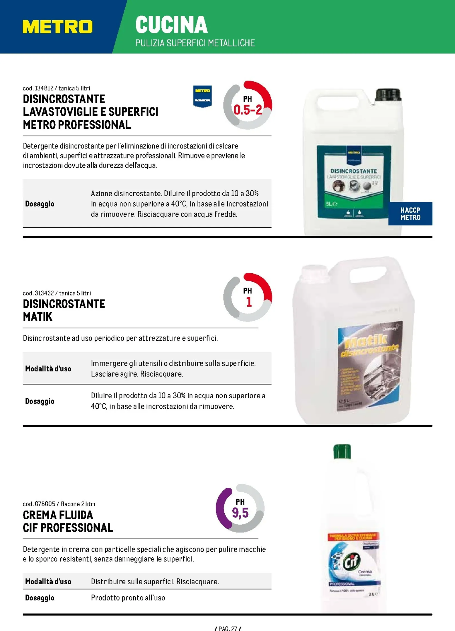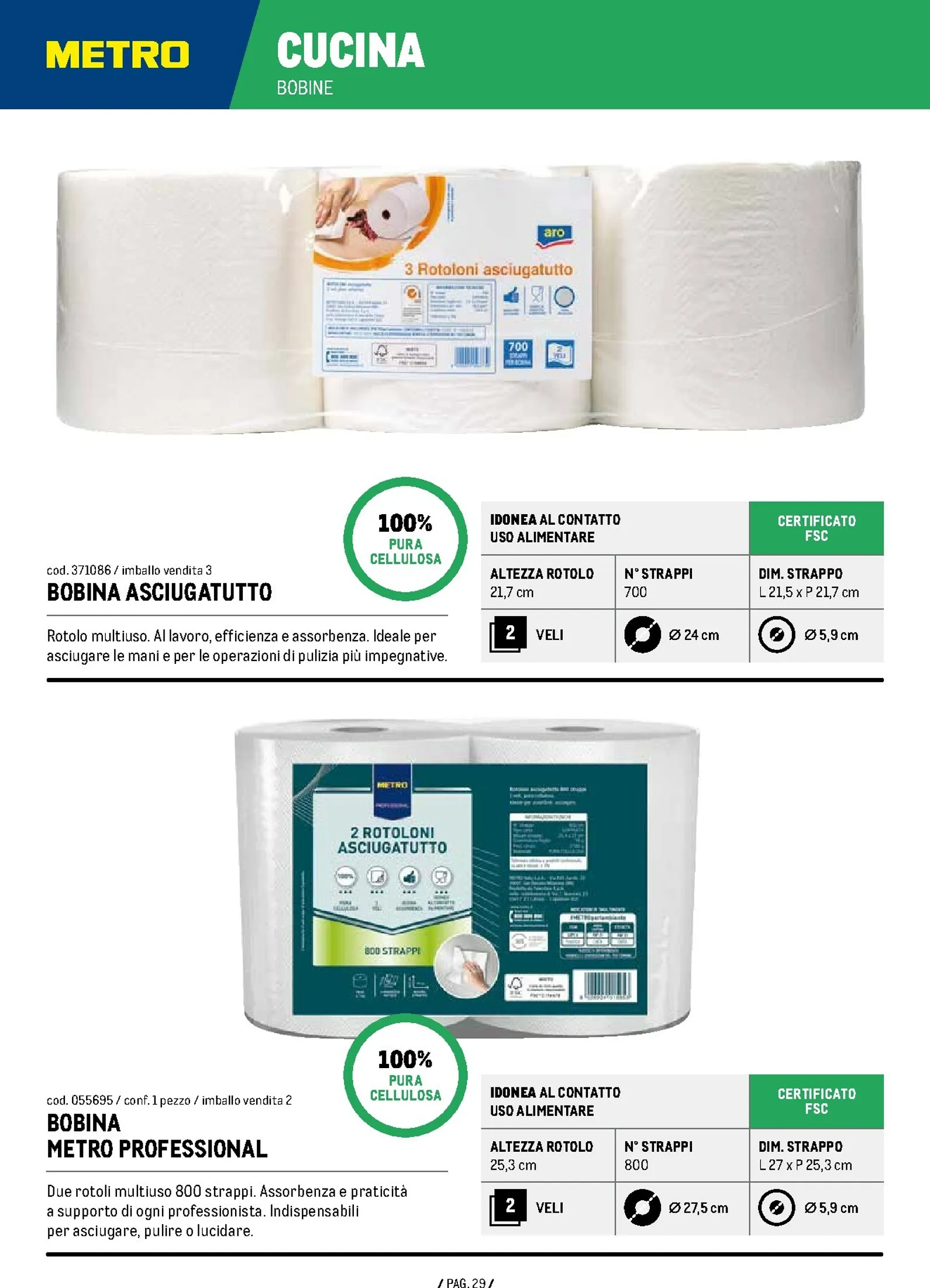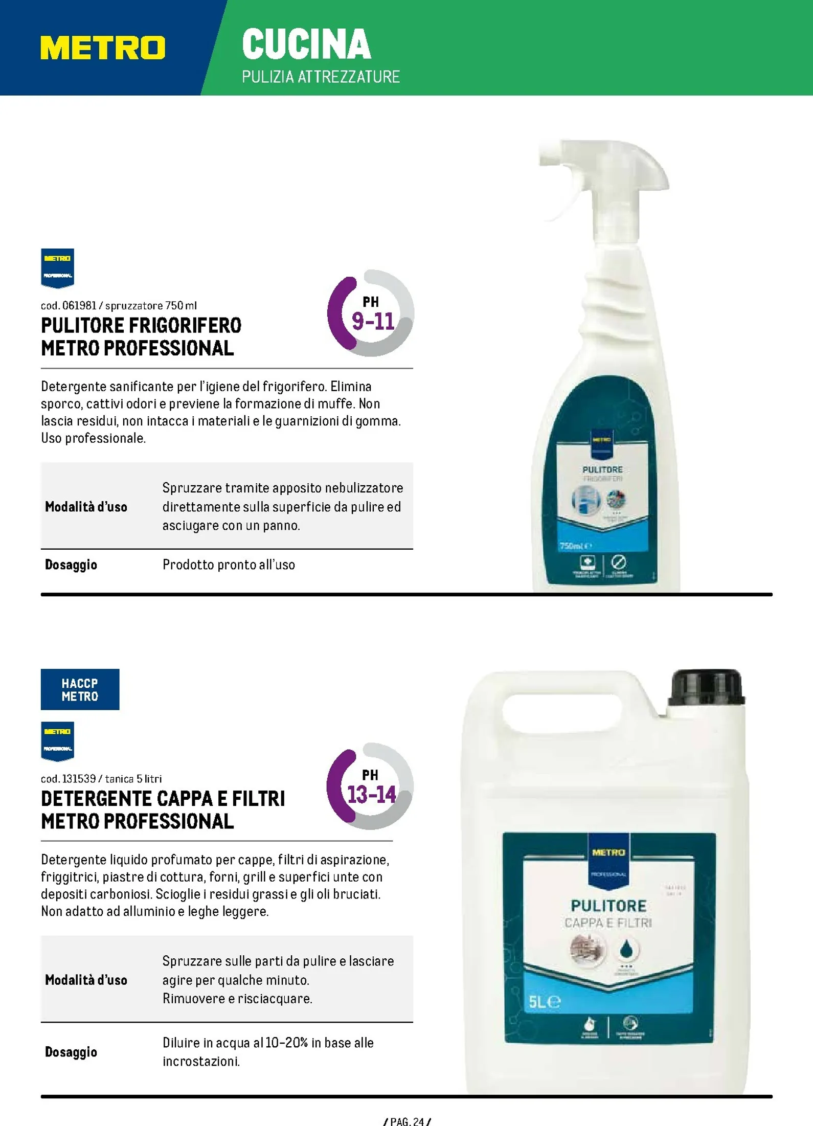 Tra le pagine si trovano offerte su prodotti ad alte prestazioni, come il Detergente Lavastoviglie ARO con pH 13, perfetto contro lo sporco difficile, e il Cloroattivo Metro Professional. Metro promuove anche la sostenibilità attraverso la linea certificata Ecolabel UE, che unisce efficacia pulente e ridotto impatto ambientale. Queste soluzioni sono ideali per chi cerca performance professionali nel rispetto del pianeta e della salute.