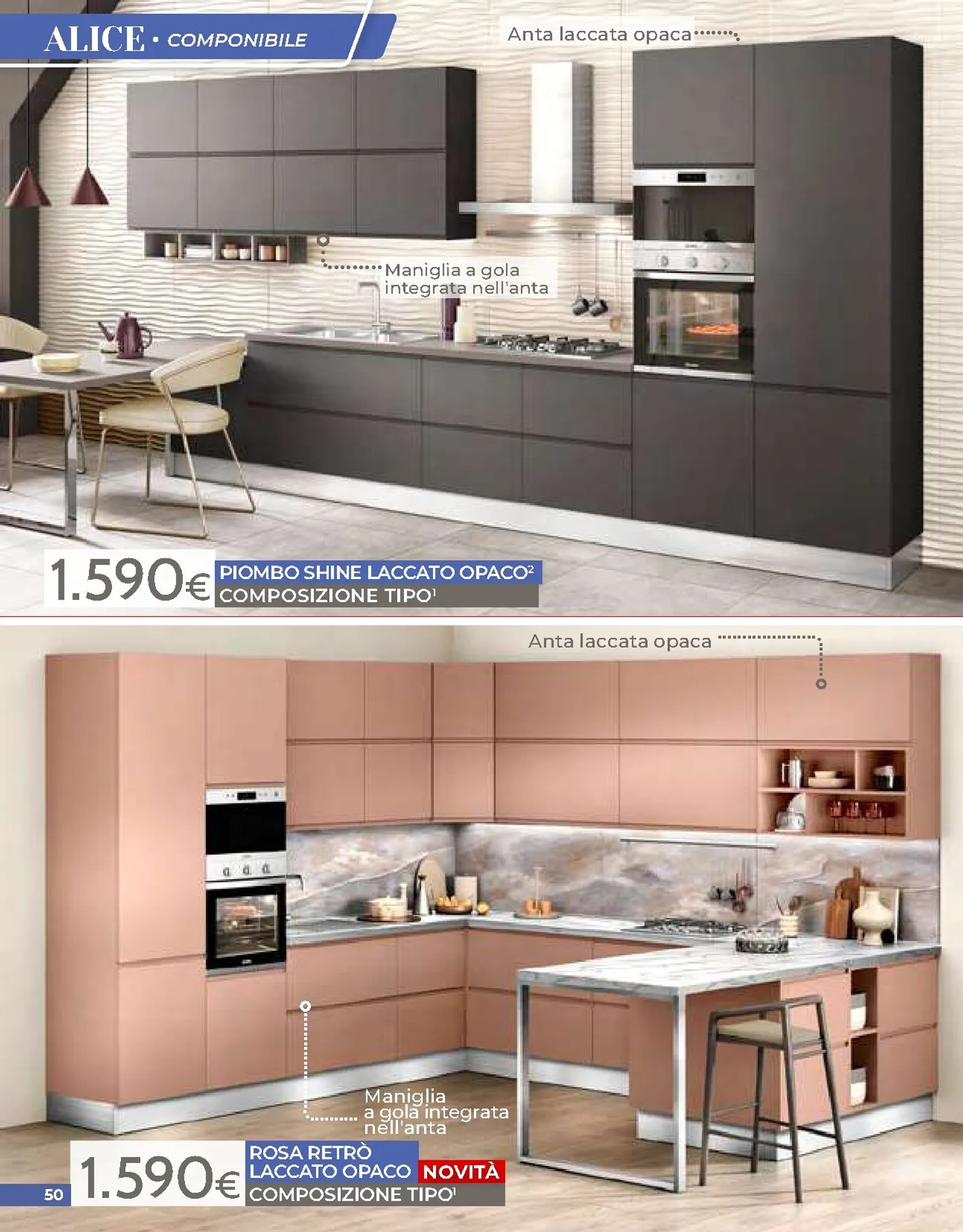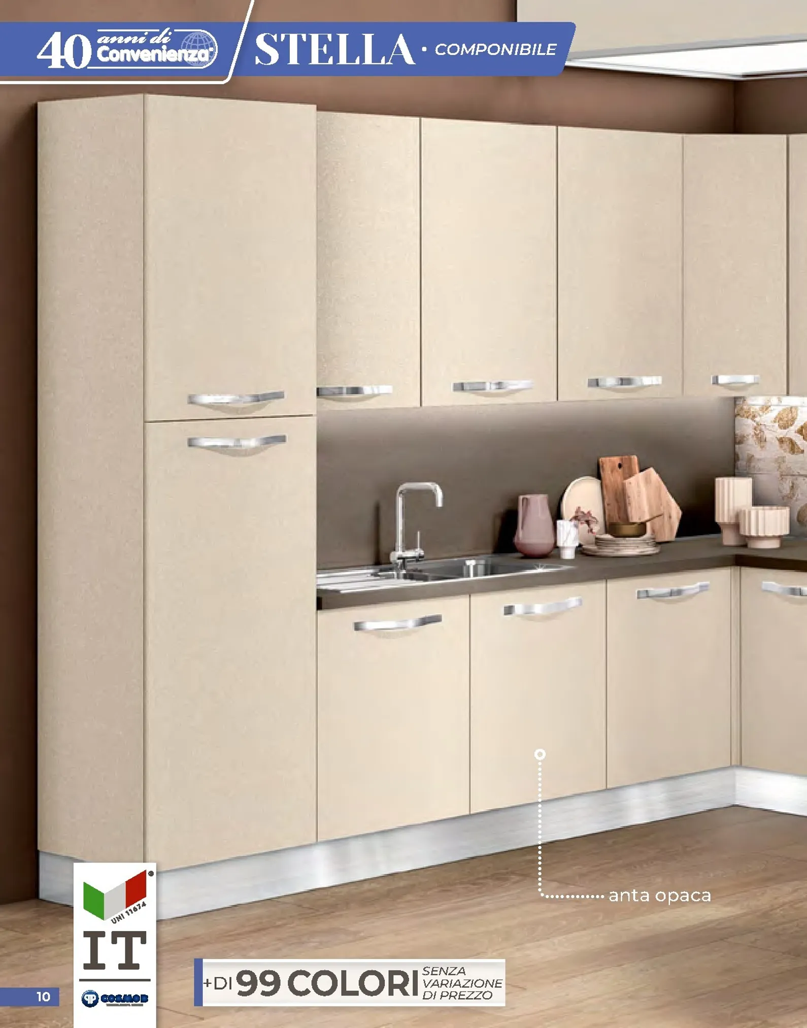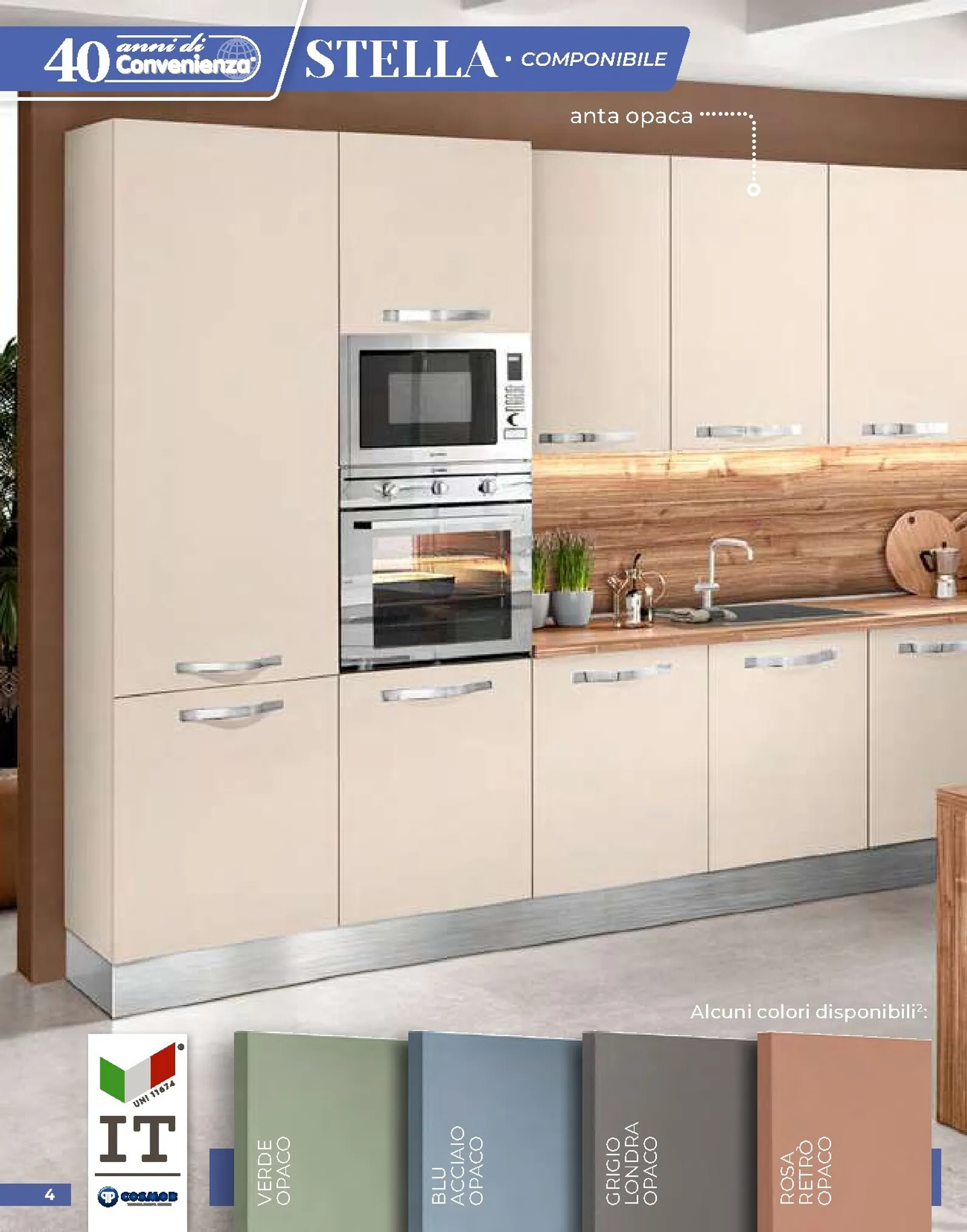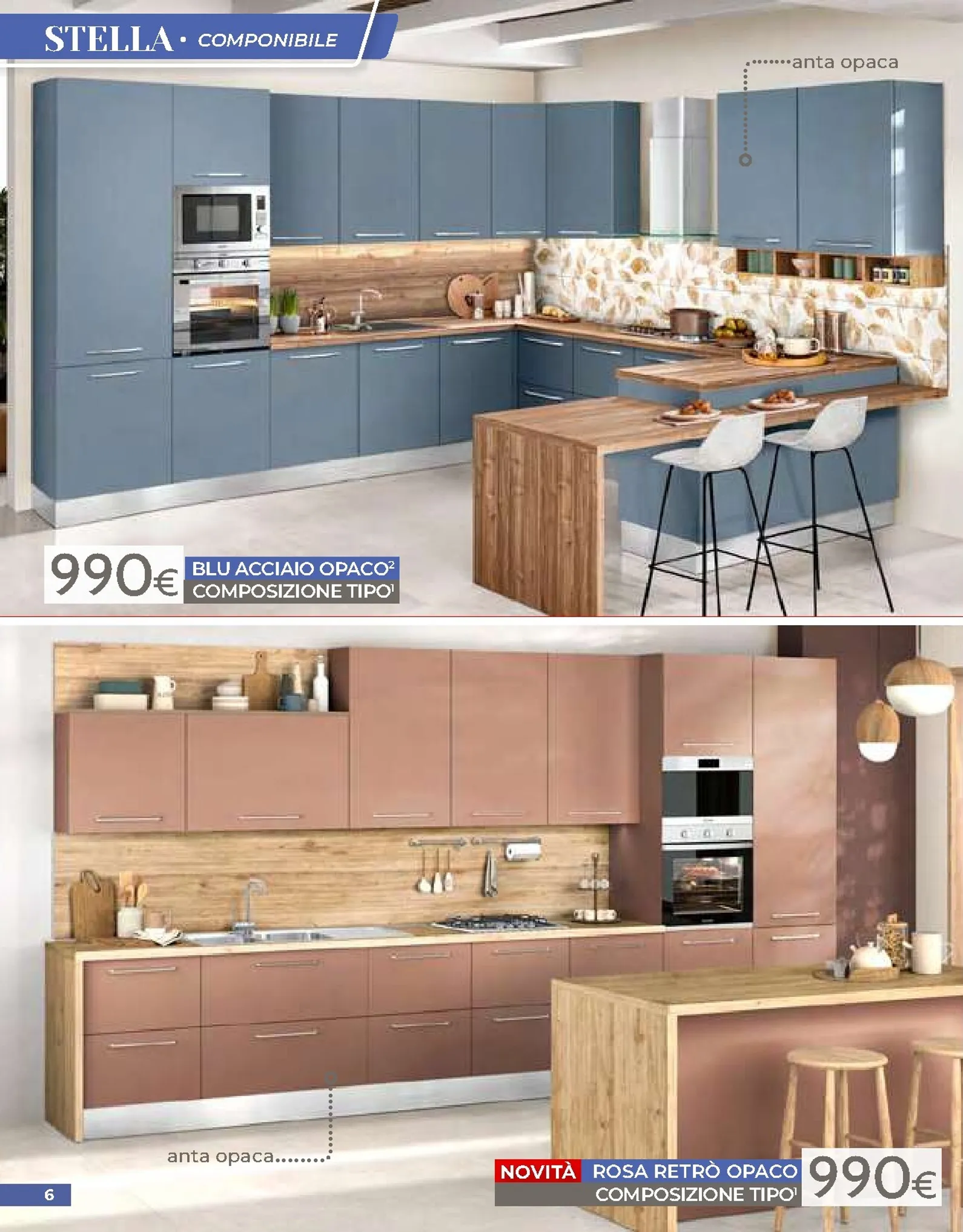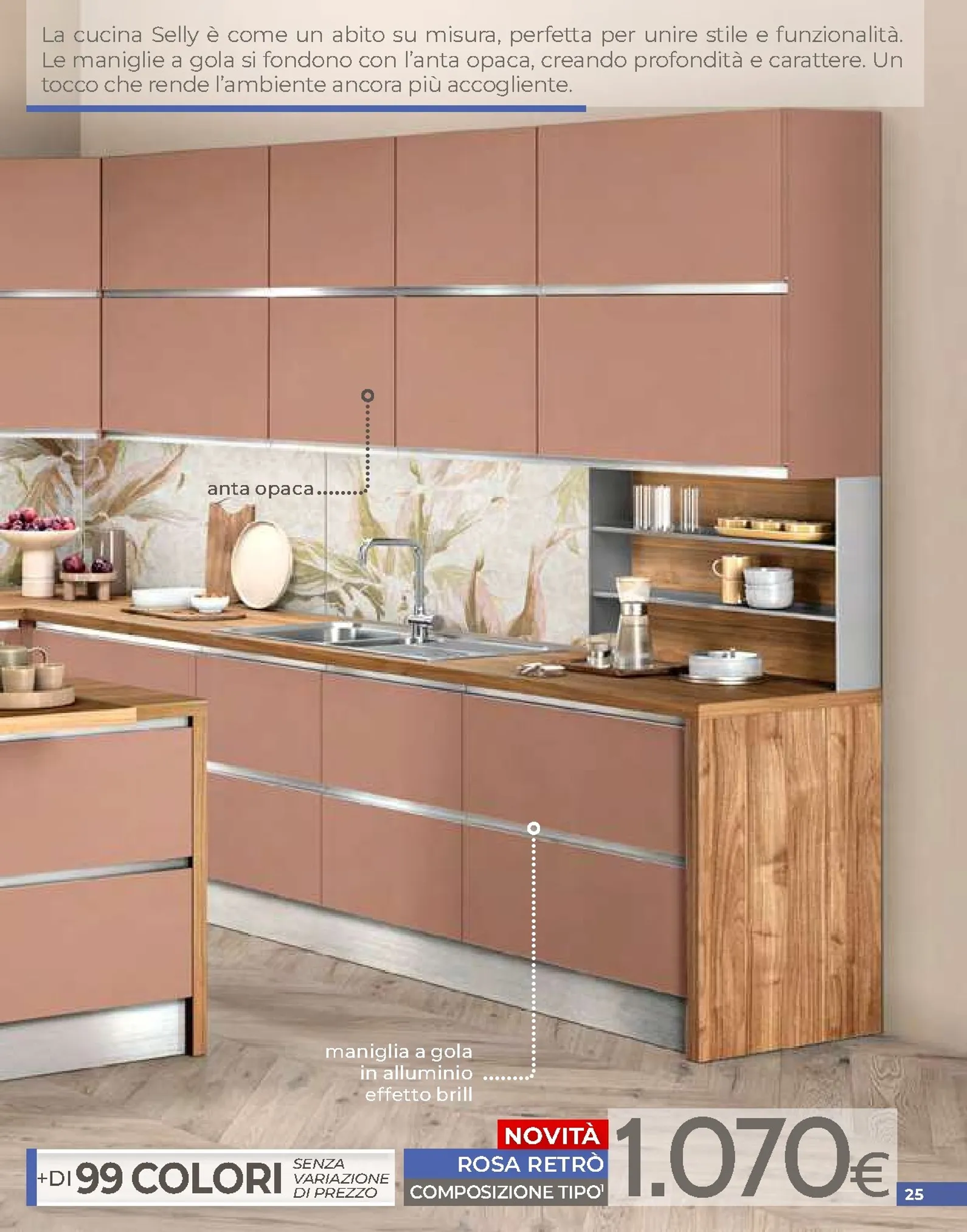 Tra le proposte spiccano modelli dal design contemporaneo e accattivante. La cucina Stella, nella sua elegante finitura Verde Opaco, è disponibile a soli 990€ per la composizione tipo, unendo estetica e funzionalità. Per chi cerca una novità assoluta, la cucina Selly in Rosa Retrò Opaco a 1.070€ offre un tocco di originalità e calore. Entrambe le soluzioni vantano la qualità e lo stile del design italiano, garantendo un ambiente accogliente, moderno e pratico per la vita di tutti i giorni.