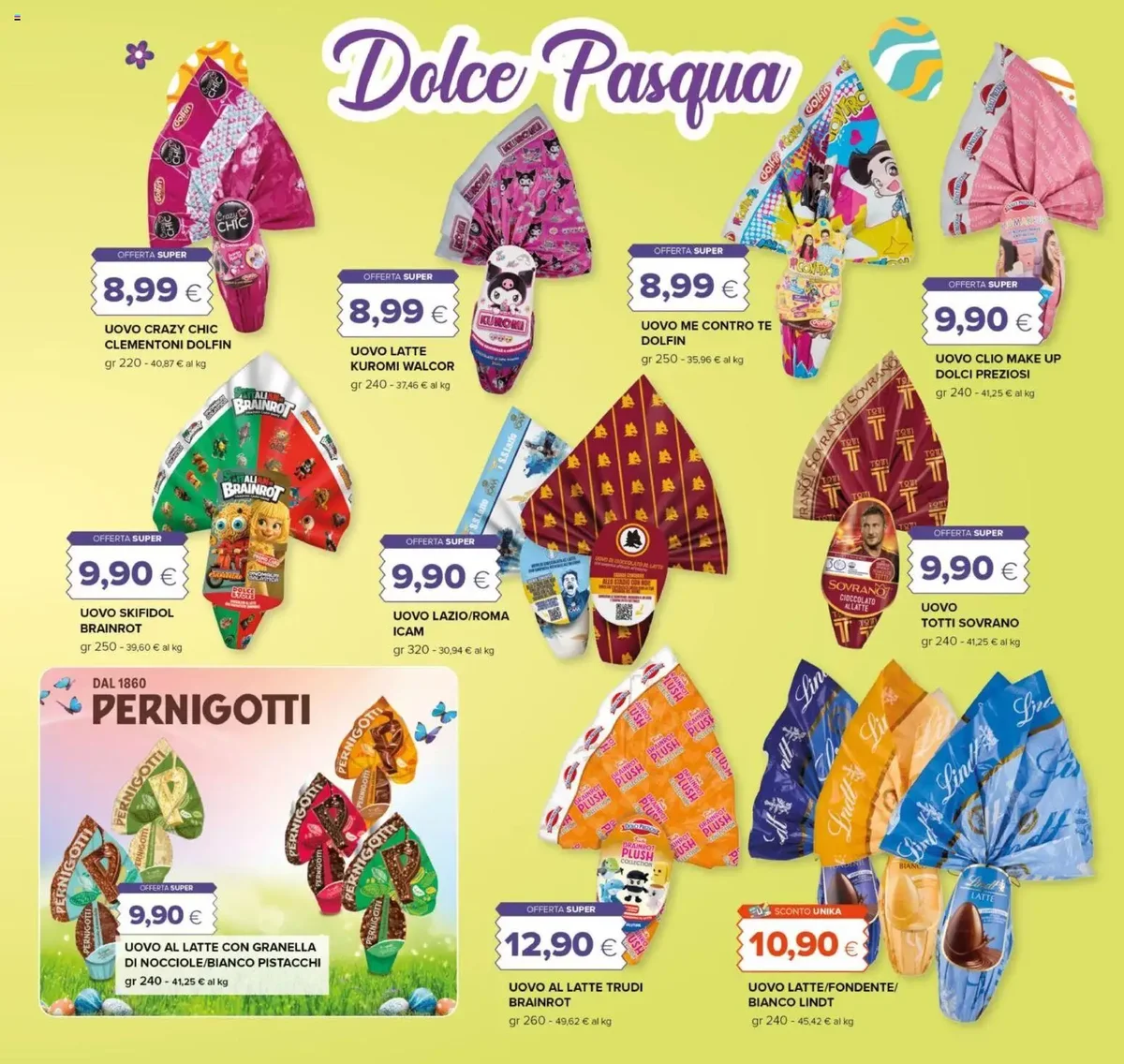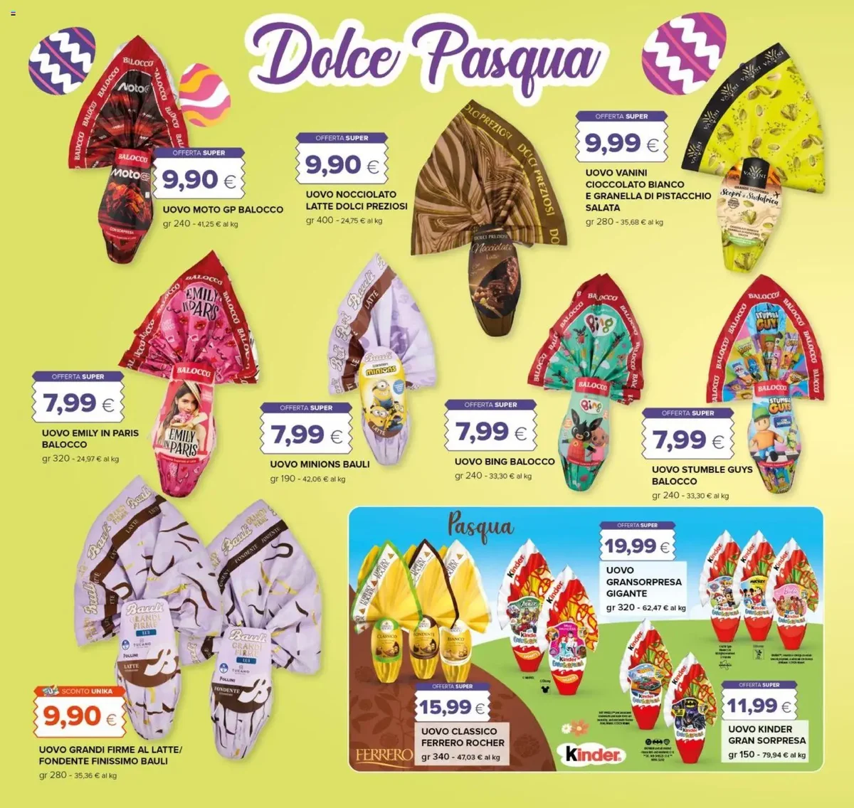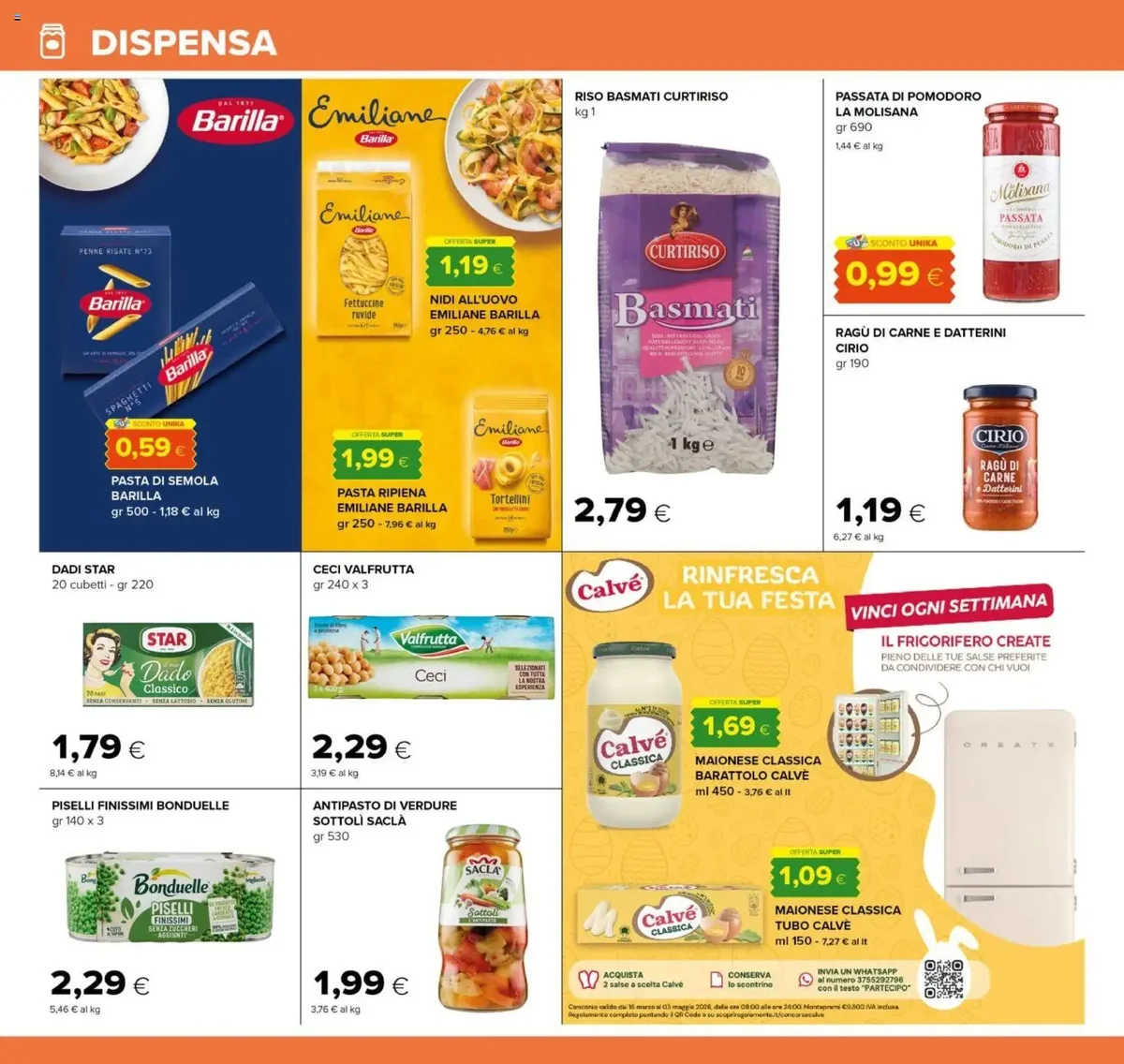 Tra le proposte più interessanti, troviamo il Grana Padano DOP stagionatura 20 mesi a soli 9,90 €, perfetto per arricchire ogni piatto. Non mancano le offerte sulle basi della cucina italiana, come l'Olio Extra Vergine di Oliva Achille Clemente da 1 litro a 4,79 € e la Passata di Pomodoro La Molisana da 690 gr a 0,99 €. Per gli amanti del caffè, il Caffè Lavazza Qualità Rossa 250 gr x 4 è disponibile a 13,95 €. Le specialità pasquali sono protagoniste: l'Uovo Grandi Firme Latte/Fondente Finissimo Bauli da 280 gr a 9,90 €, la Colomba Pistacchio e Cioccolato Bistefani da 700 gr a 5,49 €, e la Colomba Classica/Senza Canditi Balocco da 700 gr a soli 2,99 €. Non dimentichiamo gli Ovetti Witor's da 500 gr a 3,49 €, ideali per i più piccoli.
