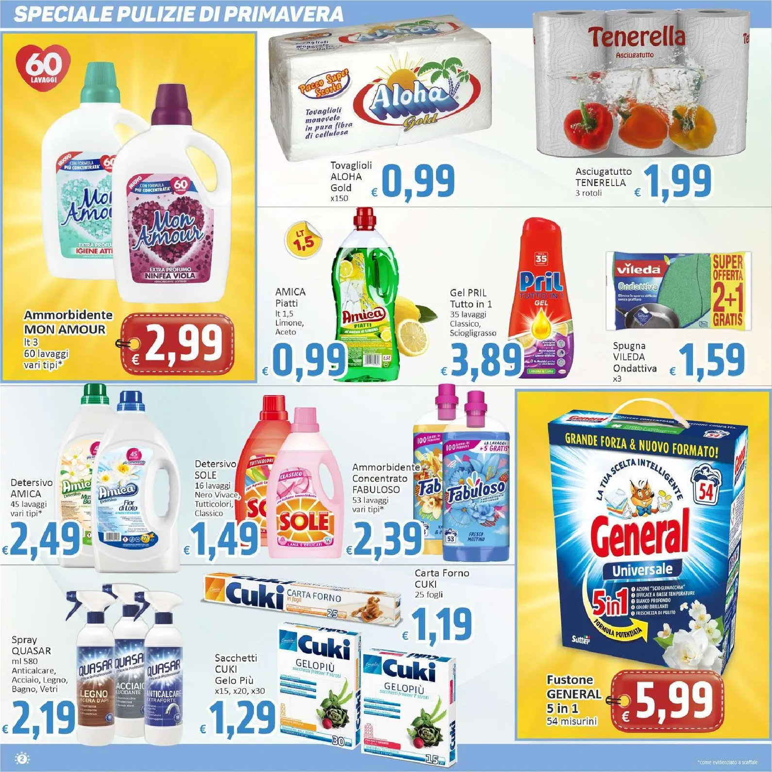Con l’arrivo della bella stagione, Paghi Poco dedica un’intera sezione alle pulizie di primavera, con catalogo e offerte su un vasto assortimento di detergenti e prodotti per la cura della casa. Per un bucato impeccabile e profumato, il detersivo liquido ACE in formato da 81 lavaggi è proposto a 6,49 €, mentre il fustone General Universal 5 in 1 da 54 misurini è disponibile a 5,99 €. La pulizia dei pavimenti diventa facile ed economica grazie a Spic & Span, in vendita a soli 0,99 €. Anche i piccoli dettagli fanno la differenza, come i tovaglioli Aloha Gold a 0,99 € e l’asciugatutto Tenerella a 1,99 €, per una cucina sempre in ordine e pronta all’uso.