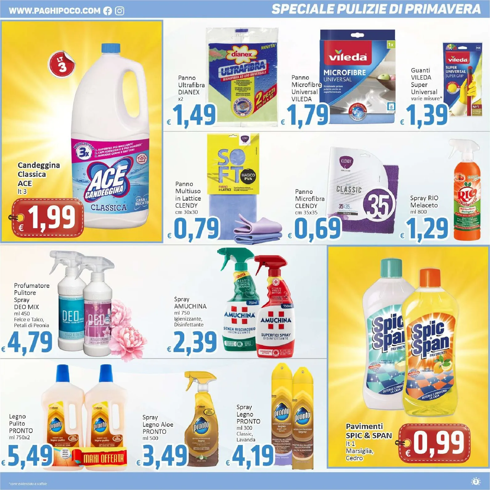 Le catalogo e offerte continuano con soluzioni per ogni superficie. La candeggina classica ACE da 3 litri assicura un’igiene profonda a 1,99 €, mentre per una disinfezione rapida c’è lo spray Amuchina a 2,39 €. La cura dei mobili è garantita dai prodotti della linea Pronto, con lo spray Legno Aloe a 3,49 €. Questo catalogo è ricco di soluzioni per rendere la casa un luogo accogliente e splendente. Consultare tutte le proposte del Paghi Poco Volantino dal 07/04/2026 è il modo migliore per approfittare di ogni sconto. Per scoprire tutte queste e altre catalogo e offerte, sfoglia il nuovo Paghi Poco Volantino e preparati a un risparmio senza precedenti.
