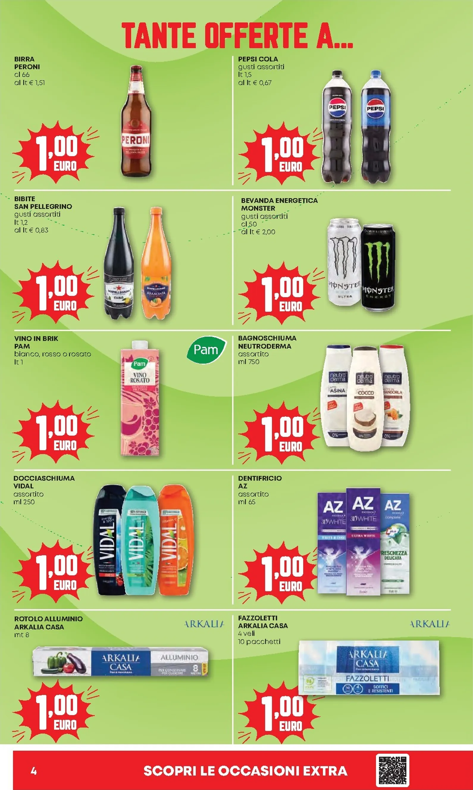 Oltre alle nuovo offerte da un euro, il volantino presenta offerte su prodotti di largo consumo. Spicca l’acqua naturale Levissima in confezione da sei bottiglie a soli 2 euro, e l’anticalcare Viakal a 3 euro. Il reparto ortofrutta propone un nuovo assortimento con zucchine scure a 1,49€/kg fino al 13 aprile, seguite da fragole a 1,99€ la confezione dal 14 aprile. Anche il banco macelleria e formaggi offre qualità a prezzi bassi.