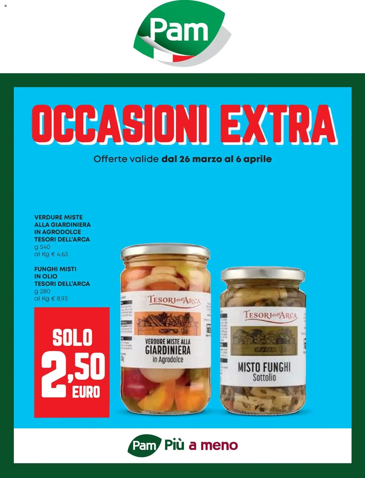 Ma le offerte non finiscono qui! Scopri anche le Verdure Miste alla Giardiniera in Agrodolce Tesori dell'Arca o i Funghi Misti in Olio, entrambi a soli €2,50, ideali per arricchire i tuoi piatti. Non dimenticare la Composta di Frutta Bio Pam a €2,95. Non perdere l'opportunità di fare scorta. Per scoprire tutte le incredibili promozioni del Volantino Pam dal 26.03.2026, visita Tutti i volantini Pam e pianifica la tua spesa intelligente.