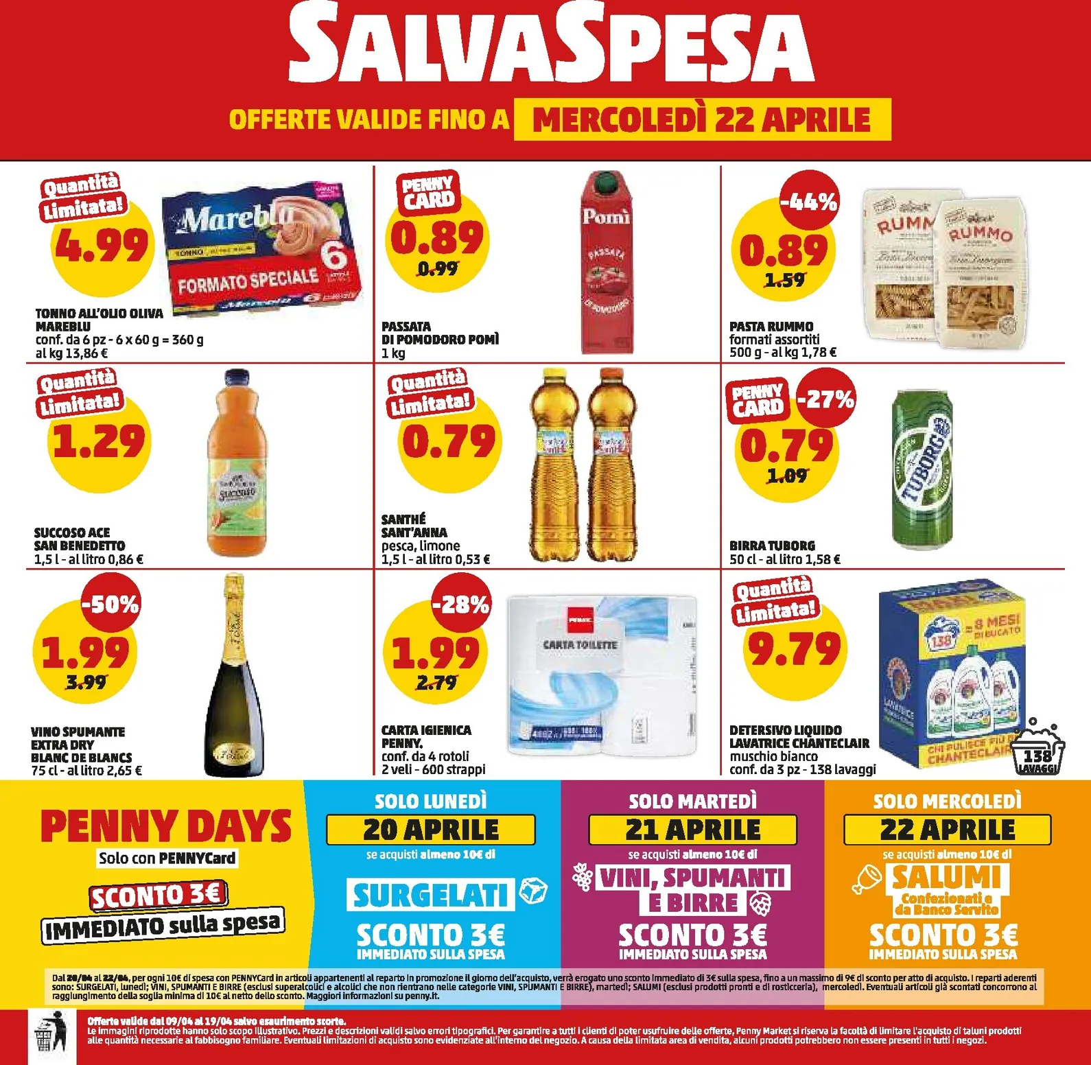 Non perdete la sezione “Salvaspesa”, con offerte valide fino al 22 Aprile, come la Pasta Rummo a 0,89€ e il Tonno Mareblu a 4,99€. Per una visione completa di tutte le catalogo e offerte e per non perdere nessuna occasione, vi invitiamo a consultare il nostro Penny Volantino dal 09/04/2026 aggiornato. Il Penny Volantino completo è sul nostro portale, ricco di nuove offerte per massimizzare il risparmio.