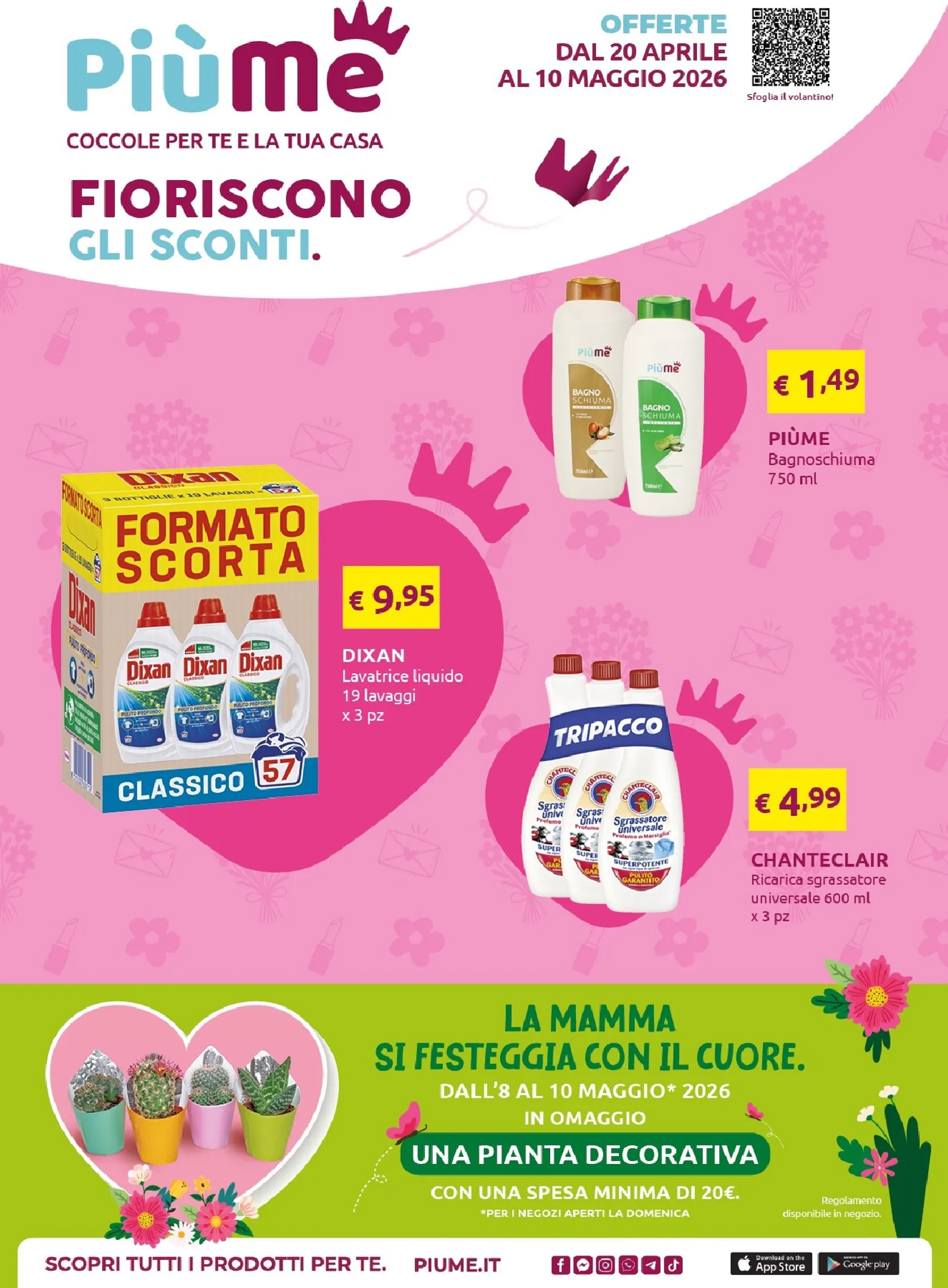 La primavera porta una ventata di freschezza con le nuovo offerte Piùme, valide dal 20 Aprile al 10 Maggio 2026. Il volantino “Fioriscono gli Sconti” è ricco di occasioni per casa e persona. Tra le migliori offerte, il Dixan liquido formato scorta da 57 lavaggi è a 9,95€. Per le pulizie, lo sgrassatore Chanteclair è in pack da tre. Esplorare il Piume Volantino dal 20/04/2026 è il modo ideale per pianificare gli acquisti e approfittare di queste opportunità.