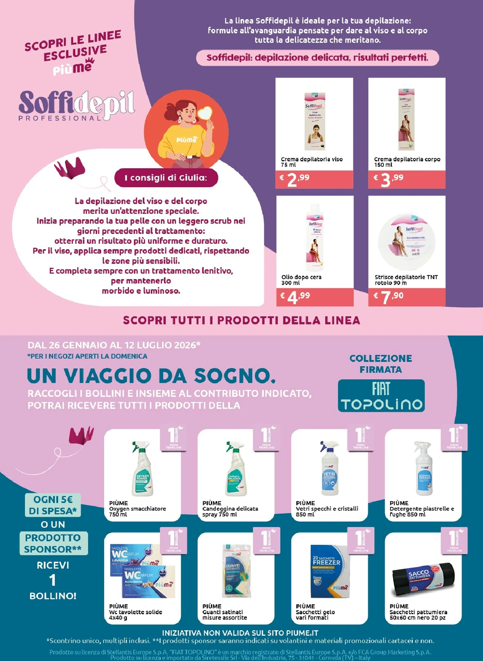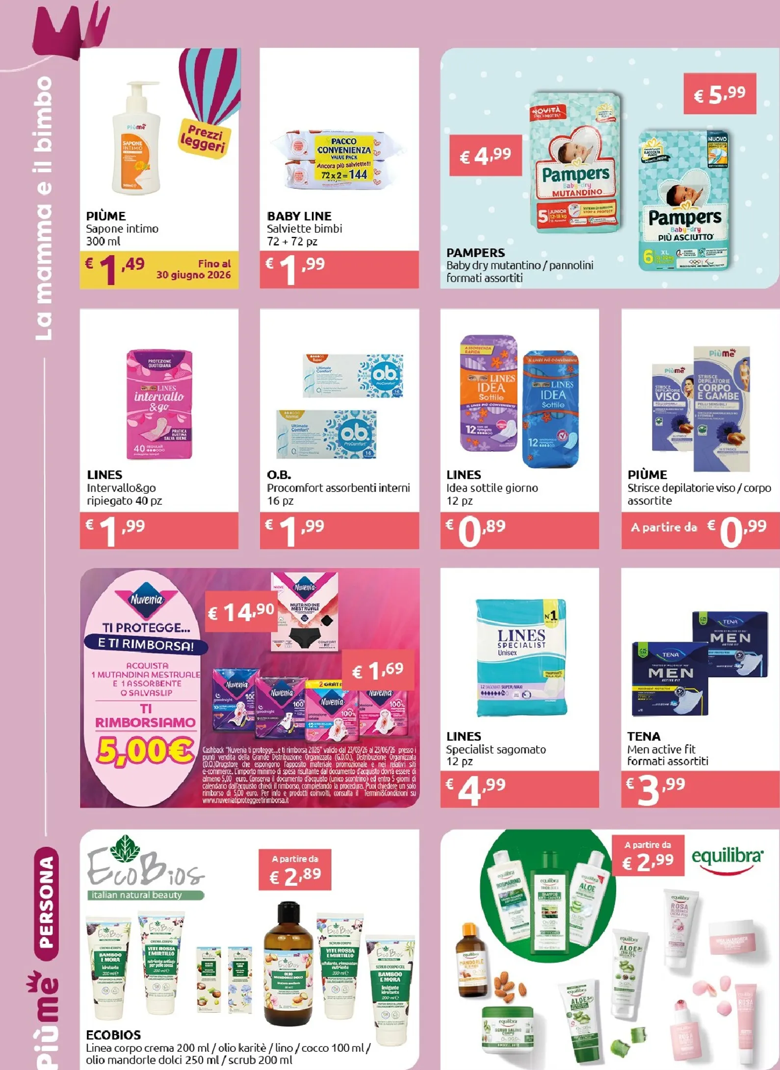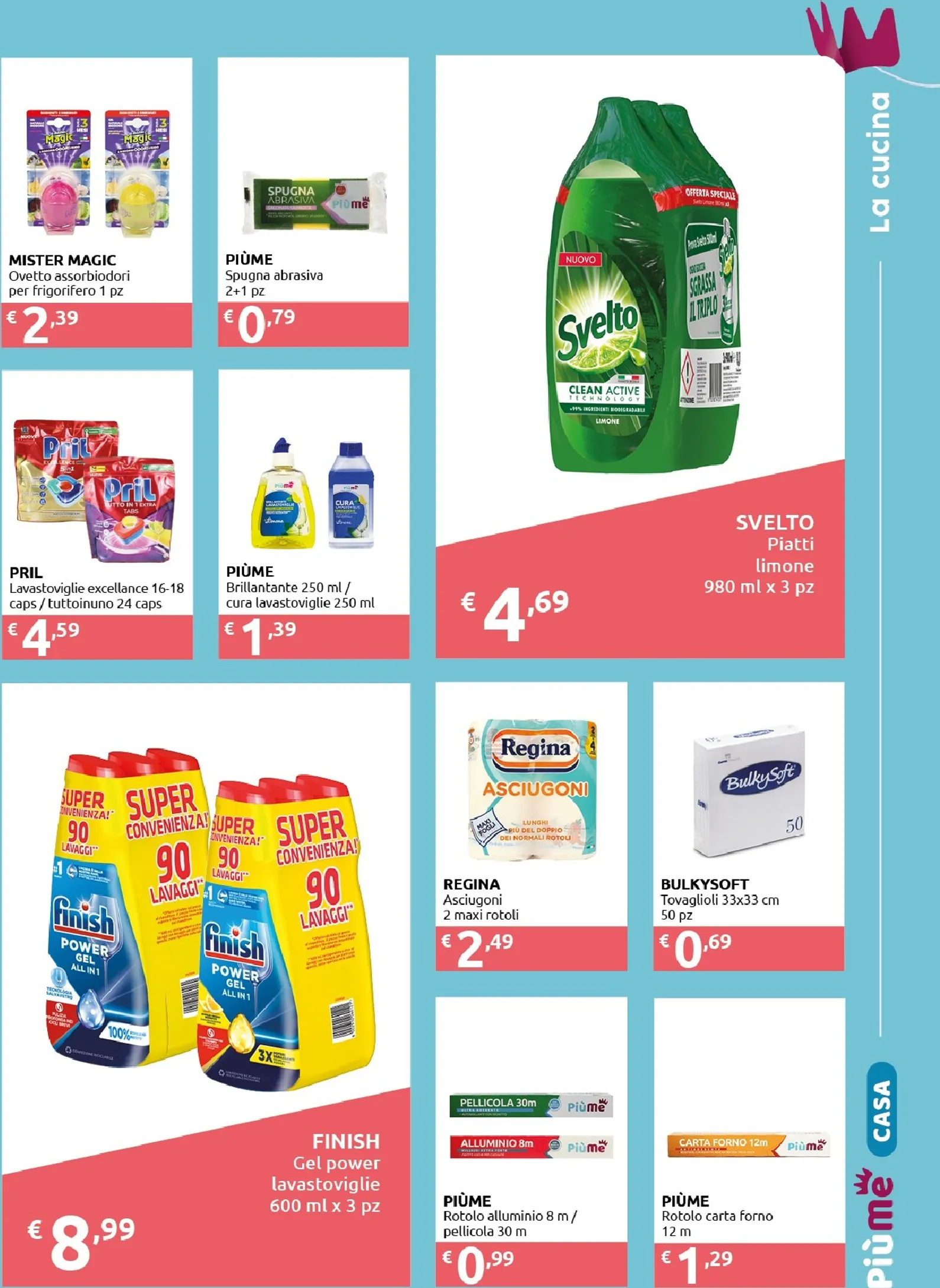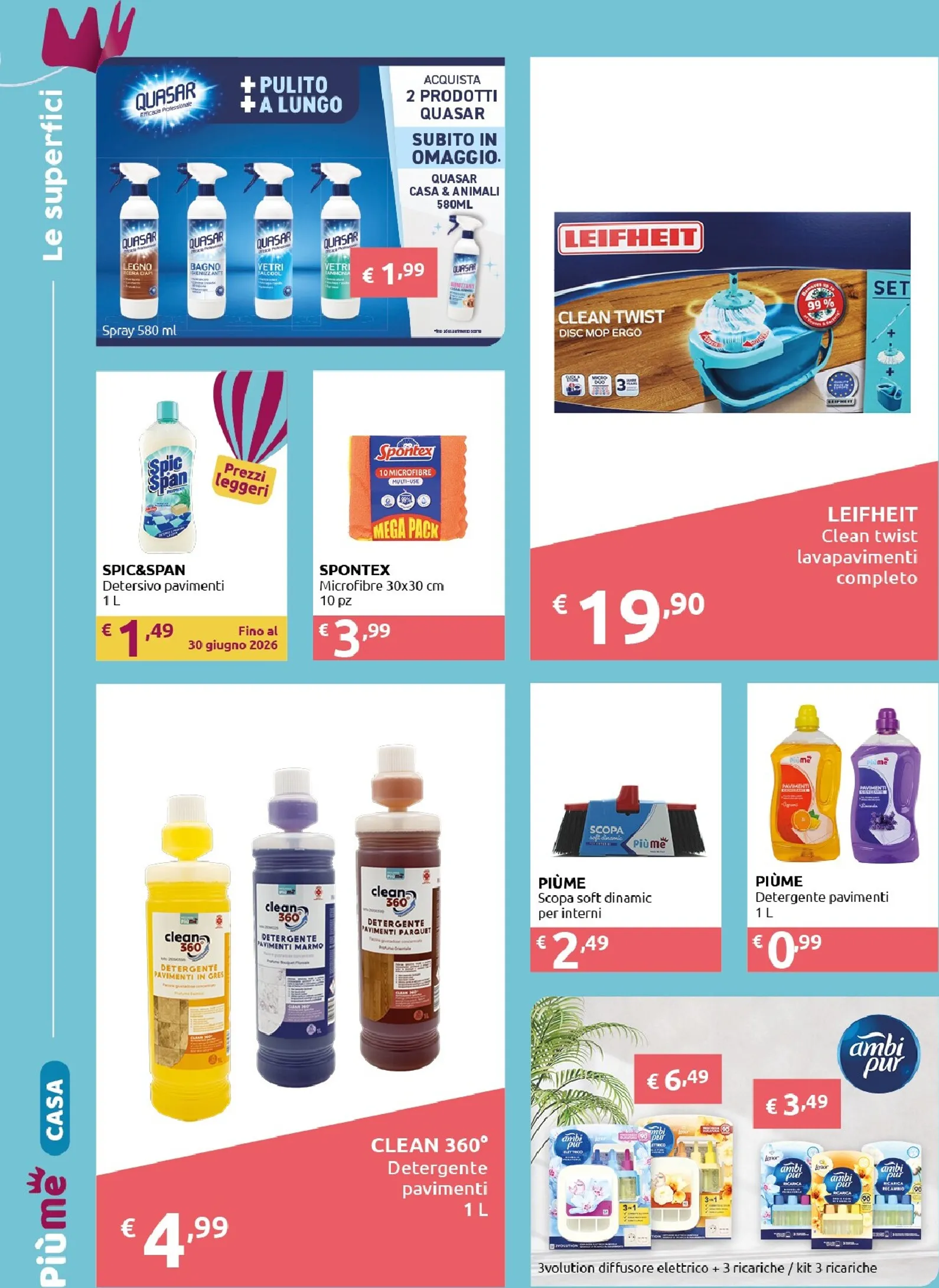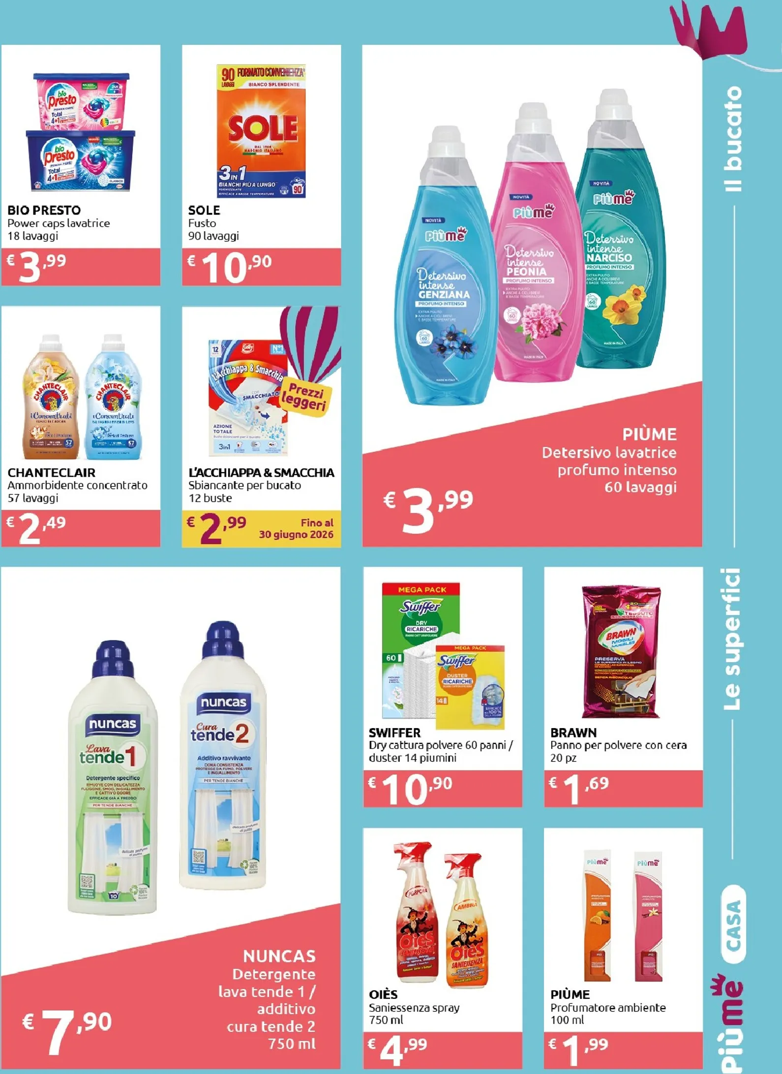 Le nuovo offerte continuano con prodotti come Swiffer Duster in mega pack a 10,90€ e la linea di detersivi profumati Piùme. Acquistando due prodotti Napisan, si riceve in omaggio uno zainetto. Per scoprire tutte queste offerte e pianificare la spesa, il Piume Volantino dal 20/04/2026 è lo strumento più utile. Non perdete le migliori occasioni, consultate ora il nuovo Piume Volantino per un risparmio garantito su tanti prodotti.