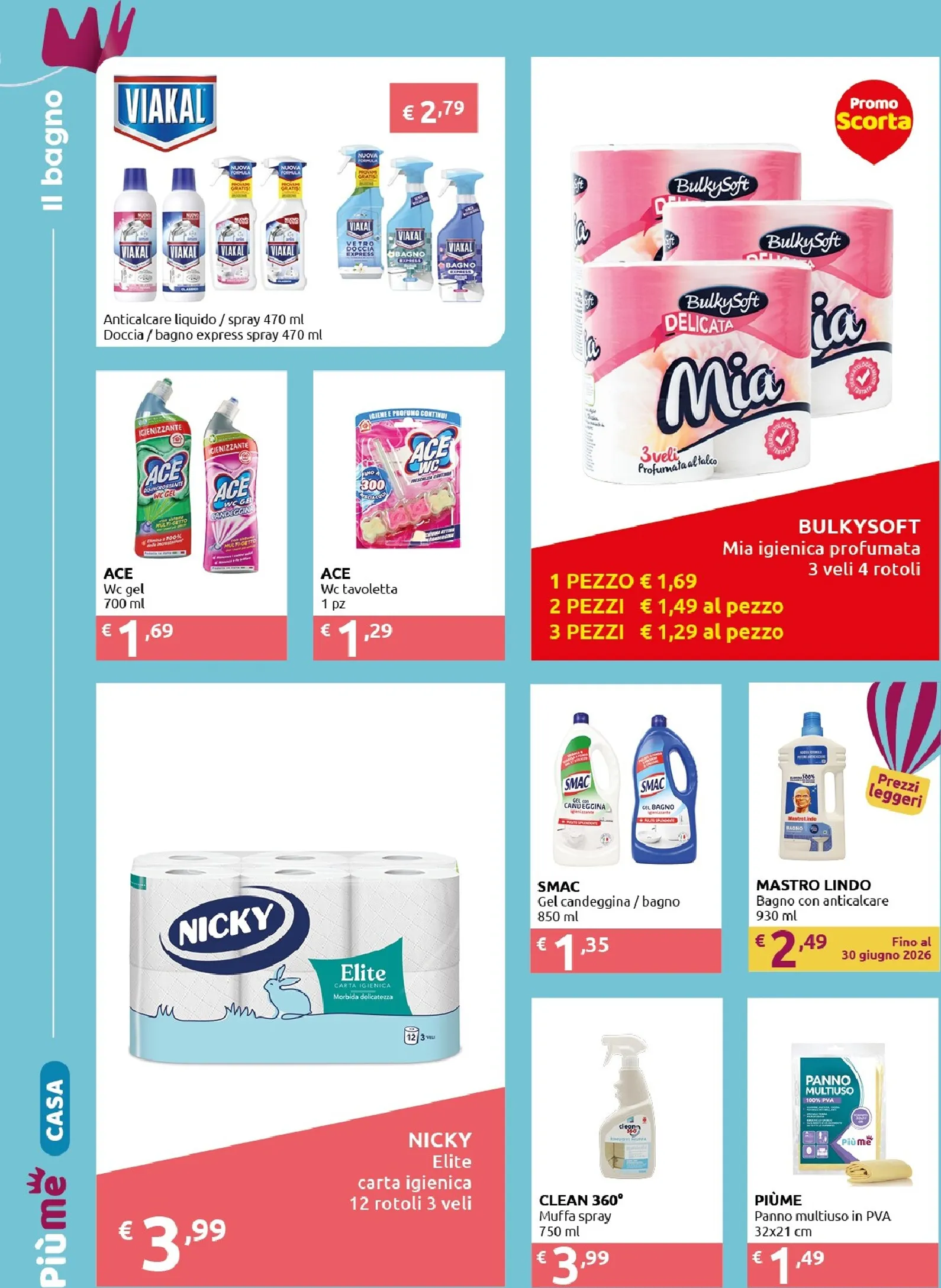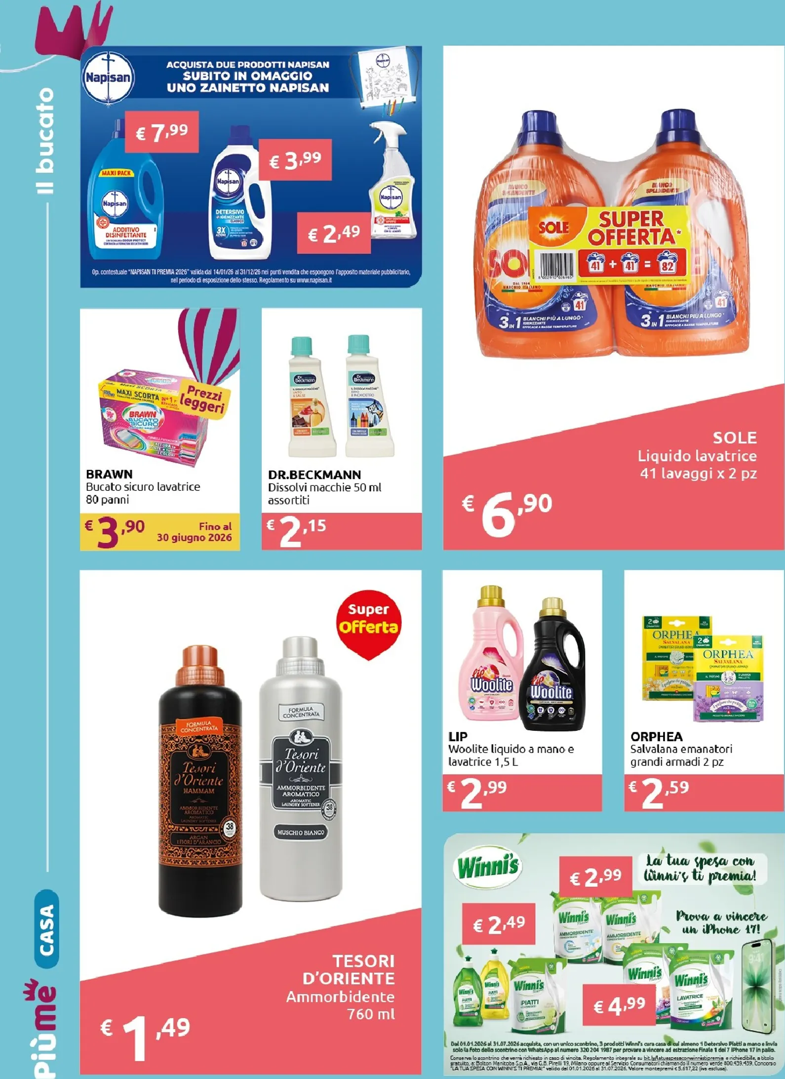 Il catalogo propone soluzioni per ogni esigenza di pulito. Per un bucato impeccabile, Sole offre il detersivo liquido in offerta bipacco (2×41 lavaggi) a 6,90€, mentre per i capi delicati c’è Woolite a 2,39€. Le fragranze di Tesori d’Oriente avvolgono la biancheria con l’ammorbidente a 1,49€. Con questo nuovo volantino, la pulizia è garantita a prezzi vantaggiosi, con soluzioni efficaci per ogni ambiente.