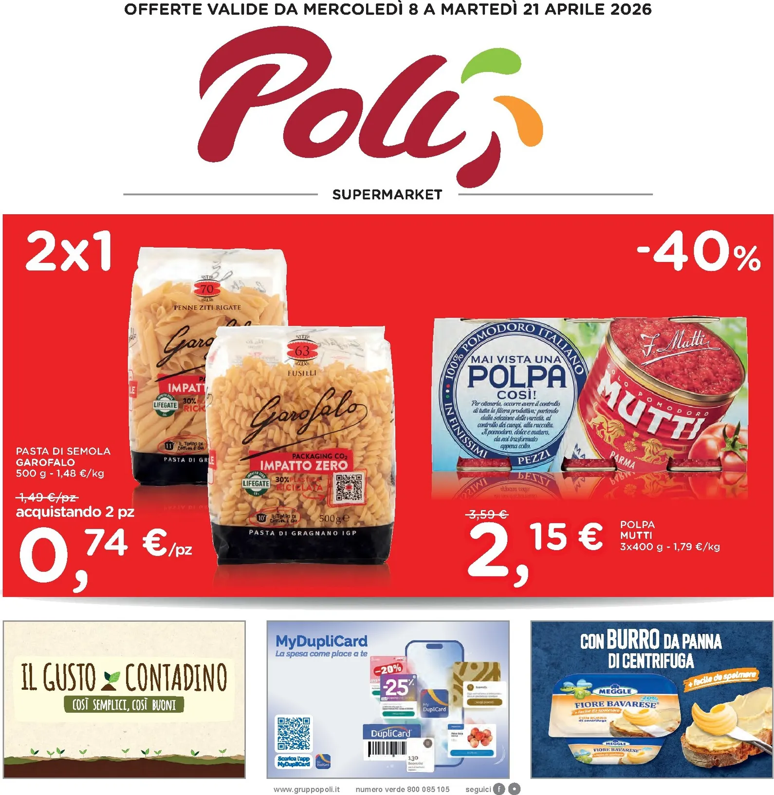 Poli lancia nuovo offerte eccezionali, valide dall’8 al 21 aprile. In copertina spiccano offerte come la pasta Garofalo 2×1, che permette di fare scorta a prezzo dimezzato, e la polpa Mutti scontata del 40%, ideale per sughi saporiti. Queste occasioni sono un’ottima opportunità per rinnovare la dispensa con prodotti di qualità; approfittare di Poli Volantino dal 08/04/2026 è il modo migliore per iniziare a risparmiare sulla spesa settimanale.