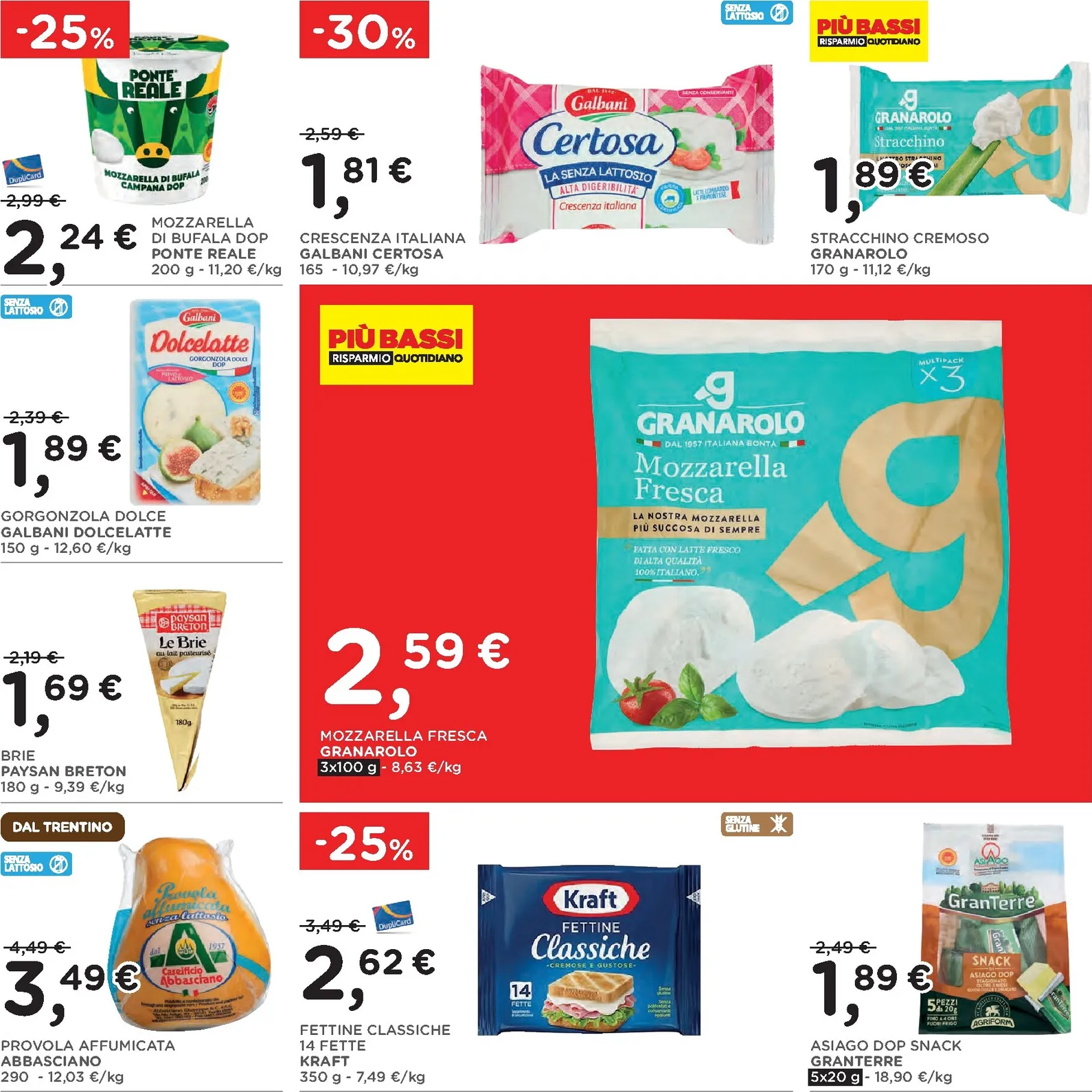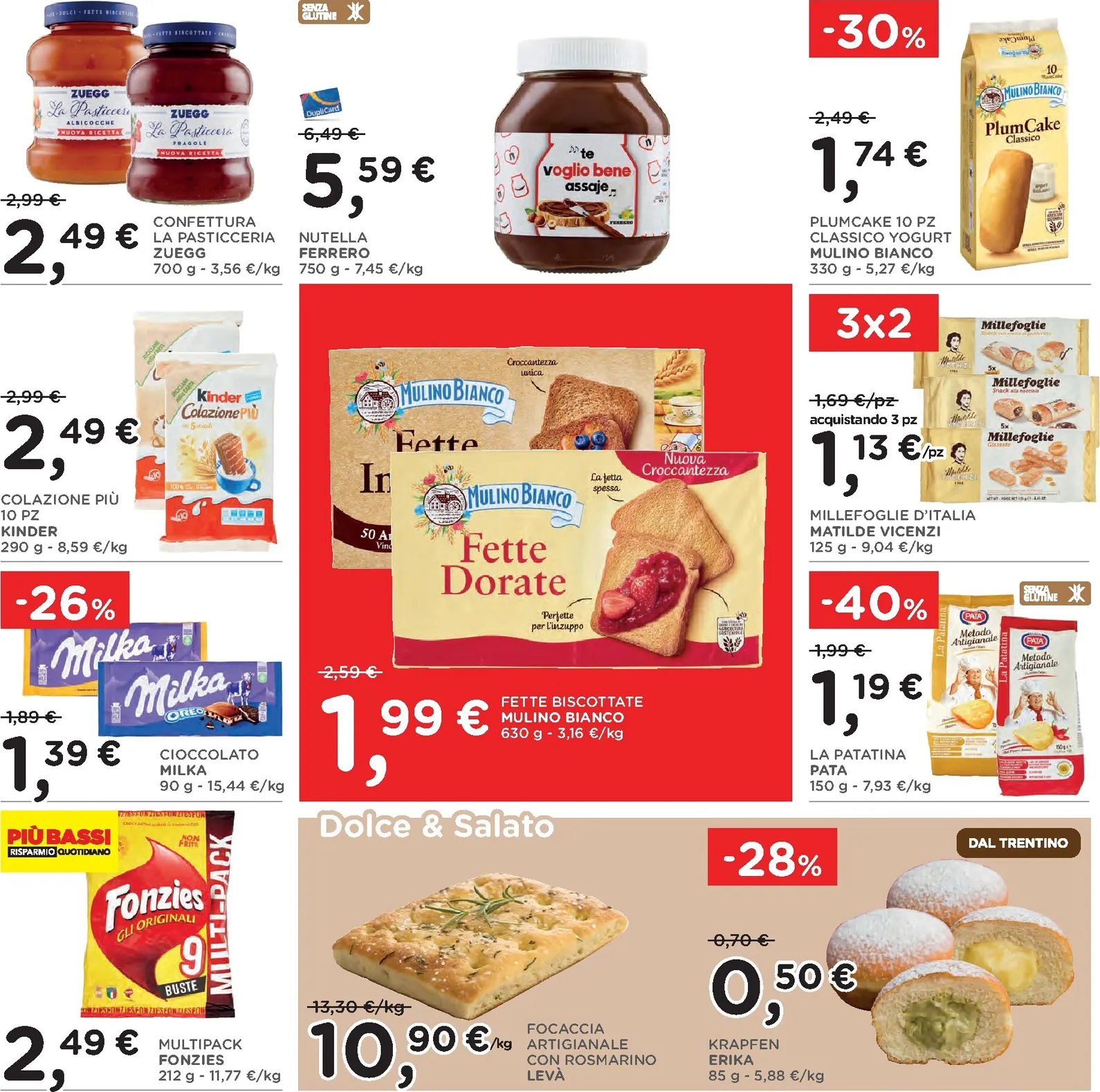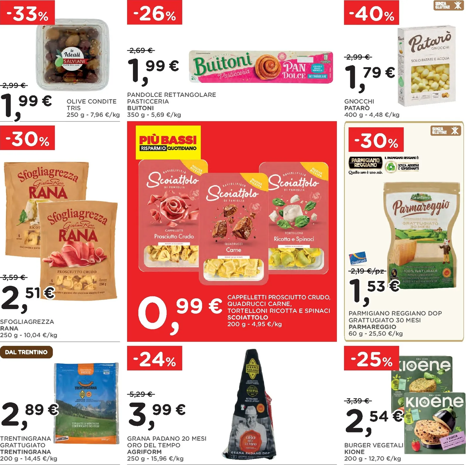 La scelta di prodotti tipici continua con sconti significativi su salumi e formaggi. Il prosciutto Praga Recla e il lardo Adamello Val Rendena sono proposti a prezzi vantaggiosi. Non mancano le offerte sui latticini, come la Tosella fresca del Gruppo Formaggi del Trentino con il 25% di sconto e il burro di montagna Sciaves ridotto del 30%. Ogni nuovo acquisto diventa un’occasione per assaporare la qualità artigianale a un costo conveniente.