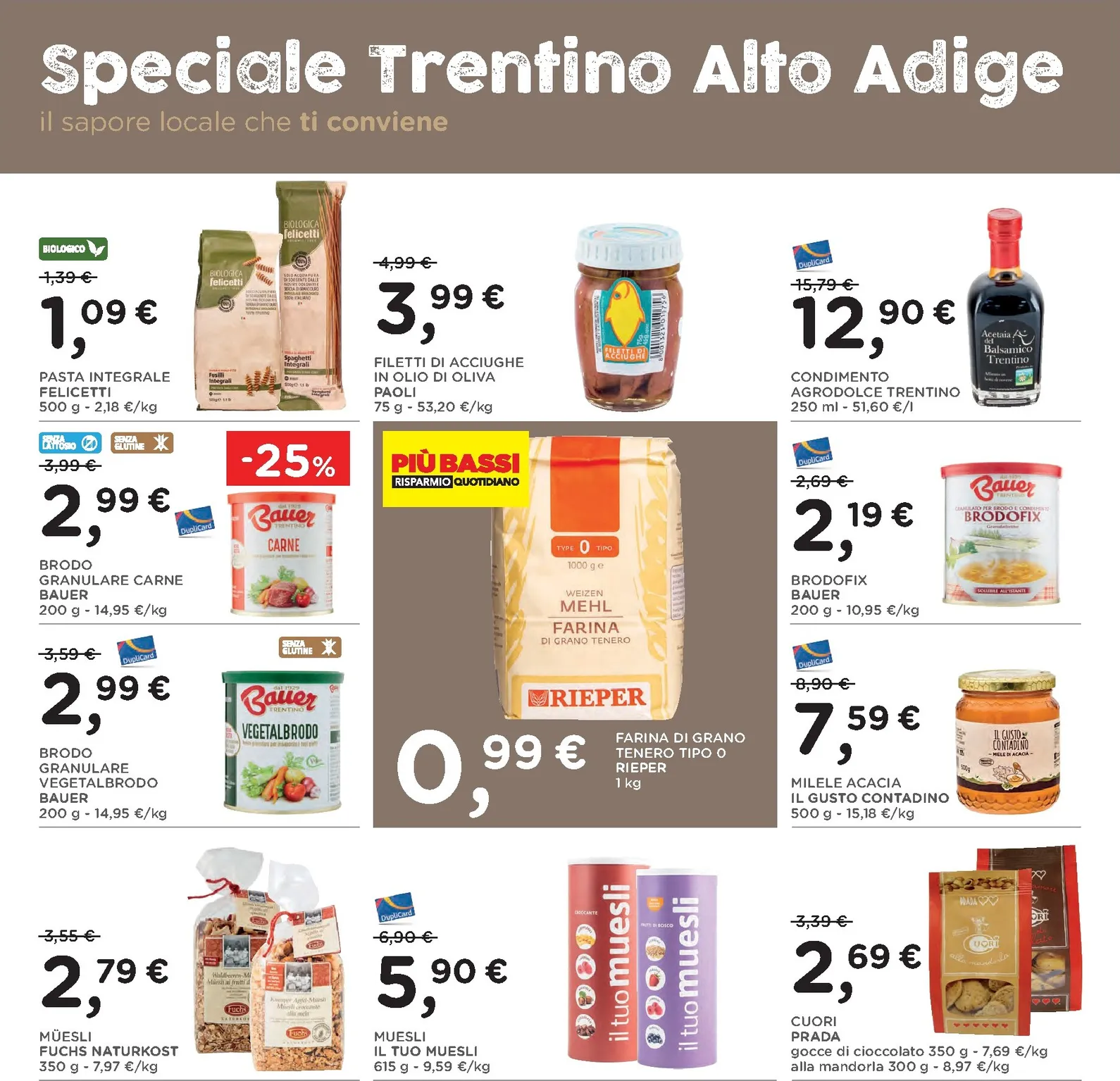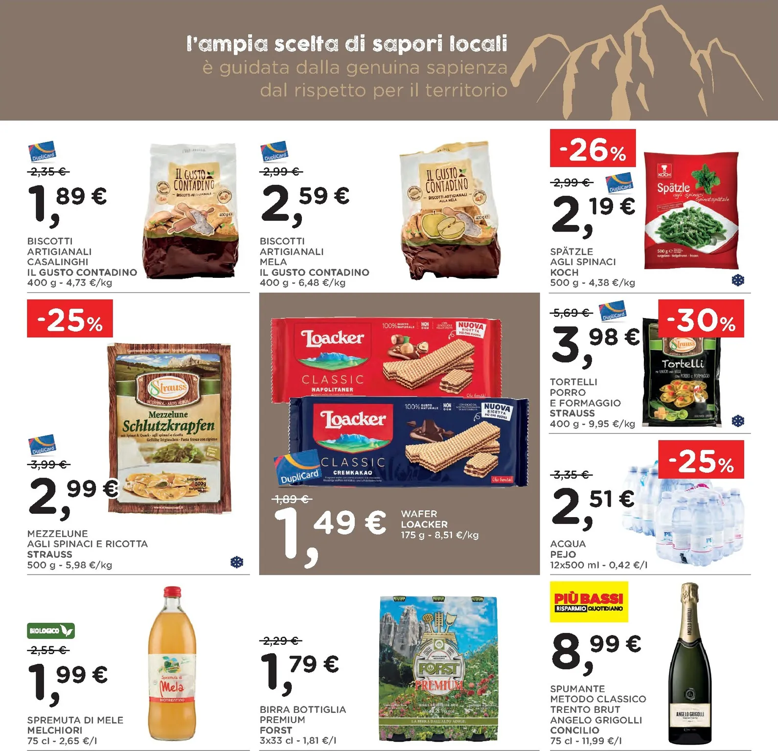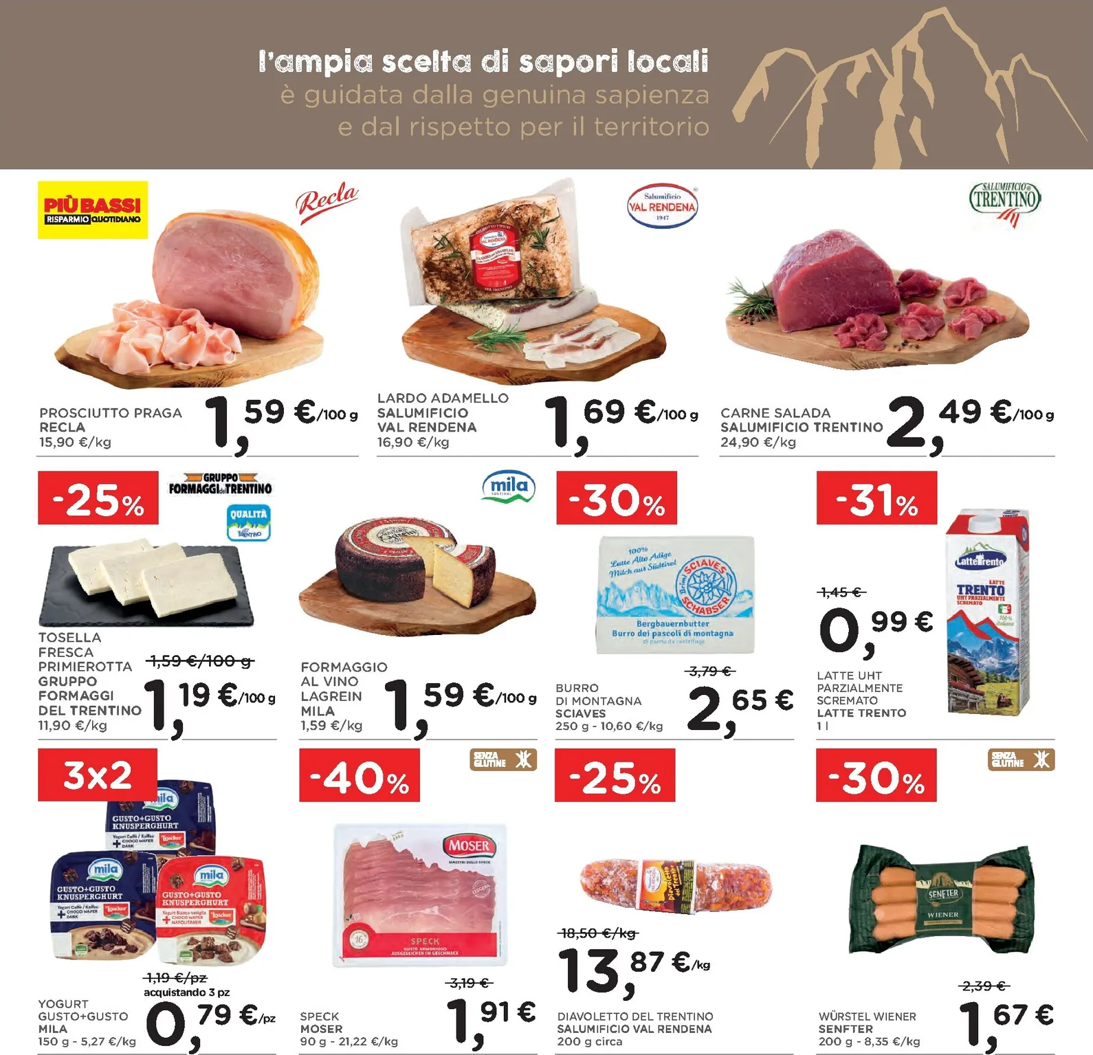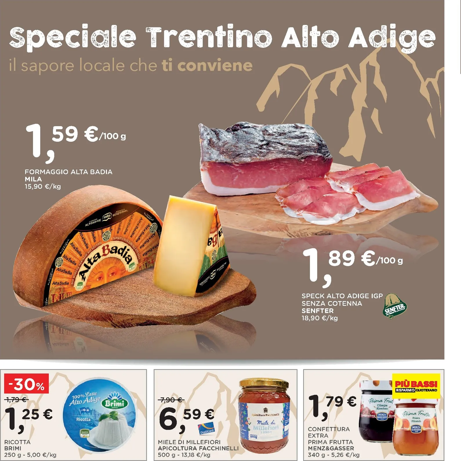 All’interno del volantino si scopre lo “Speciale Trentino Alto Adige”, un omaggio ai sapori locali. Tra le proposte più allettanti troviamo il formaggio Alta Badia Mila e lo Speck Alto Adige IGP Senfter, due eccellenze che portano in tavola il gusto autentico della montagna. Questa selezione è pensata per chi ama i prodotti genuini e desidera esplorare le tradizioni culinarie regionali, trovando sempre nuove ispirazioni per i propri piatti.