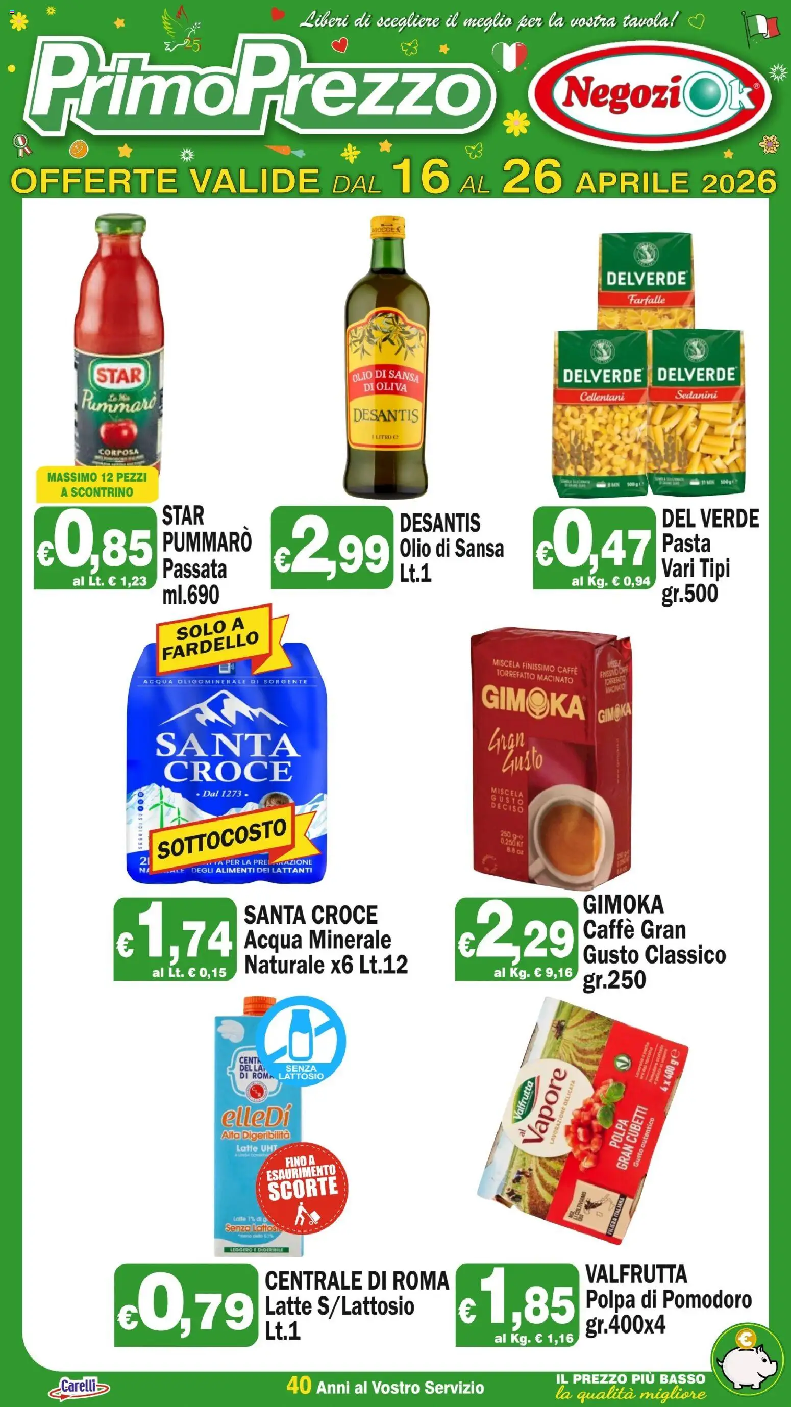 Il nuovo volantino Primo Prezzo è ricco di offerte valide dal 16 al 26 Aprile 2026. È l’occasione giusta per risparmiare, iniziando dai prodotti per la cucina. Troviamo la Passata Pummarò Star a 0,85€, l’Olio di Sansa Desantis a 2,99€ e la pasta Del Verde a 0,47€. Per non perdere queste nuovo offerte, il Primo Prezzo Volantino dal 16/04/2026 è lo strumento ideale da consultare per organizzare i propri acquisti e massimizzare la convenienza.