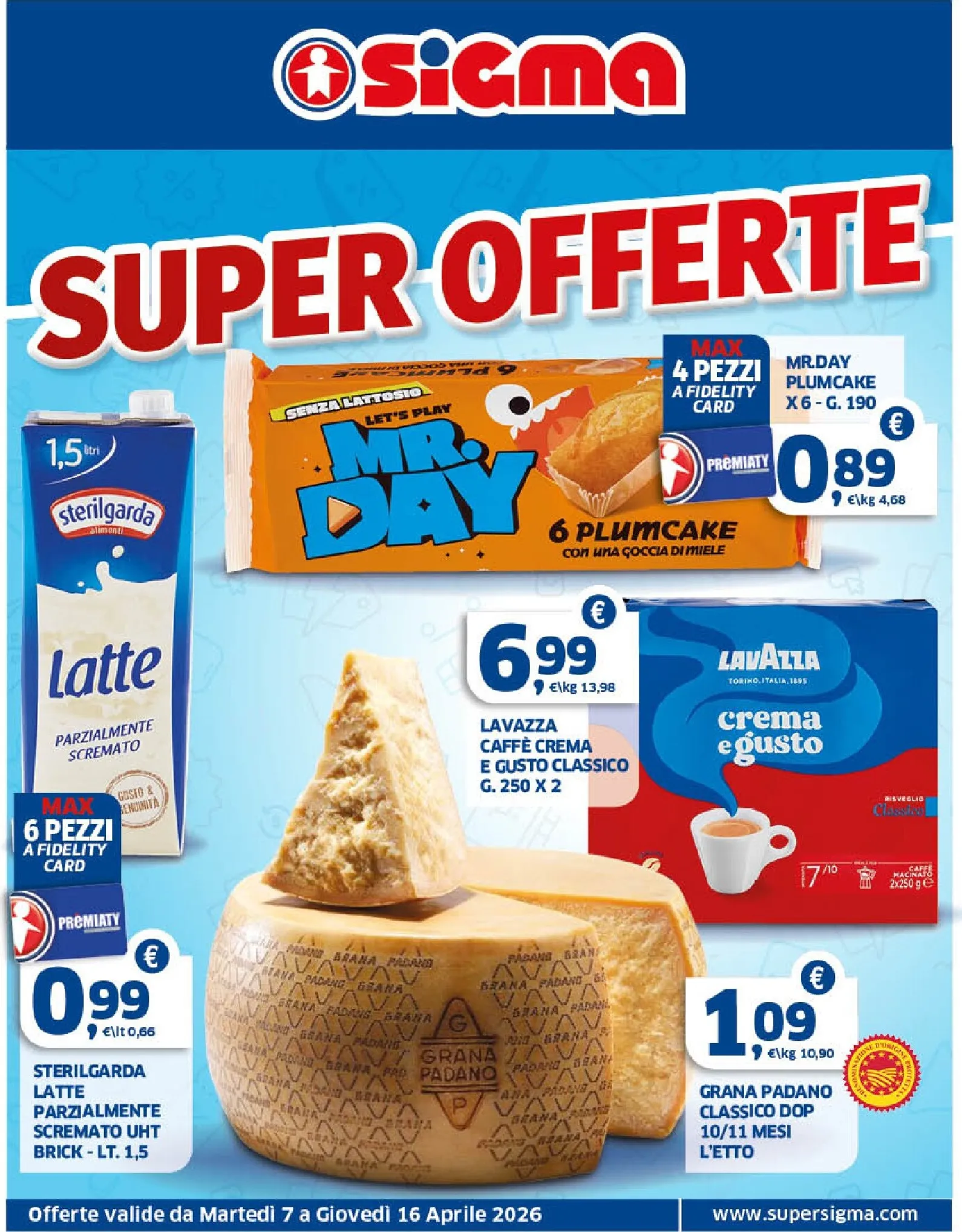 Il nuovo volantino Sigma, valido dal 7 al 16 Aprile 2026, è ricco di “Super Offerte”. Questa anteprima presenta occasioni come il latte Sterilgarda da 1,5 litri a 0,99€ e i golosi Plumcake Mr. Day a 0,89€. Approfittare di questo Sigma Volantino dal 07/04/2026 permette di unire qualità e convenienza. Imperdibile anche il Grana Padano DOP, un classico della nostra tradizione, proposto a soli 1,09€ l’etto.