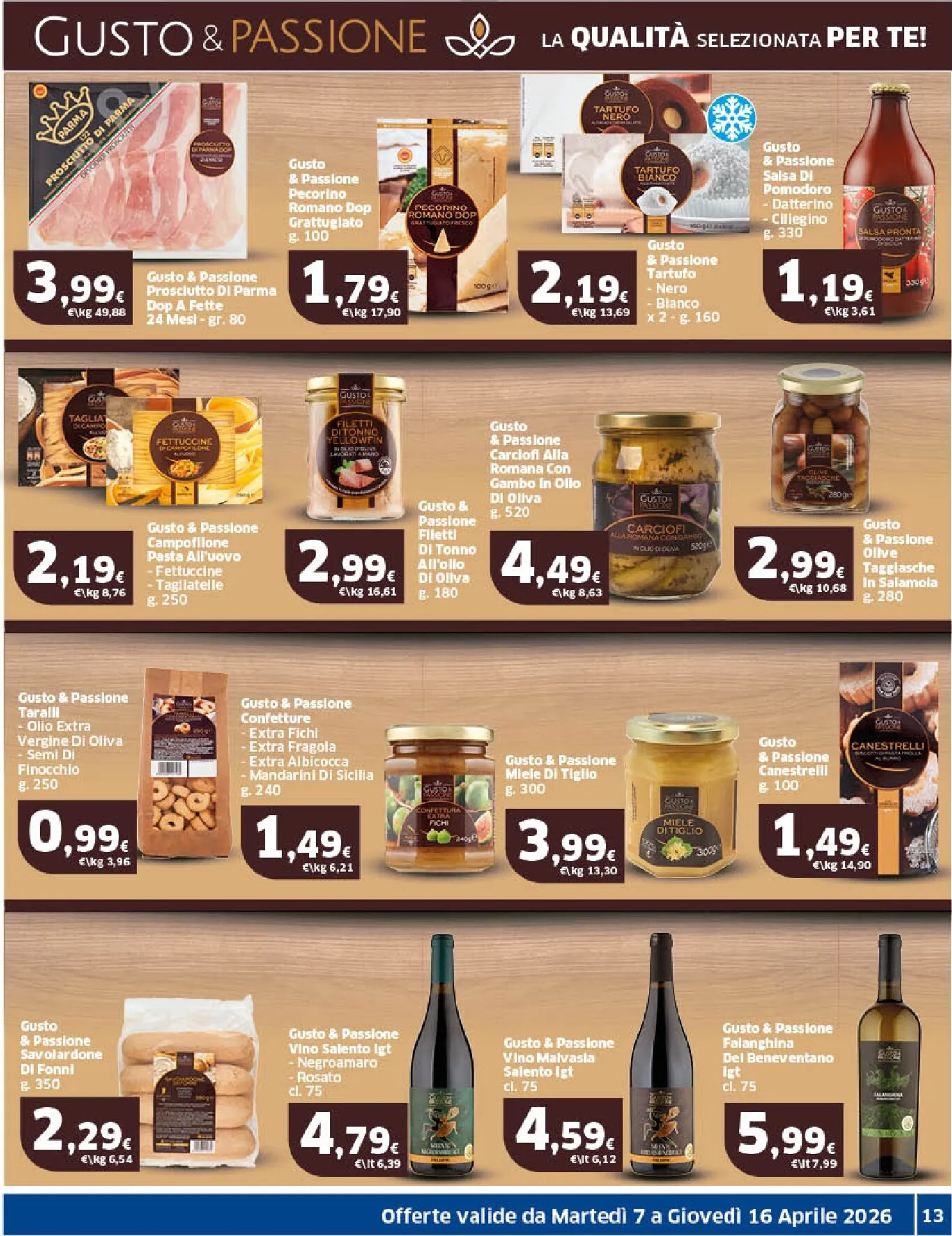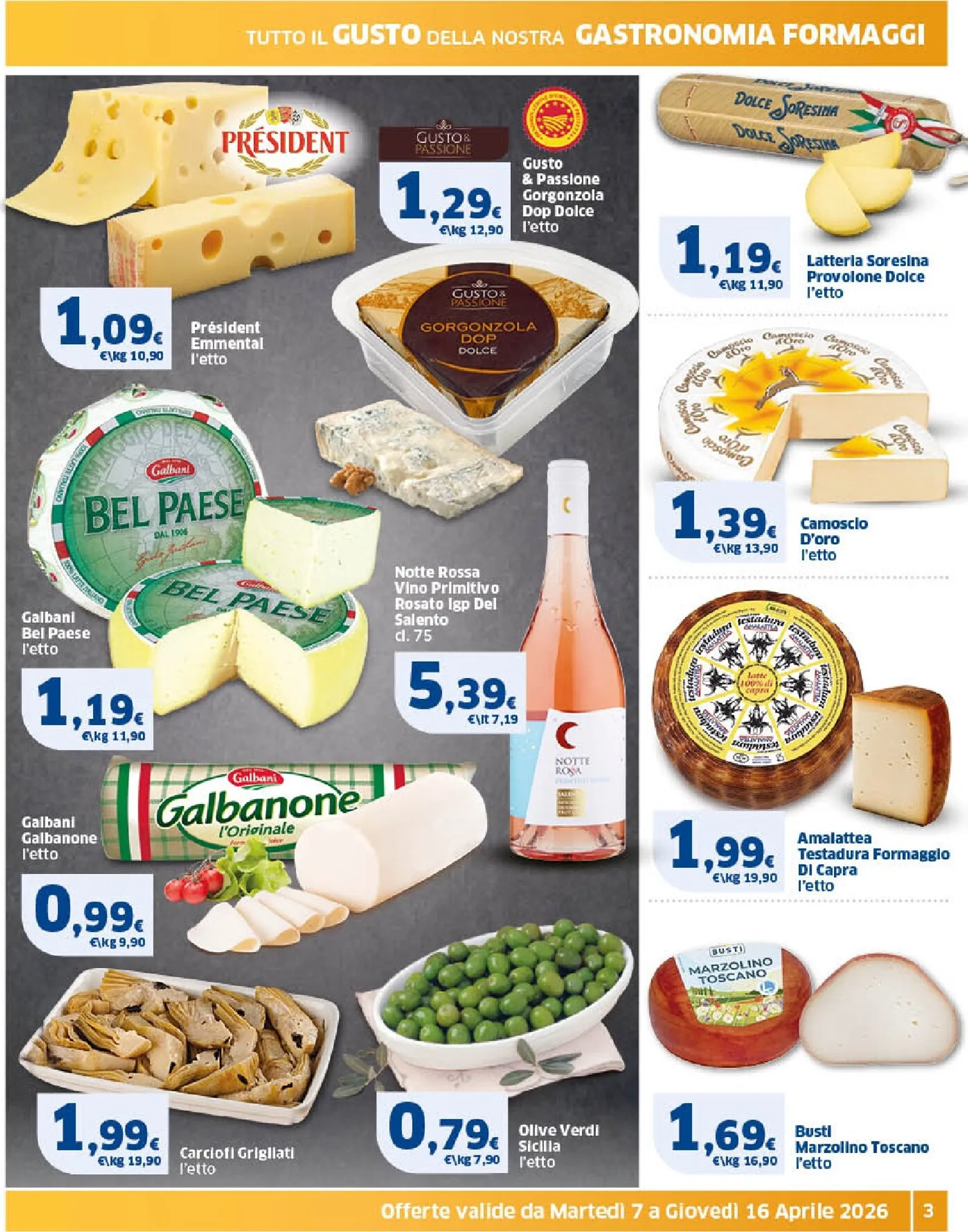 La gastronomia è un trionfo di sapori con salumi e formaggi di alta qualità. Troviamo il Prosciutto Cotto Parmacotto a 1,29€ l’etto e la Mortadella Felsineo con pistacchi a soli 0,99€ l’etto. Tra i formaggi, spiccano il Gorgonzola DOP Gusto & Passione a 1,29€ l’etto e il cremoso Bel Paese Galbani a 1,19€ l’etto. Una selezione pensata per soddisfare ogni palato e arricchire la tavola con gusto.