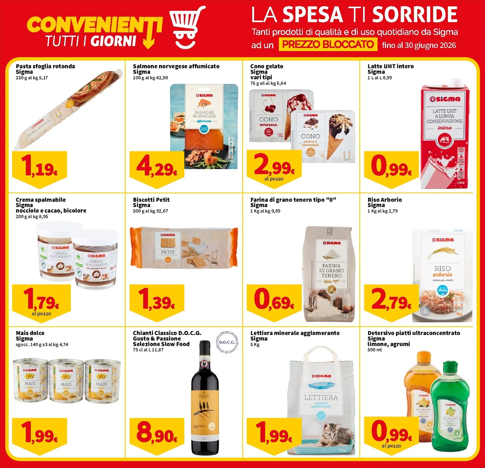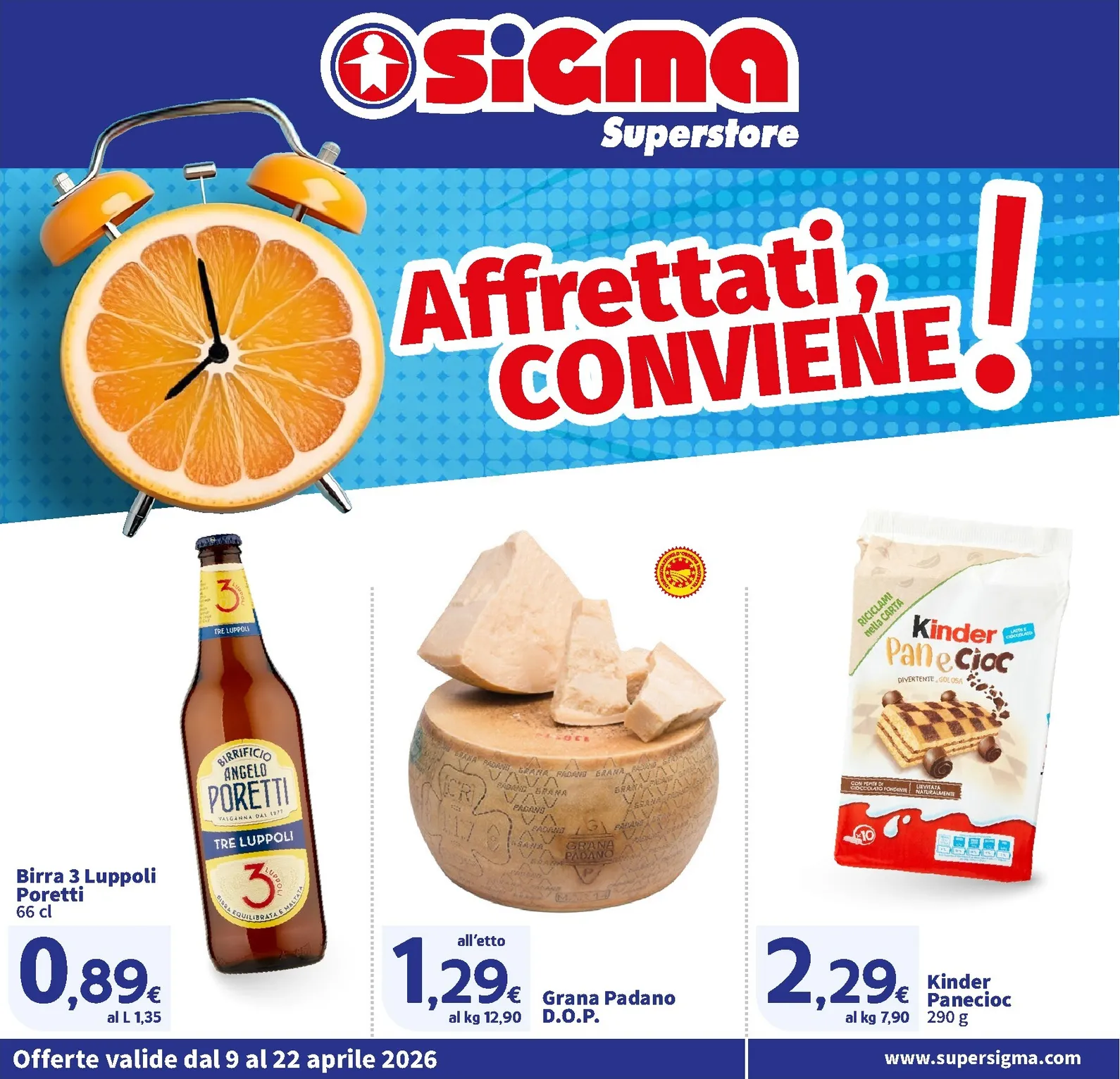 Con il motto “Affrettati, conviene!”, il nuovo volantino Sigma è valido dal 9 al 22 aprile 2026. Questo catalogo presenta subito occasioni imperdibili come il Grana Padano D.O.P. a 1,29€ l’etto, la Birra Poretti 3 Luppoli a 0,89€ e i Kinder PaneCioc a 2,29€. Per una spesa intelligente, consultare il Sigma Volantino dal 09/04/2026 è la strategia vincente per non perdere nessuna promozione.