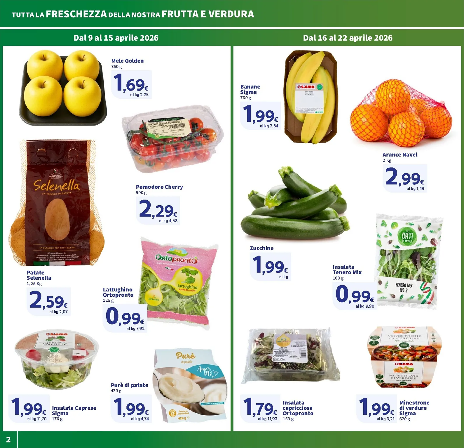 Il reparto ortofrutta si rinnova con sconti settimanali. Dal 9 al 15 aprile, approfittate delle Mele Golden a 1,69€ e delle Patate Selenella a 2,59€. Dal 16 al 22 aprile, invece, potrete acquistare Arance Navel (2 kg) a 2,99€ e Zucchine a 1,99€ al kg. Per un pasto veloce, sono disponibili anche l’Insalata Caprese Sigma a 1,99€ e il Lattughino Ortopronto a soli 0,99€.