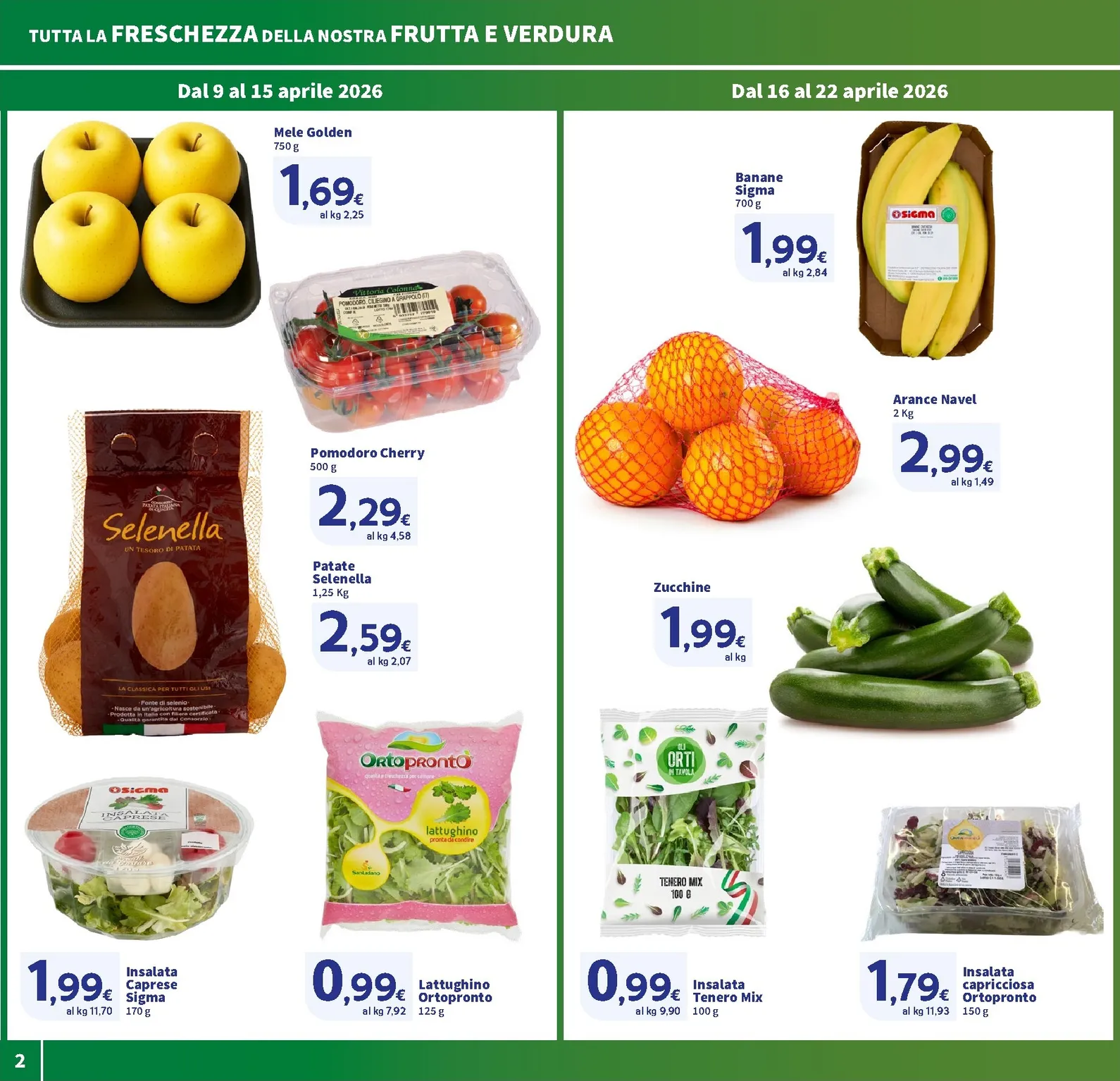 Nel reparto ortofrutta la freschezza ha offerte settimanali. Fino al 15 aprile ci sono le Mele Golden a 1,69€ e il Pomodoro Cherry a 2,29€. Dal 16 aprile, la convenienza si rinnova con le Banane Sigma a 1,99€ e le Arance Navel a 2,99€ per la rete da 2 kg. Questo nuovo approccio garantisce prodotti di stagione a prezzi vantaggiosi, incluse le pratiche insalate pronte come la Lattughino a 0,99€.