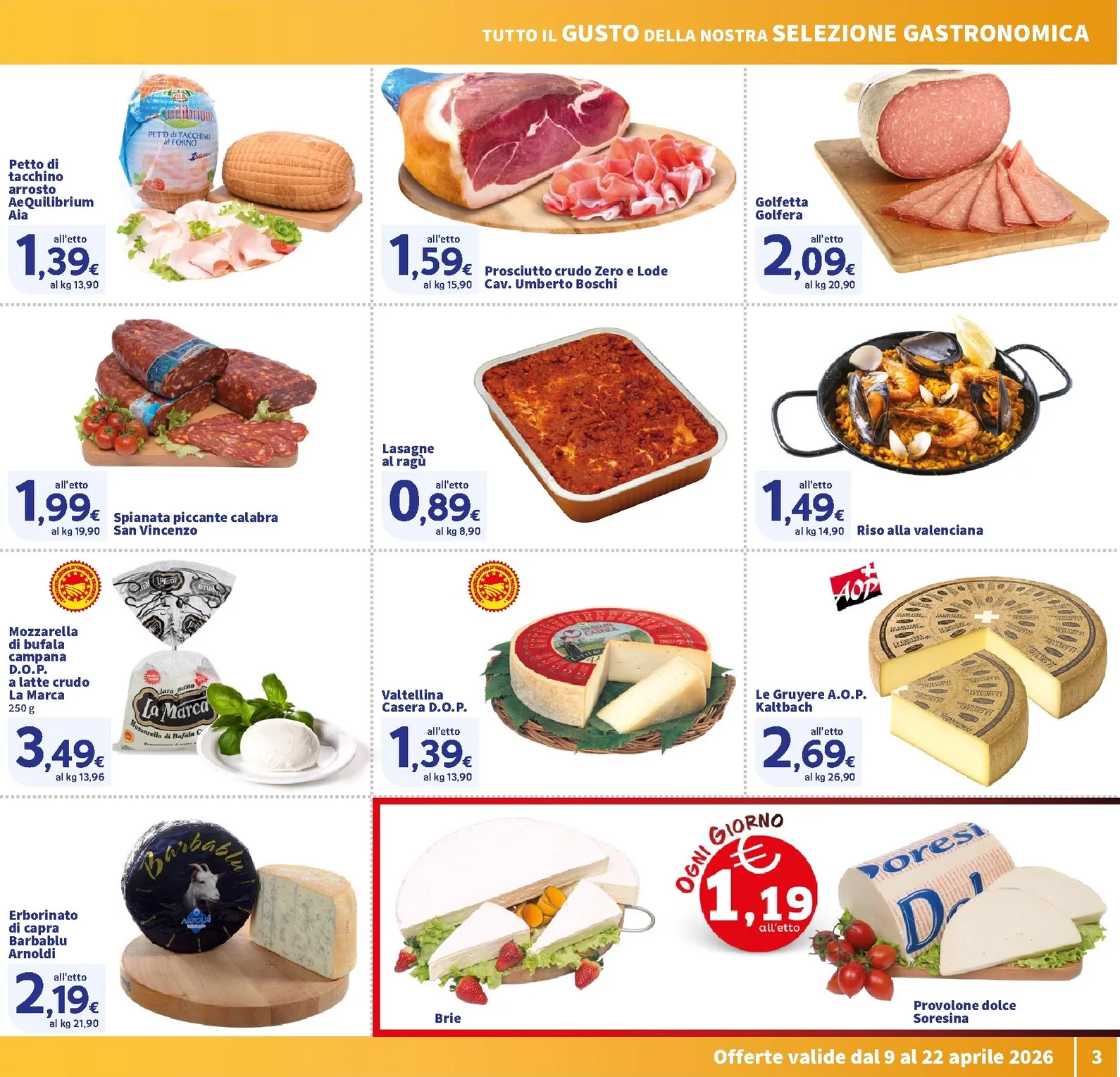 Il banco gastronomia offre un viaggio tra i sapori della tradizione. Il Prosciutto Crudo Zero e Lode a 1,59€ all’etto e la Spianata piccante calabra a 1,99€ sono perfetti per antipasti e taglieri. Tra i formaggi, spiccano la Mozzarella di bufala campana D.O.P. a 3,49€ e il Valtellina Casera D.O.P. a 1,39€ all’etto. Per un pasto veloce, le Lasagne al ragù a 0,89€ all’etto sono una soluzione deliziosa e conveniente.