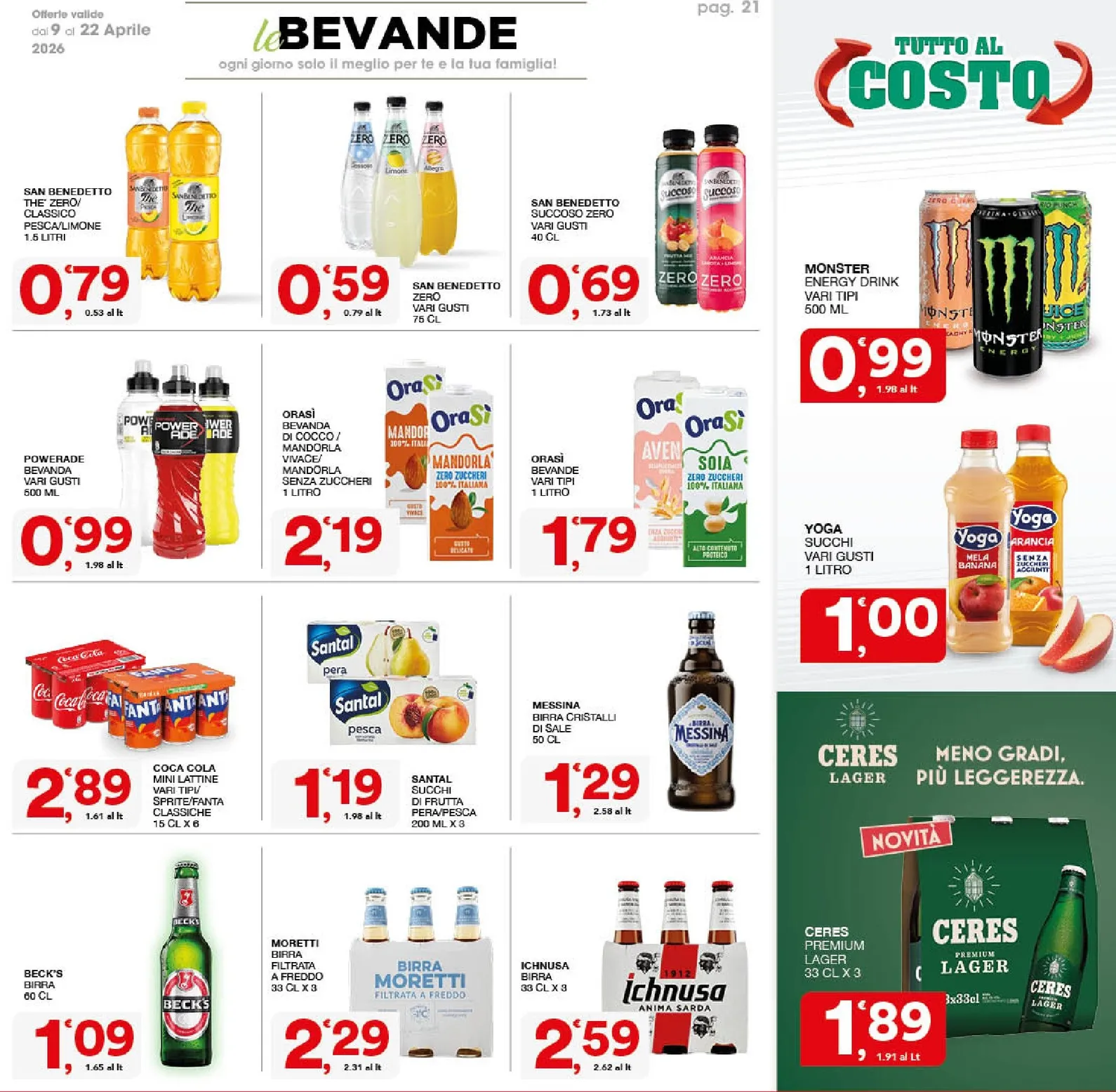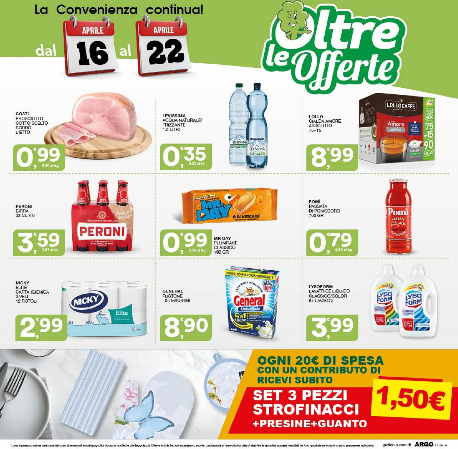 La convenienza prosegue nella sezione “Oltre le Offerte”, valida dal 16 al 22 Aprile. Qui troviamo ulteriori sconti, come il Prosciutto Cotto Comis a 9,90€ al kg e l’acqua Levissima a soli 0,35€. Per un aperitivo, la birra Peroni è a 3,59€. Il catalogo pensa anche alla casa, con il detersivo Lysoform a 3,99€ e la carta igienica Nicky a 2,99€. Queste offerte mirate completano la spesa con ulteriori risparmi.